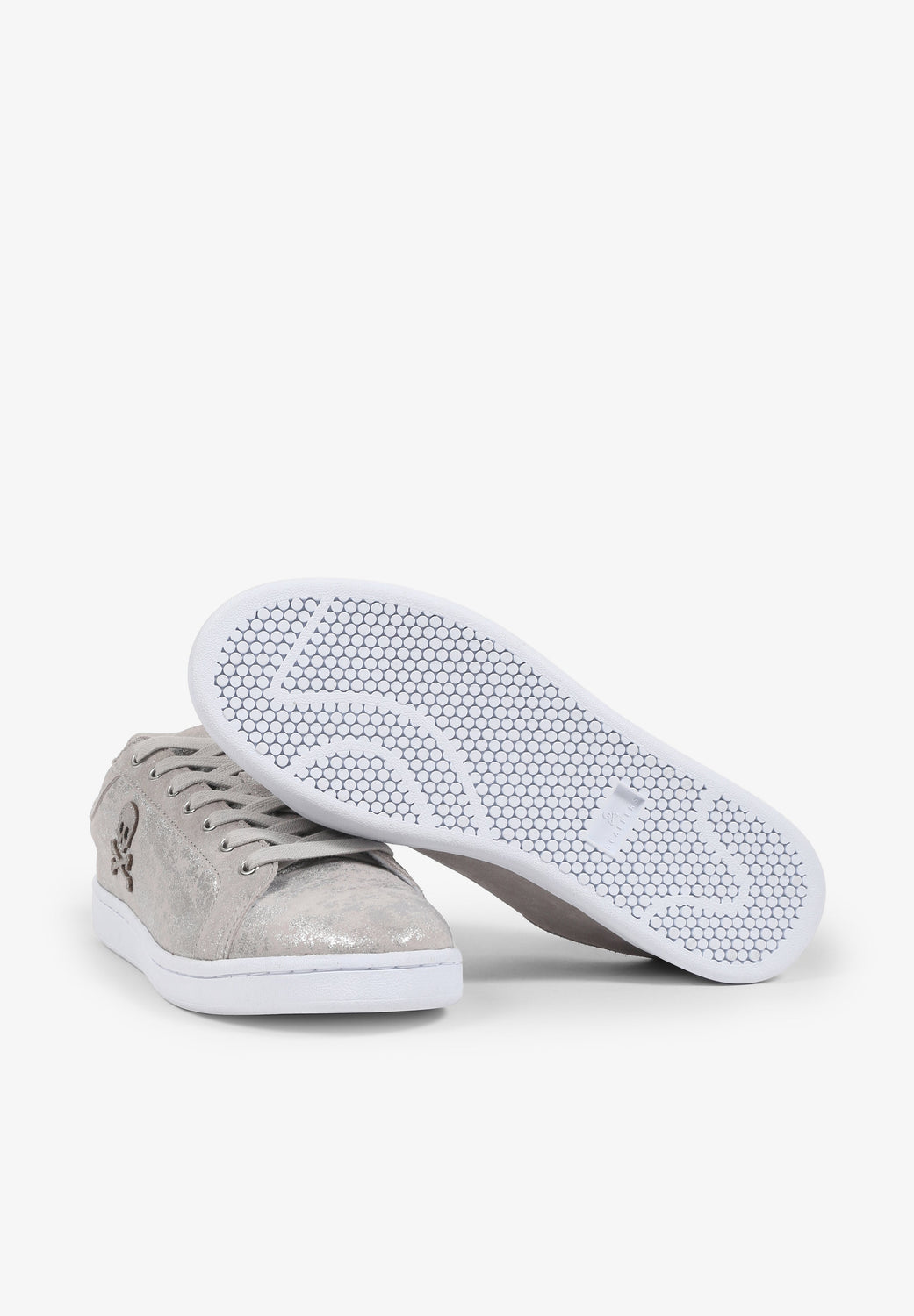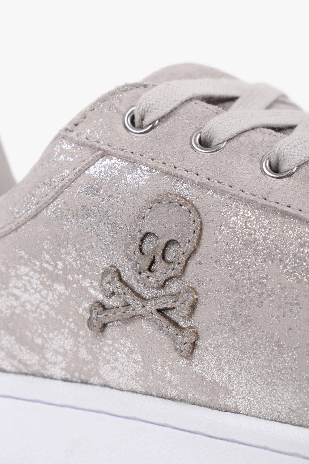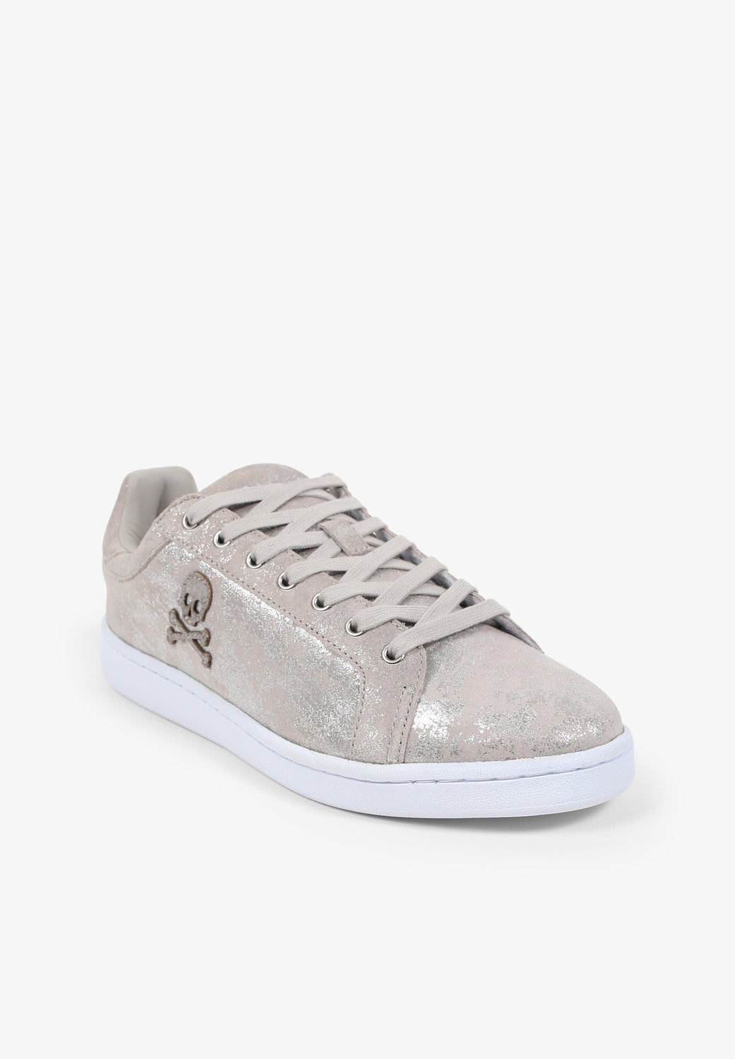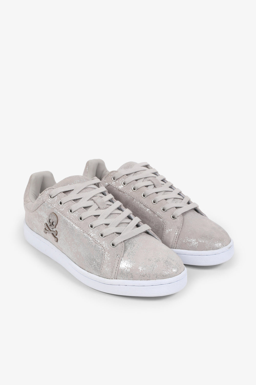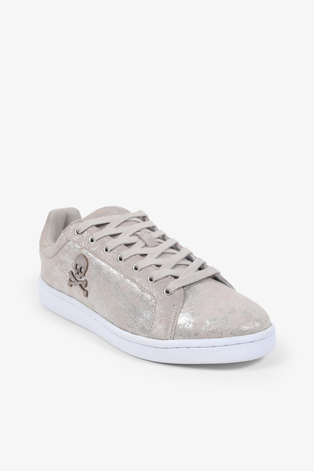 Sneakers bajas metalizadas confeccionadas en piel de serraje. Cierre con cordones a tono, suela de goma y detalle de calavera lateral.