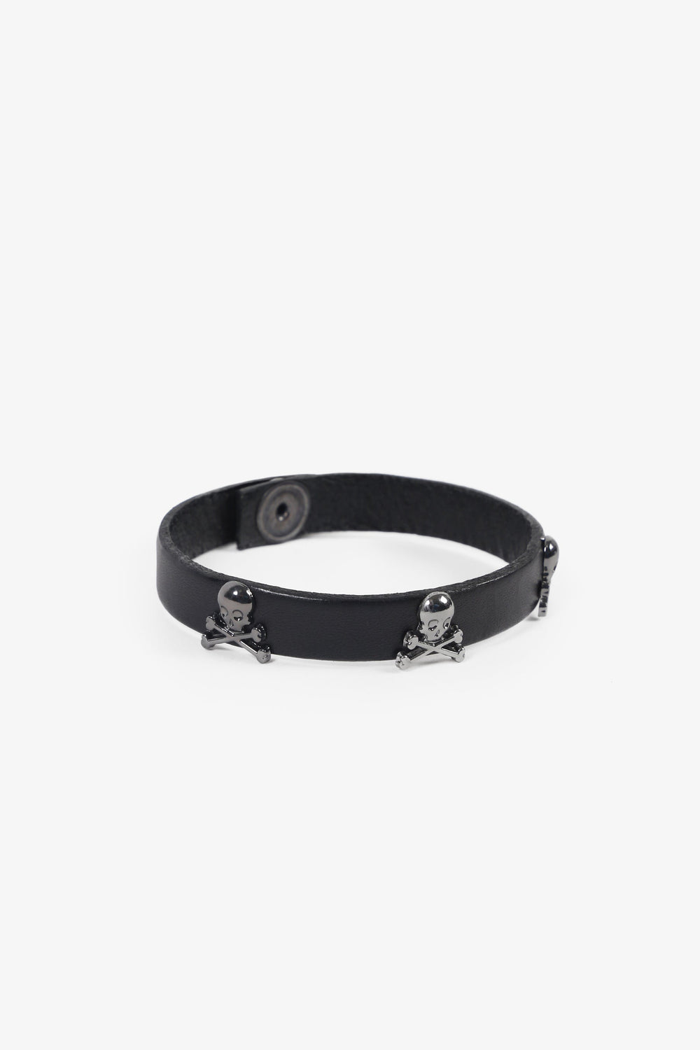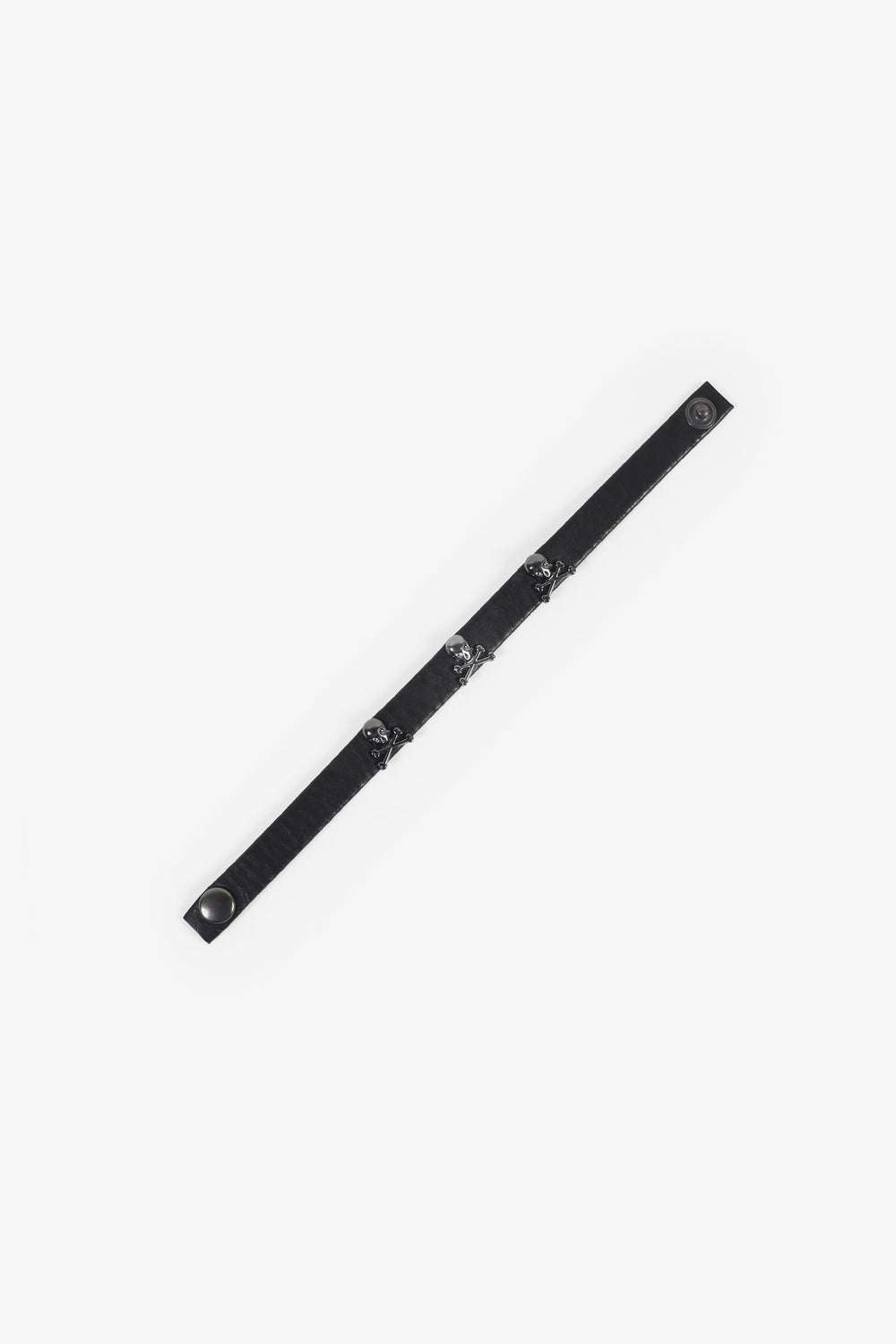 Pulsera confeccionada en piel con detalle de calaveras. Cierre con snap.
