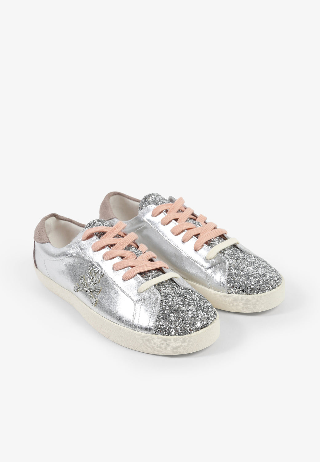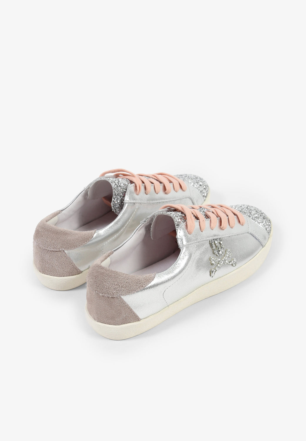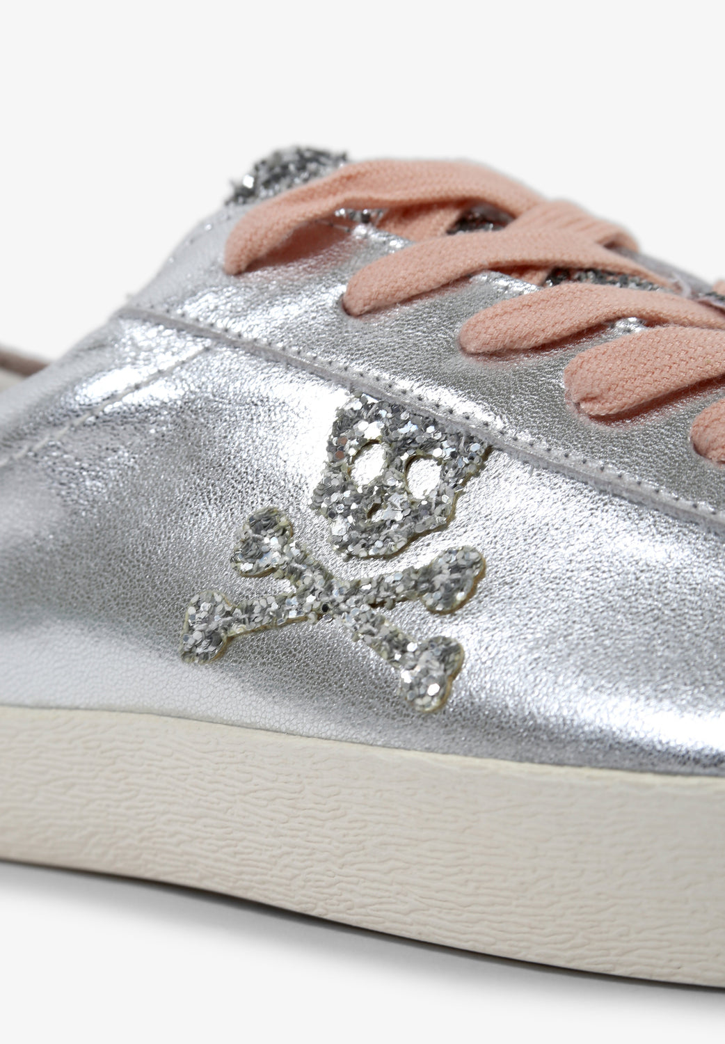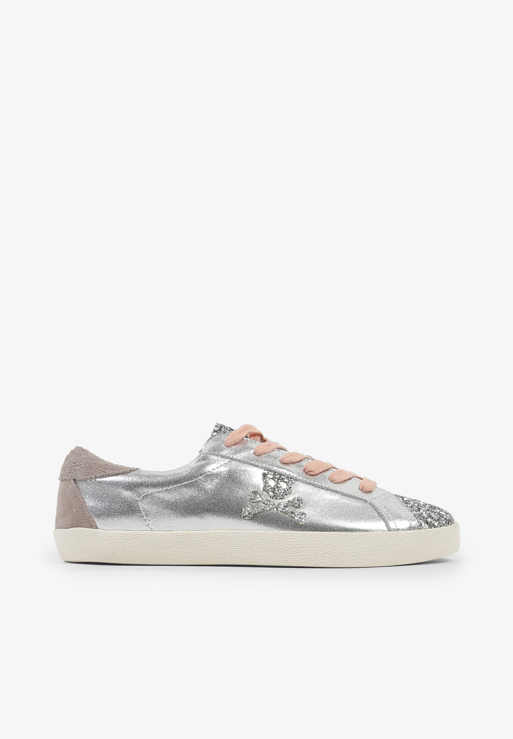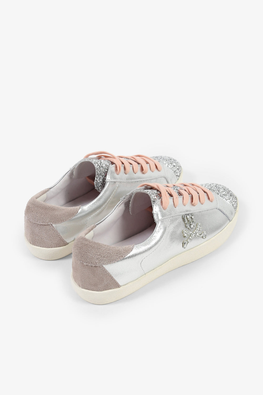 Zapatillas metalizadas confeccionadas en piel. Cierre con cordones a contraste, puntera y lengüeta de purpurina y suela de goma. Detalle de talón a contraste y calavera de purpurina.
