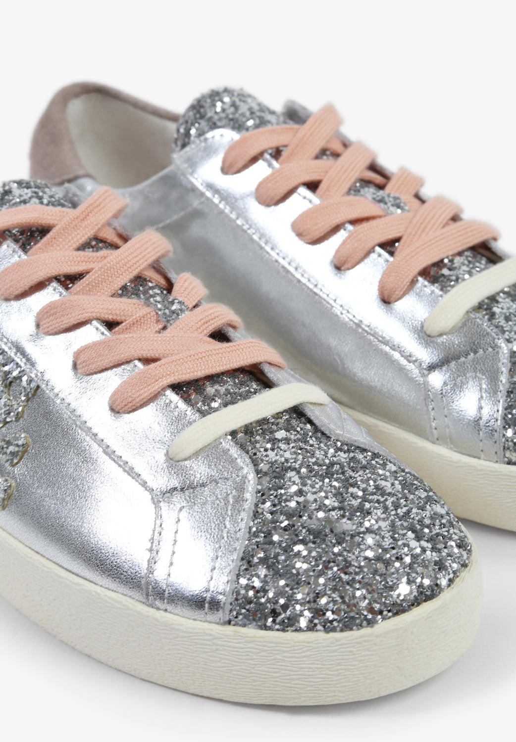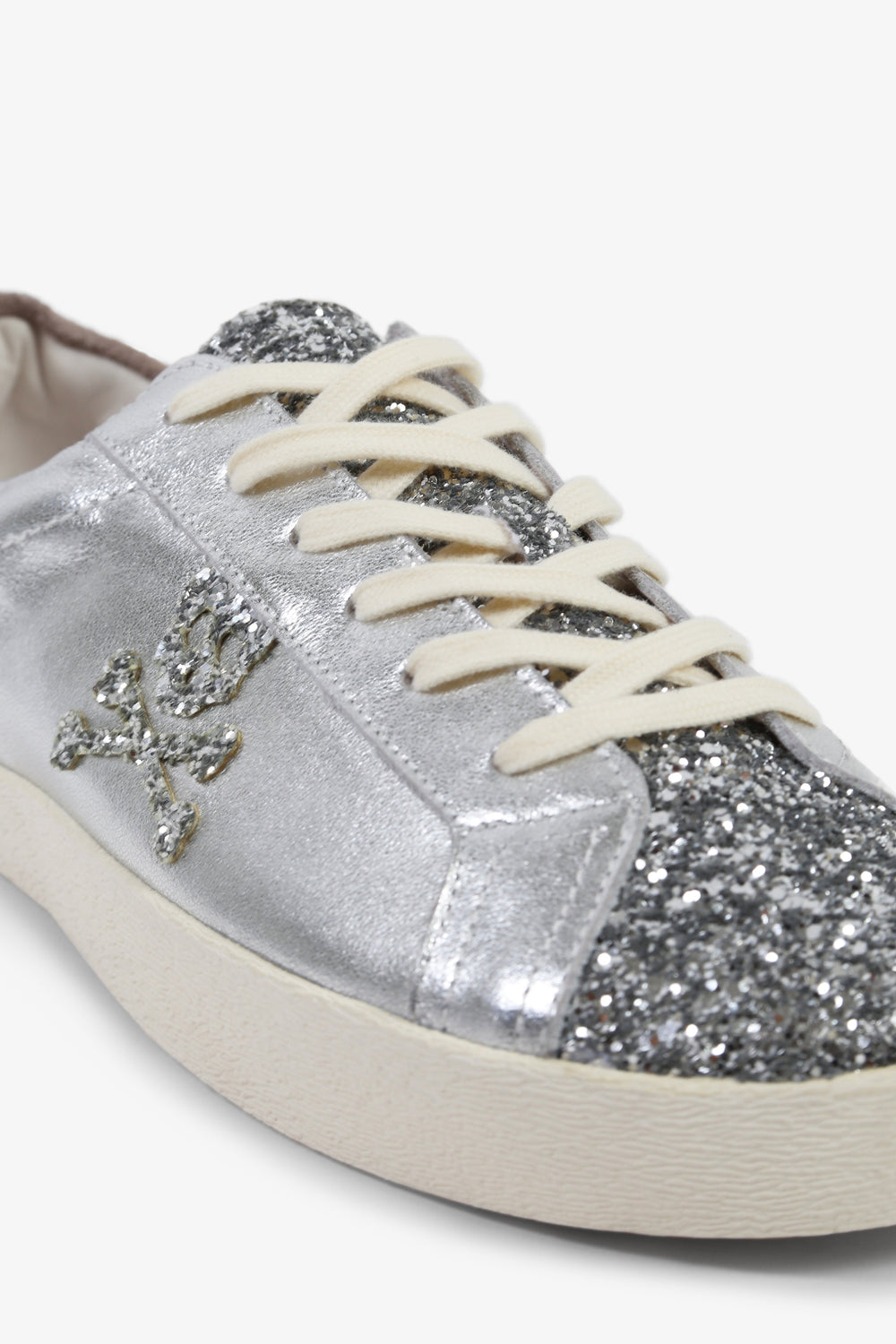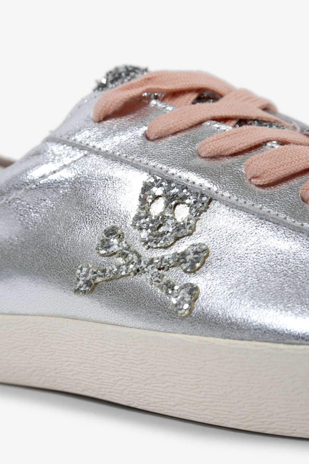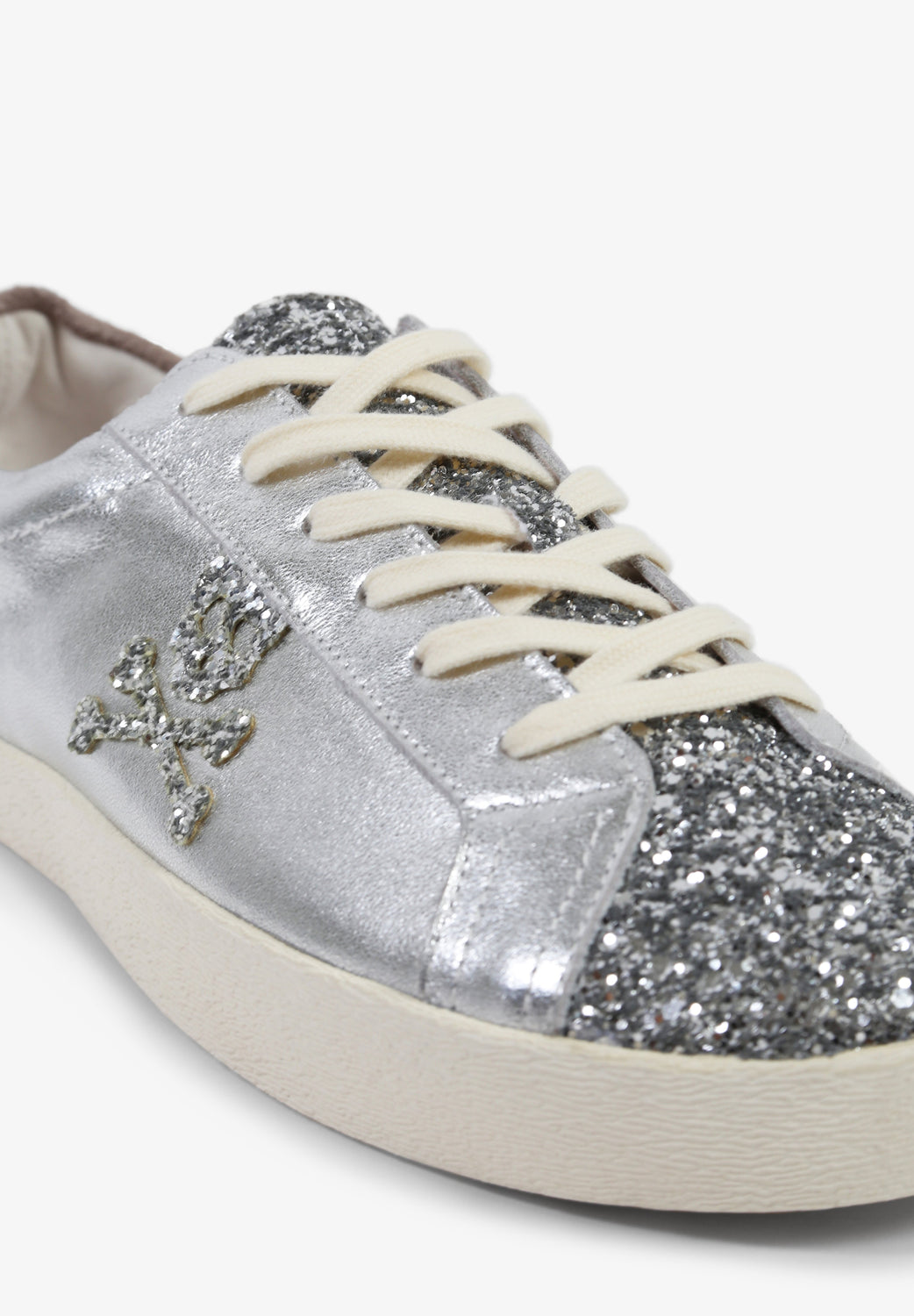 Zapatillas metalizadas confeccionadas en piel. Cierre con cordones a contraste, puntera y lengüeta de purpurina y suela de goma. Detalle de talón a contraste y calavera de purpurina.