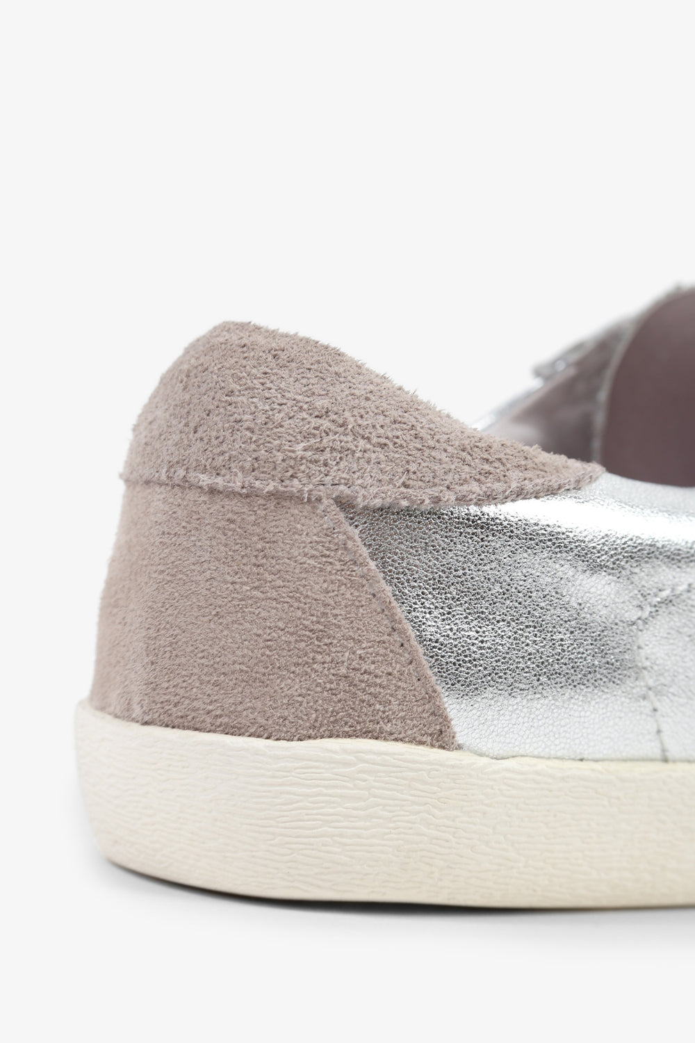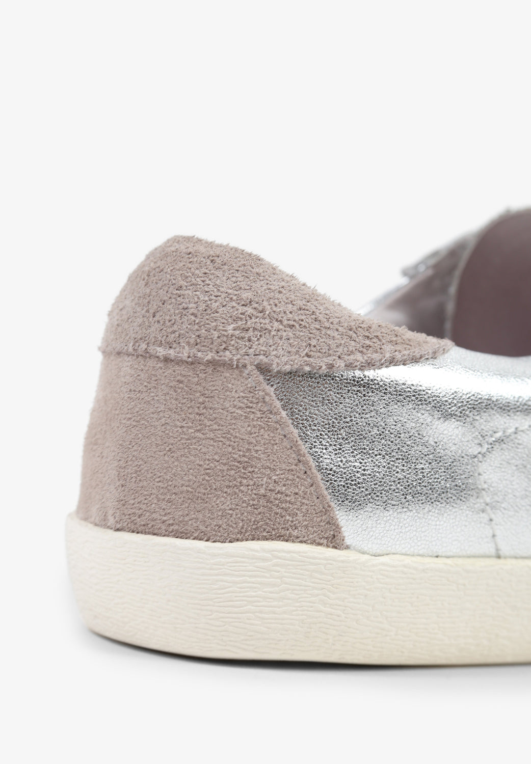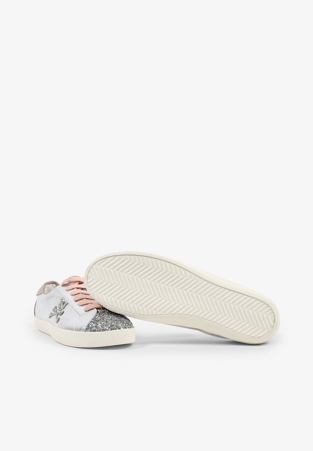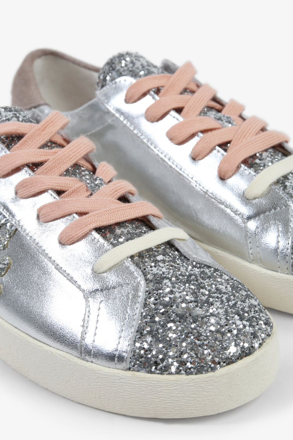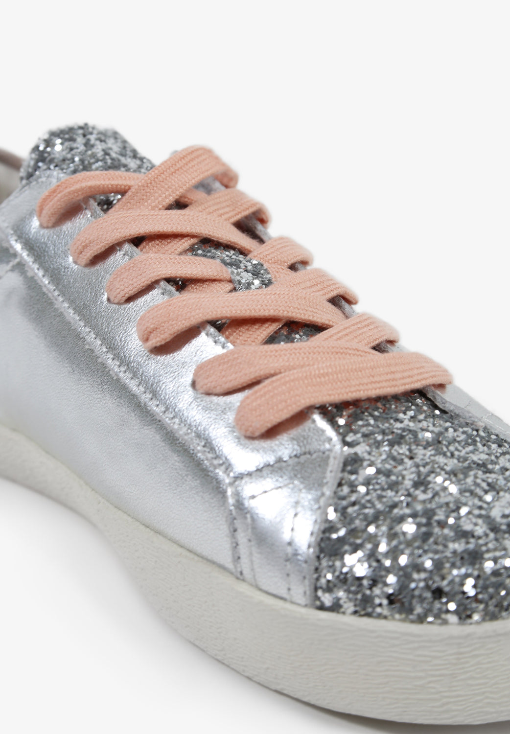 Zapatillas metalizadas confeccionadas en piel. Cierre con cordones a contraste, puntera y lengüeta de purpurina y suela de goma. Detalle de talón a contraste y calavera de purpurina.