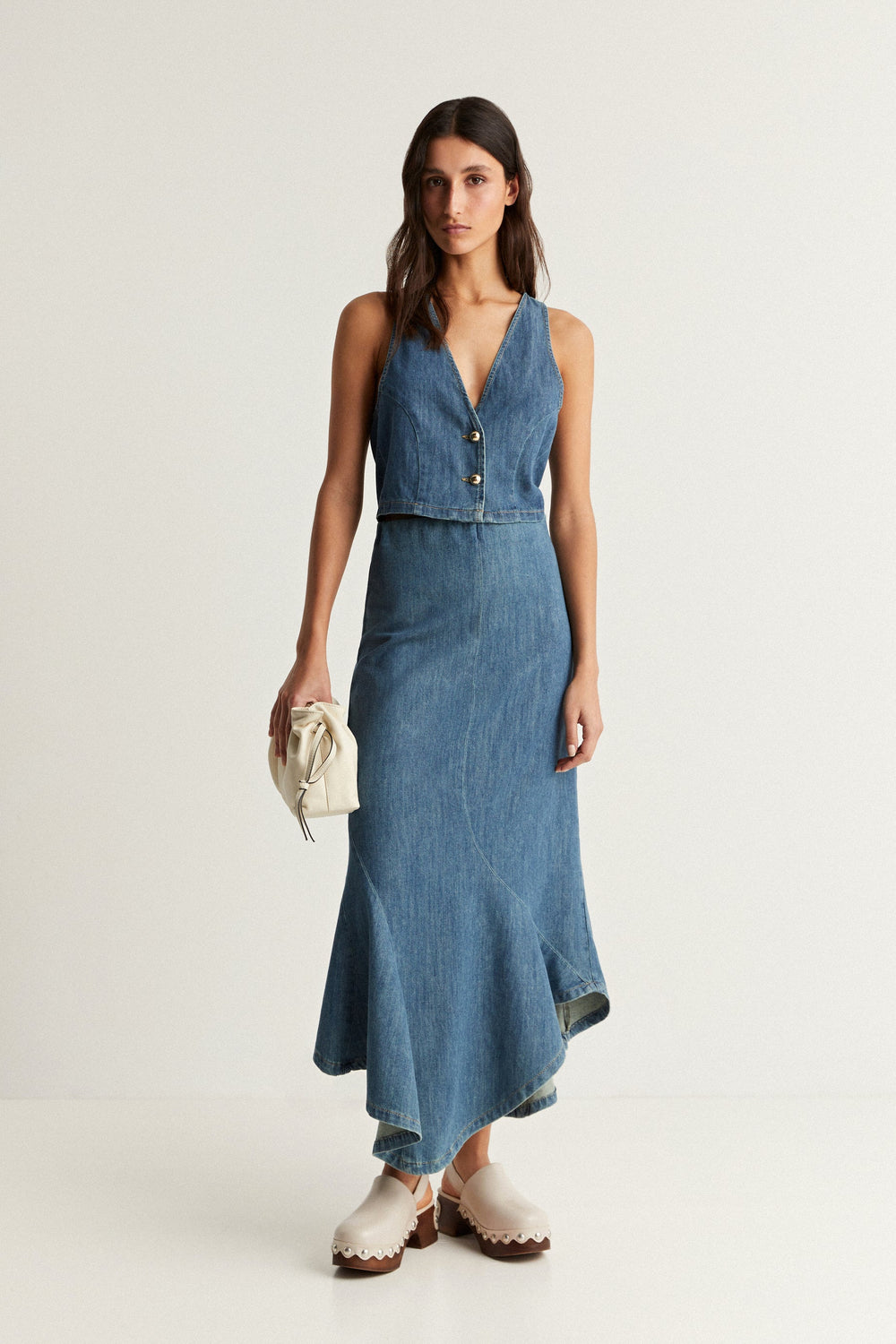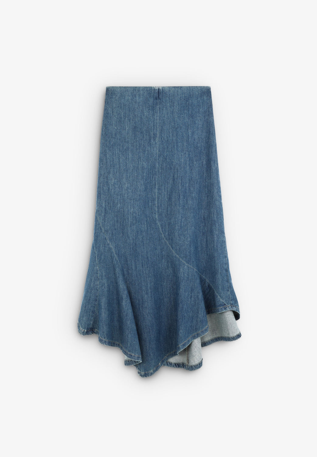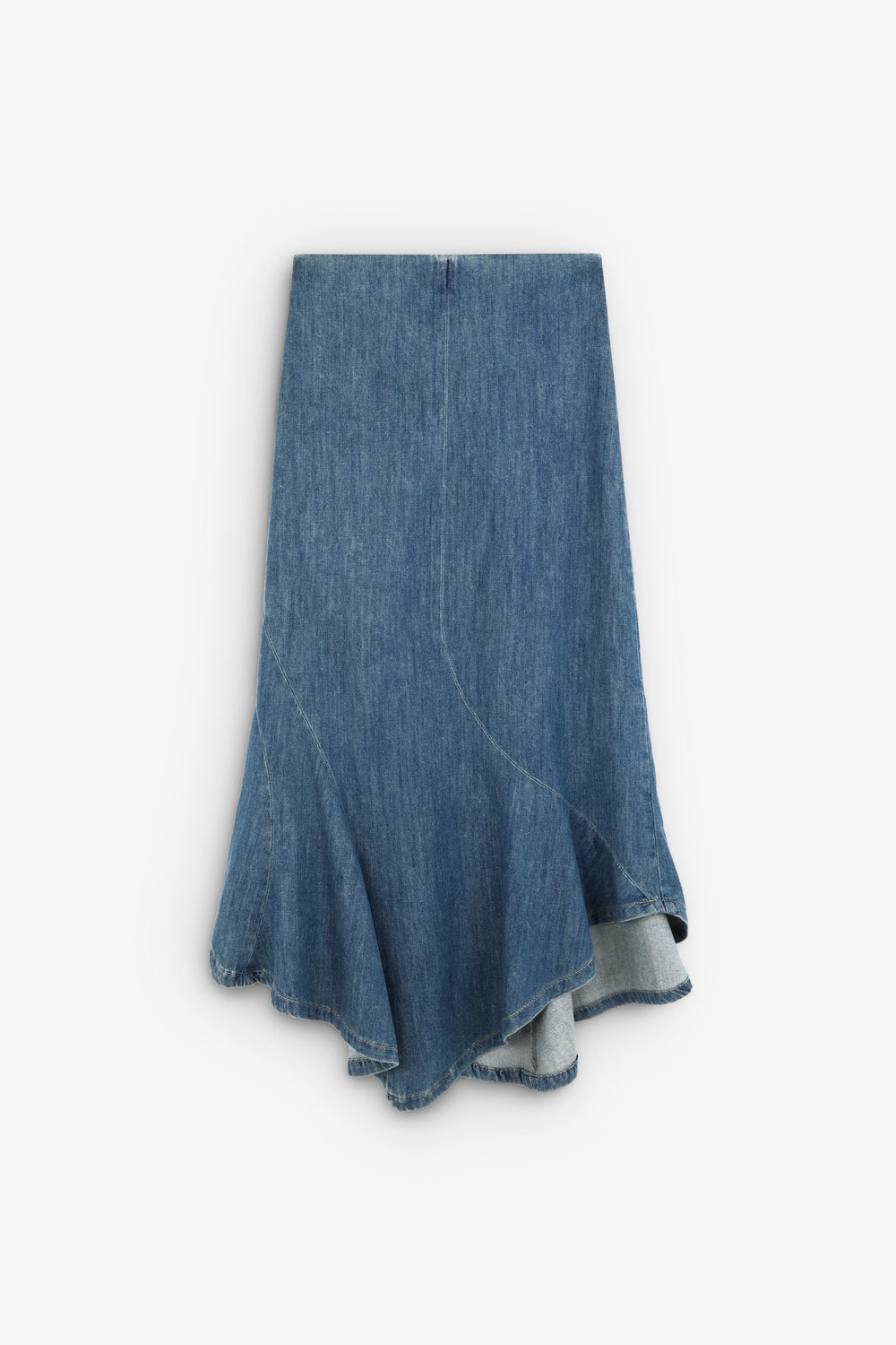 Falda midi vaquera con vuelo en bajo.