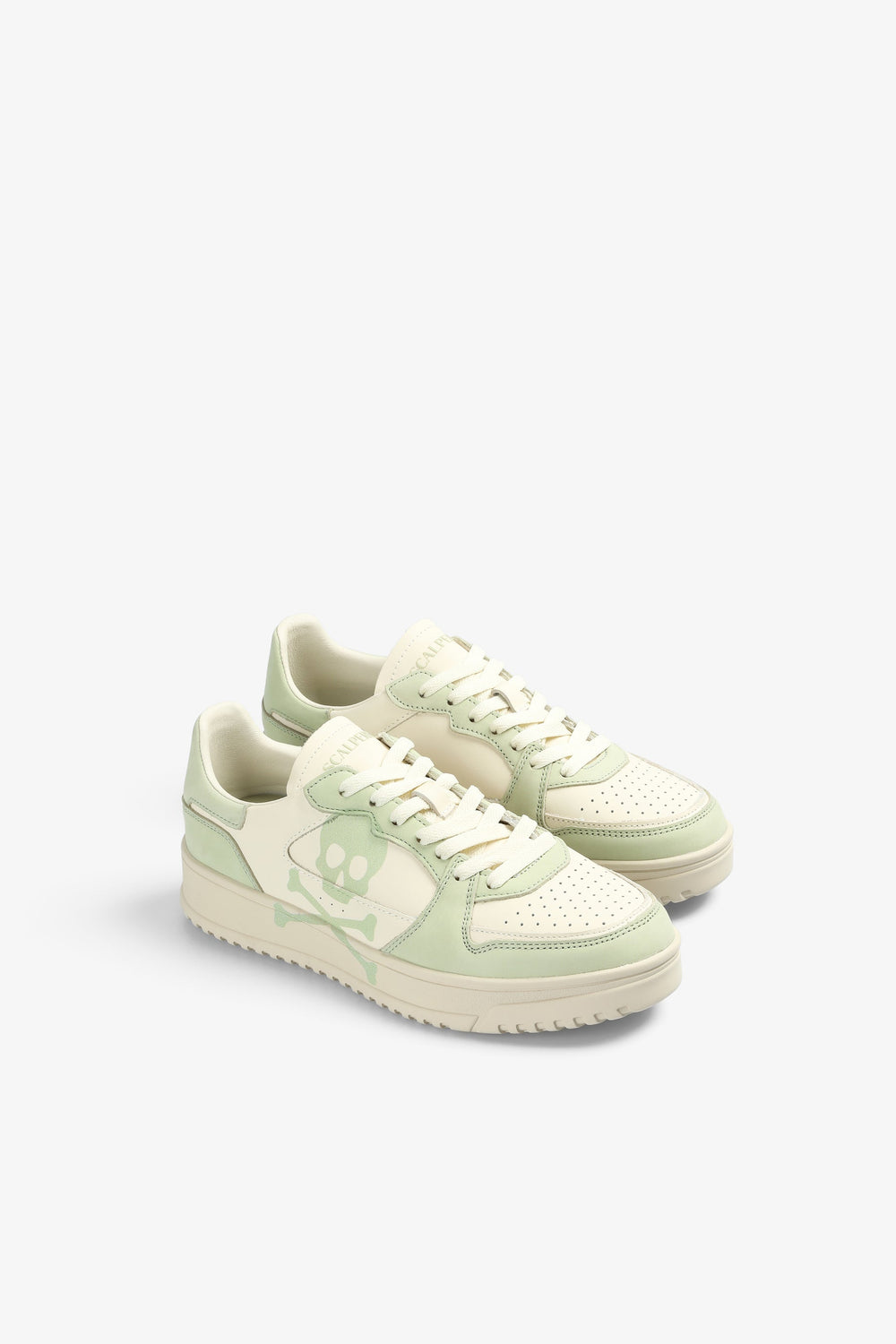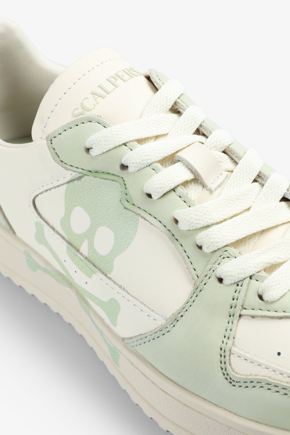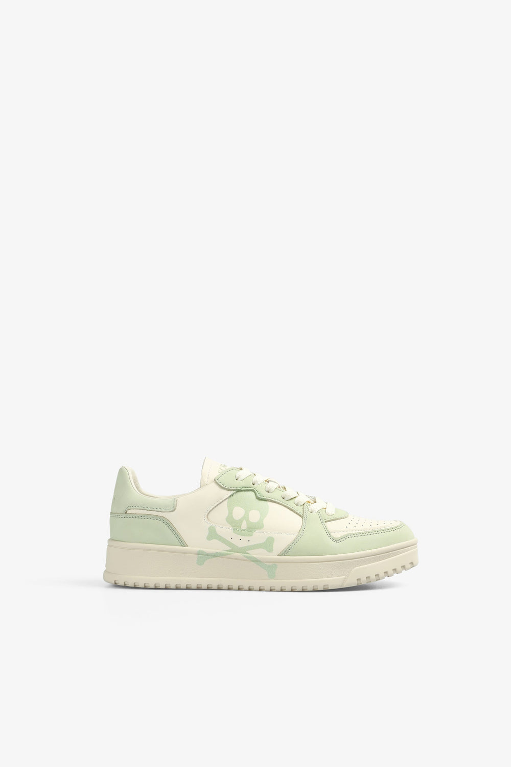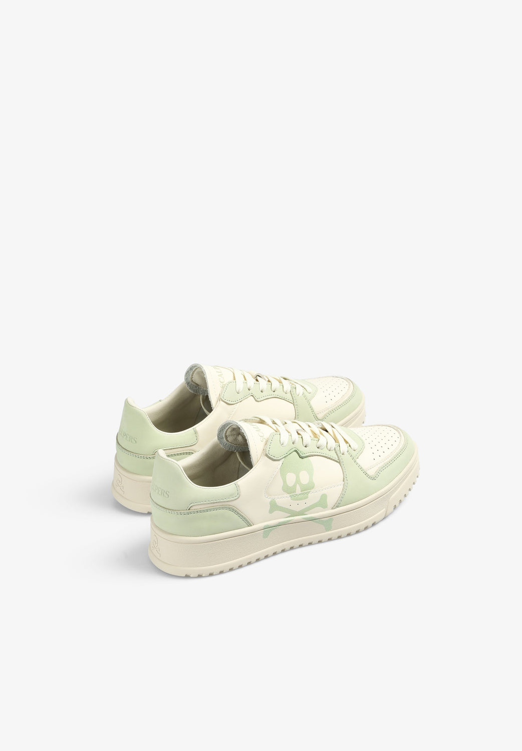 Sneakers con detalle de calavera lateral en glitter. Confeccionadas en piel. Cierre con cordones a tono. Suela de goma reciclada con detalle de calavera grabada. Talón metalizado.