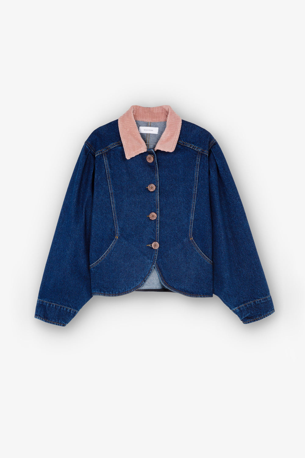 Chaqueta denim confeccionada en 100% algodón. Regular fit, cuello clásico y cierre con botones. Manga larga y bolsillos laterales. Bajo redondeado y detalle de costuras marcadas.