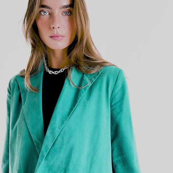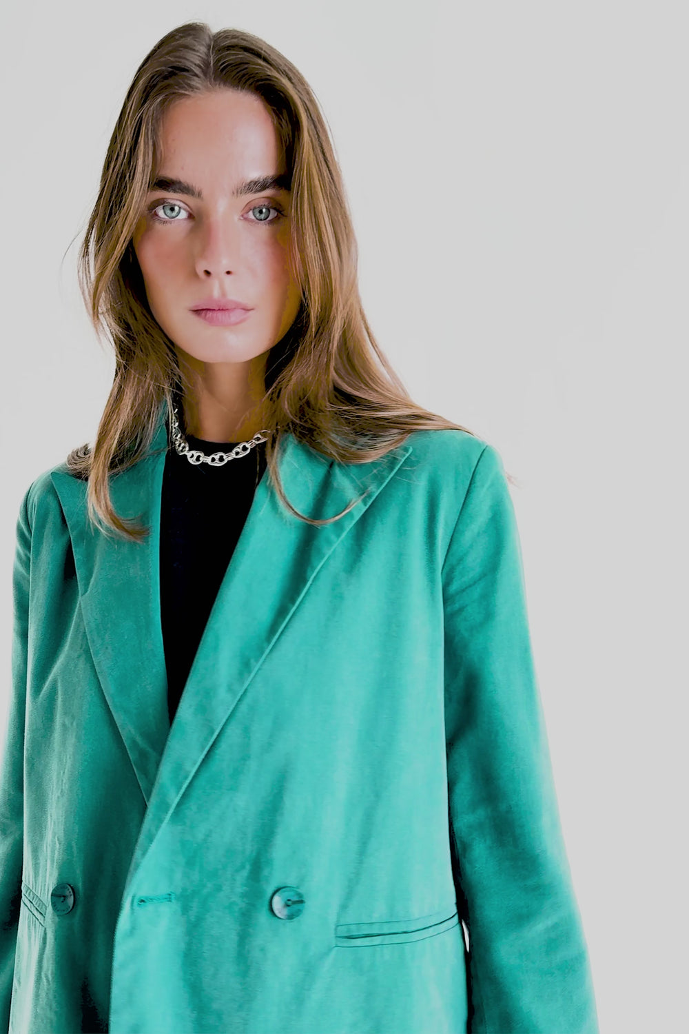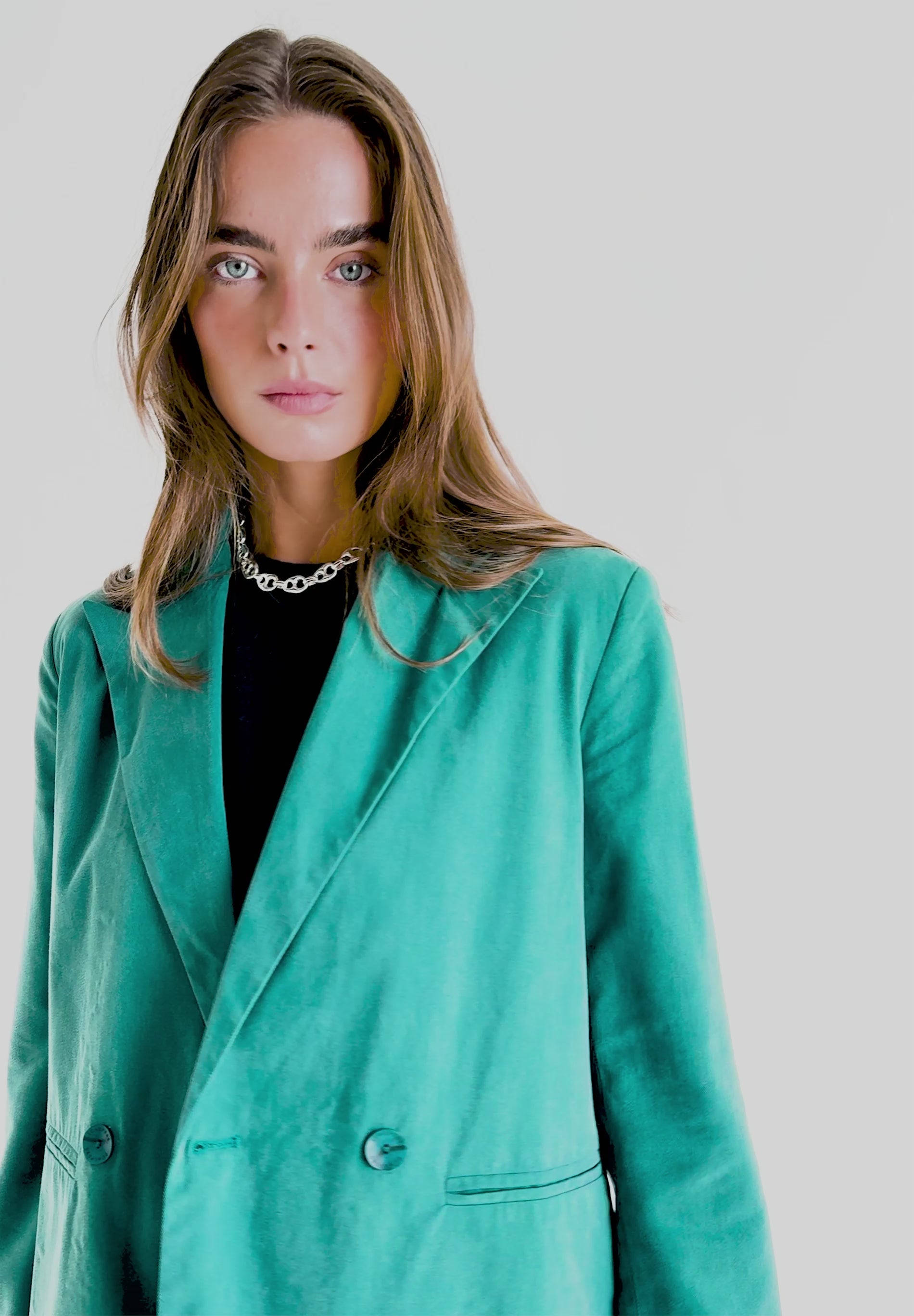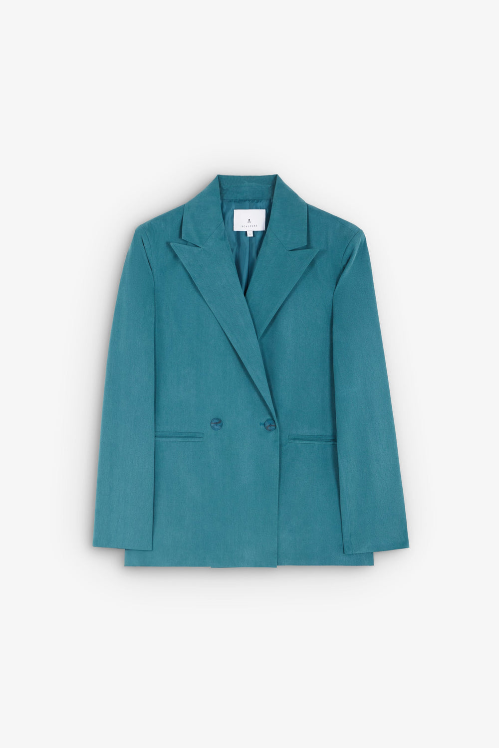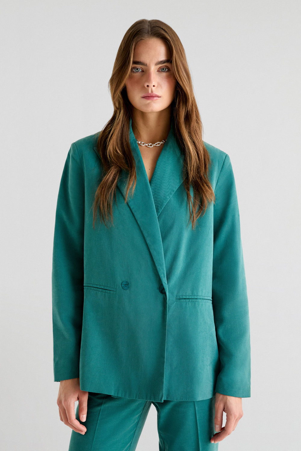 Blazer confeccionado en tejido soft. Regular fit, cuello con solapas de muesca y cierre cruzado. Manga larga y bolsillo insertado.