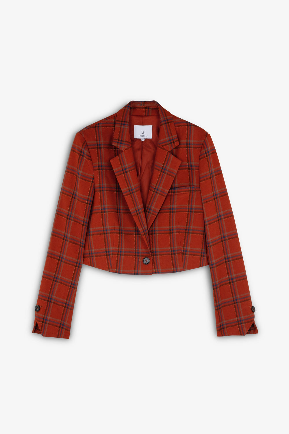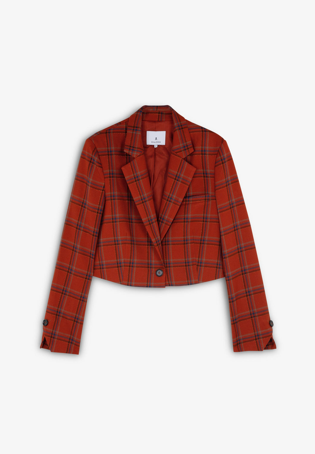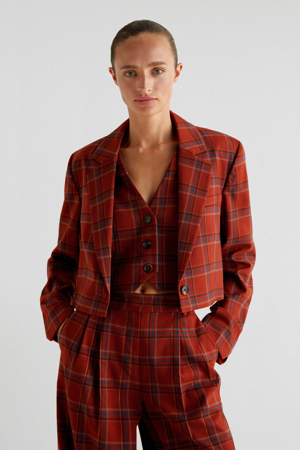 Blazer corta de cuadros. Regular fit, cuello con solapas y cierre con botón. Manga larga terminada en puño con botón.