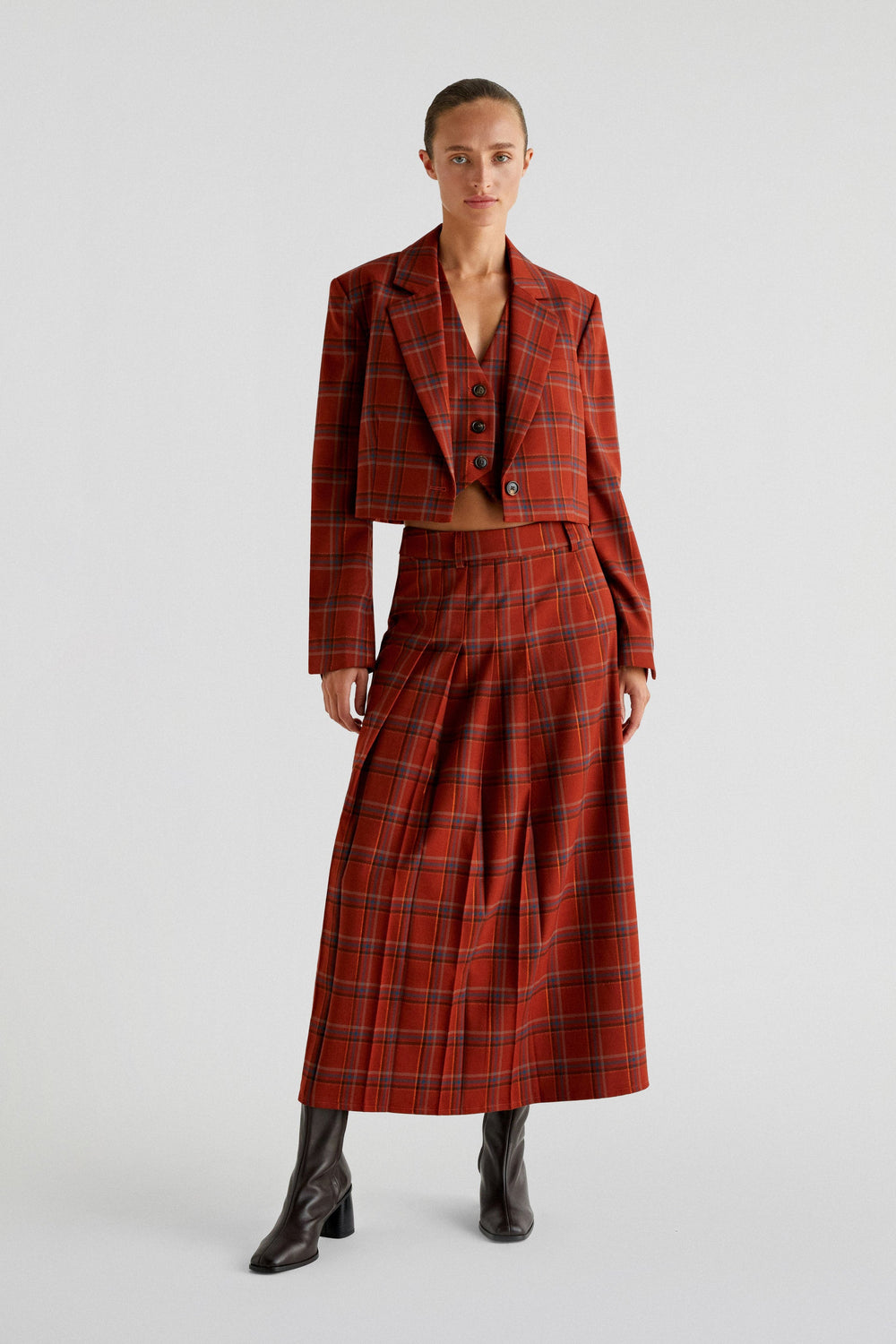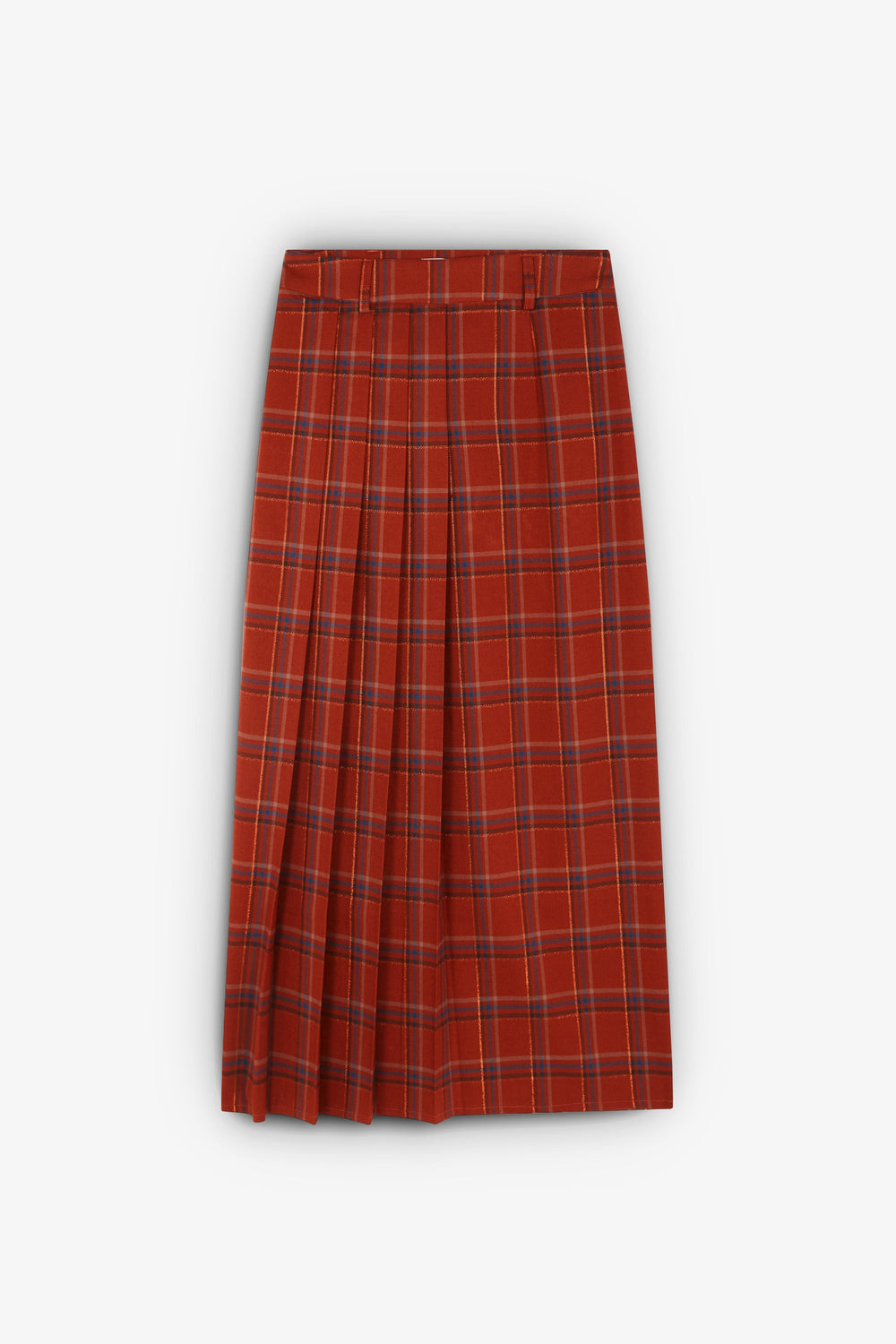 Falda midi de cuadros. Regular fit, cierre con cremallera y trabillas en cintura. Tablas delanteras.