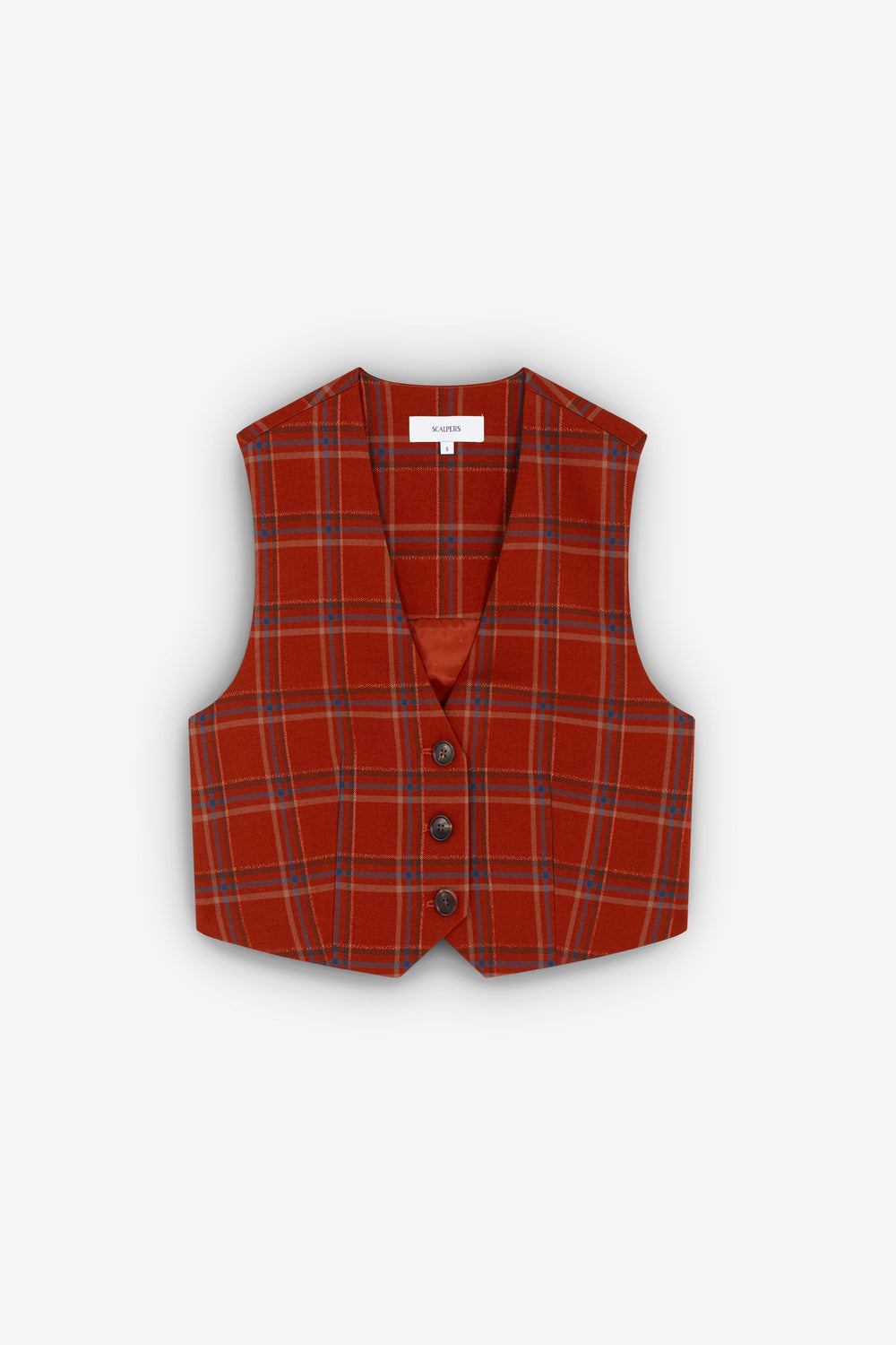 Chaleco de cuadros. Corte cropped, escote de pico y cierre con botones. Manga en sisa