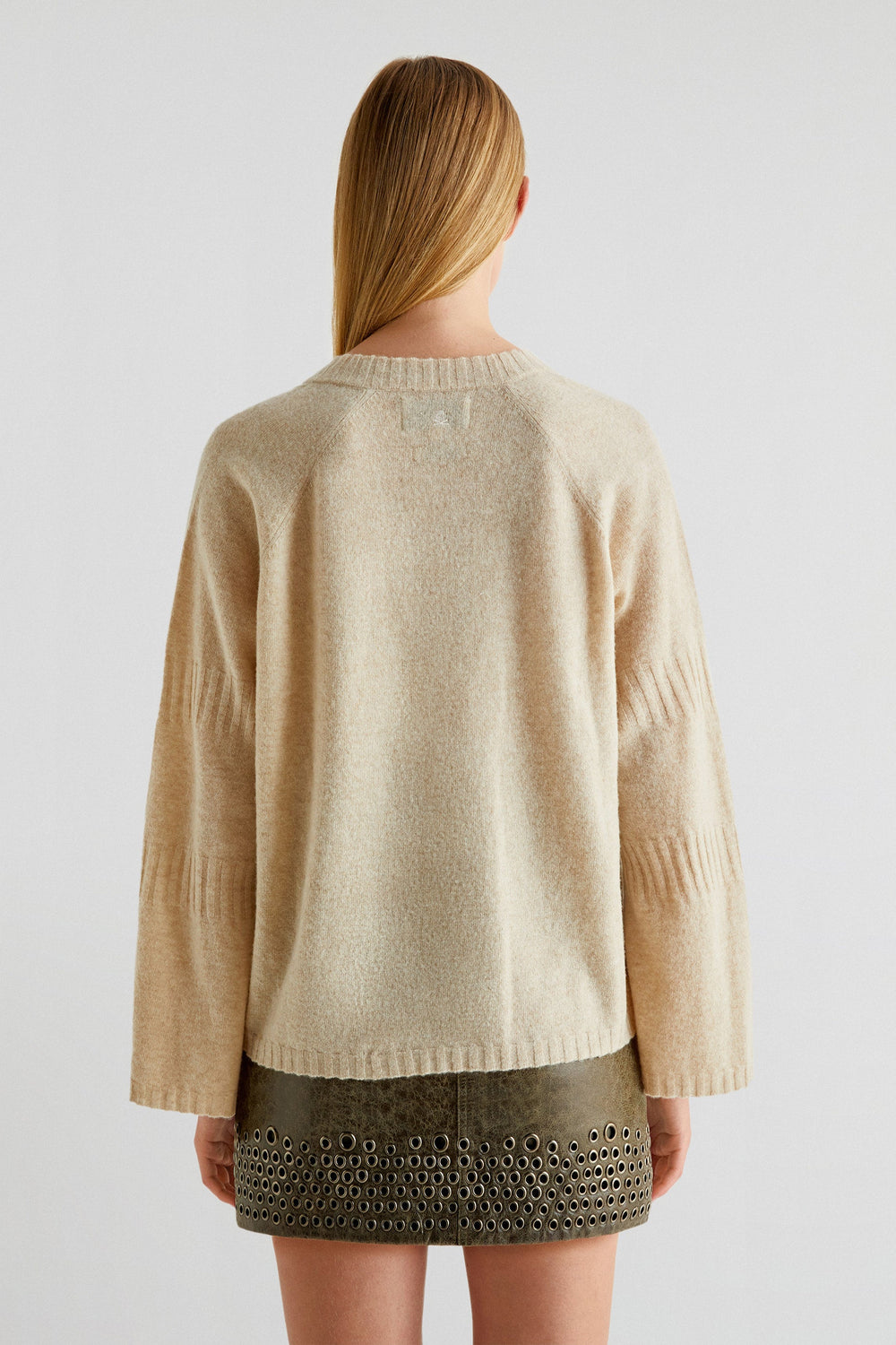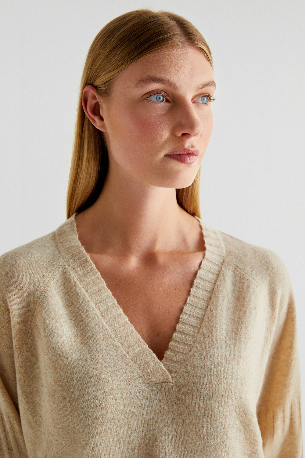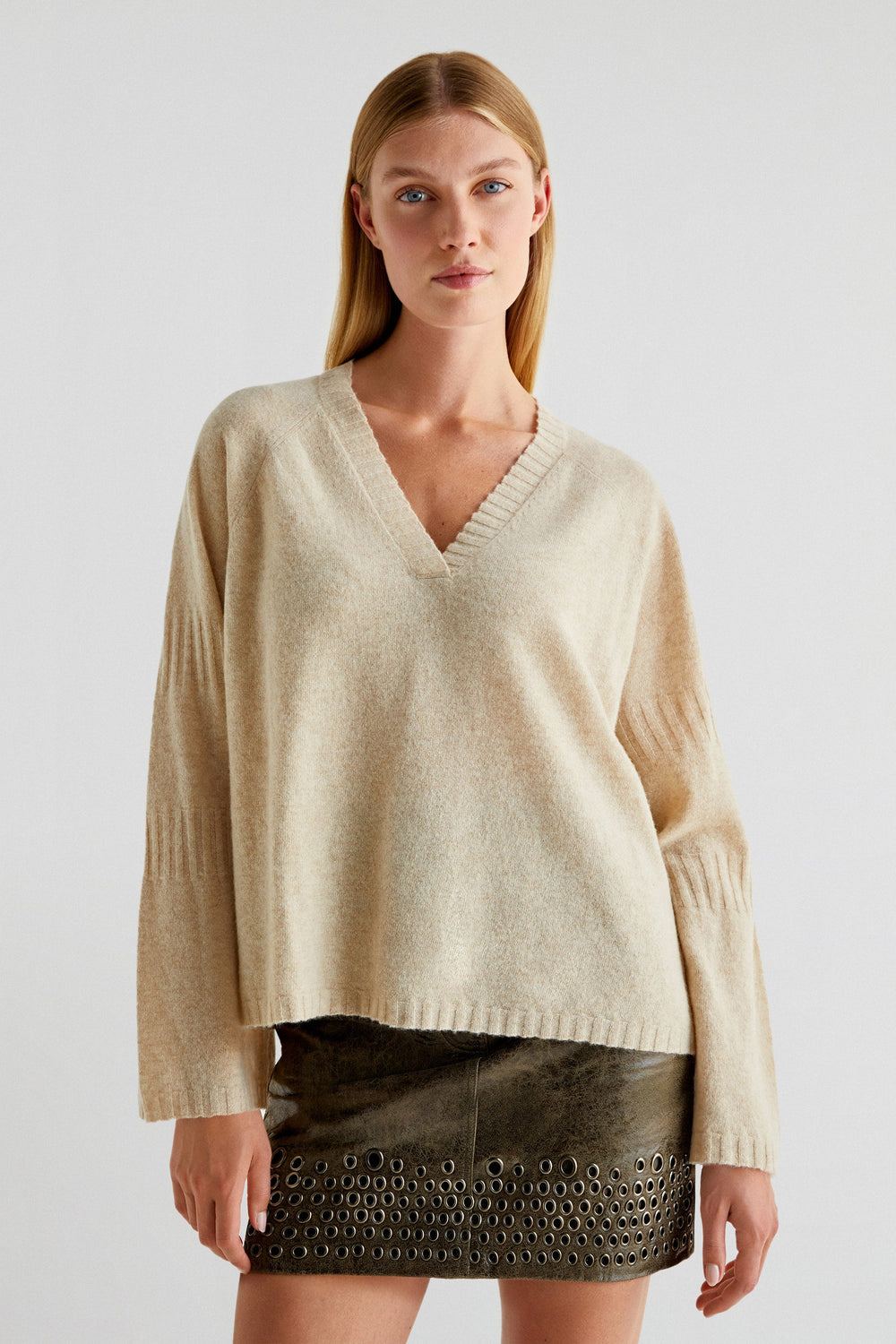 Jersey confeccionado en mezcla de lana. Regular fit, cuello de pico y manga larga con detalles.
