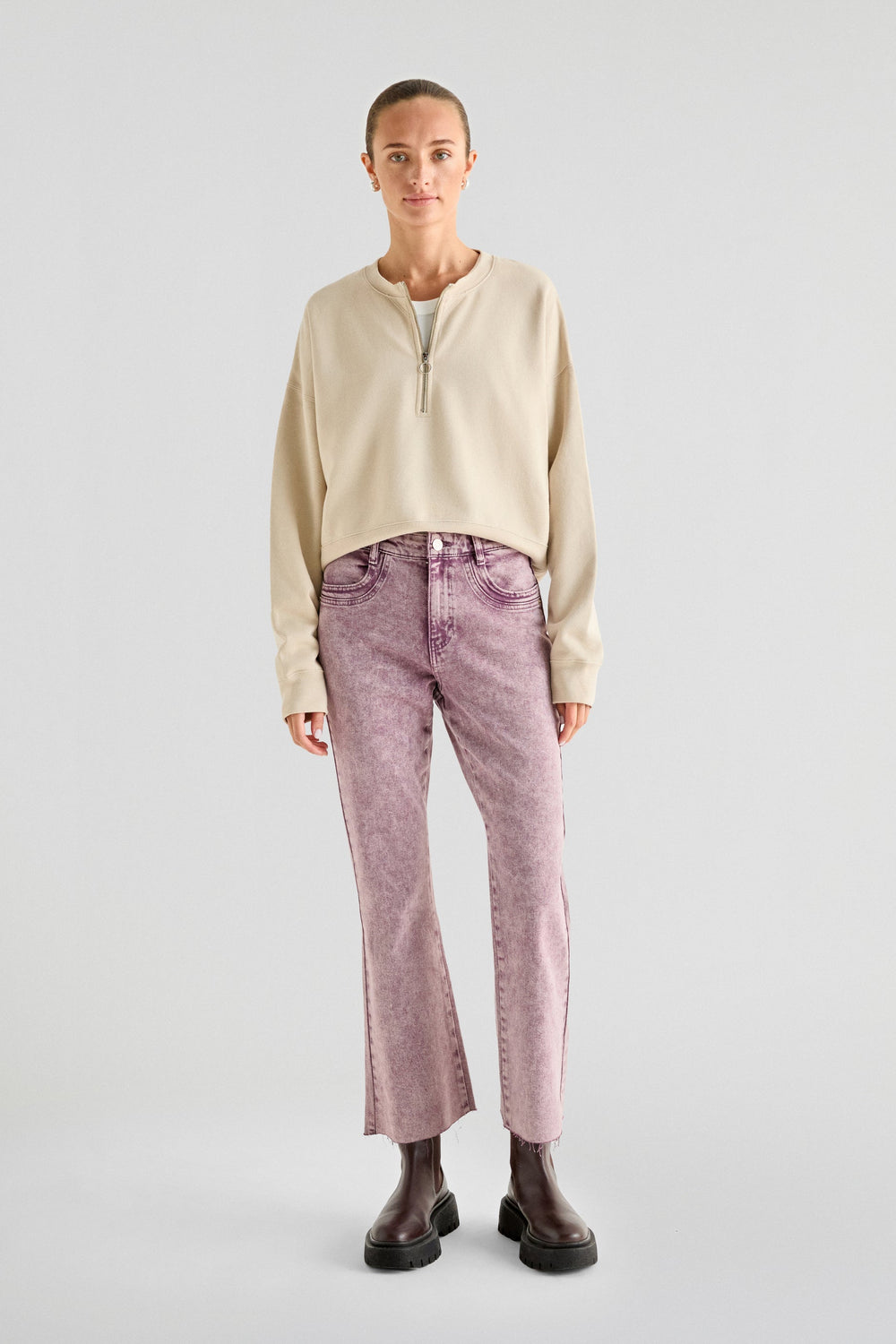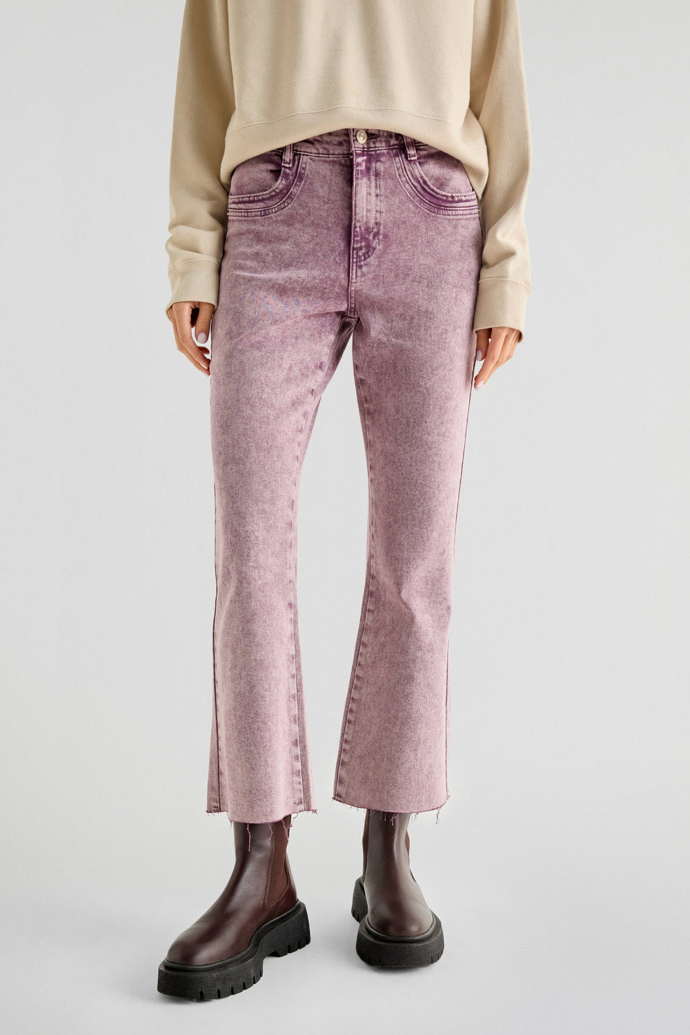 Jeans lavados confeccionados en algodón ligeramente elástico. Corte flare slim fit, cierre con botón y cremallera. Bolsillos frontales y traseros y trabillas en cintura. Bajo desflecado.