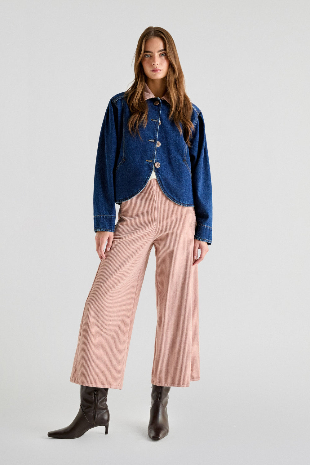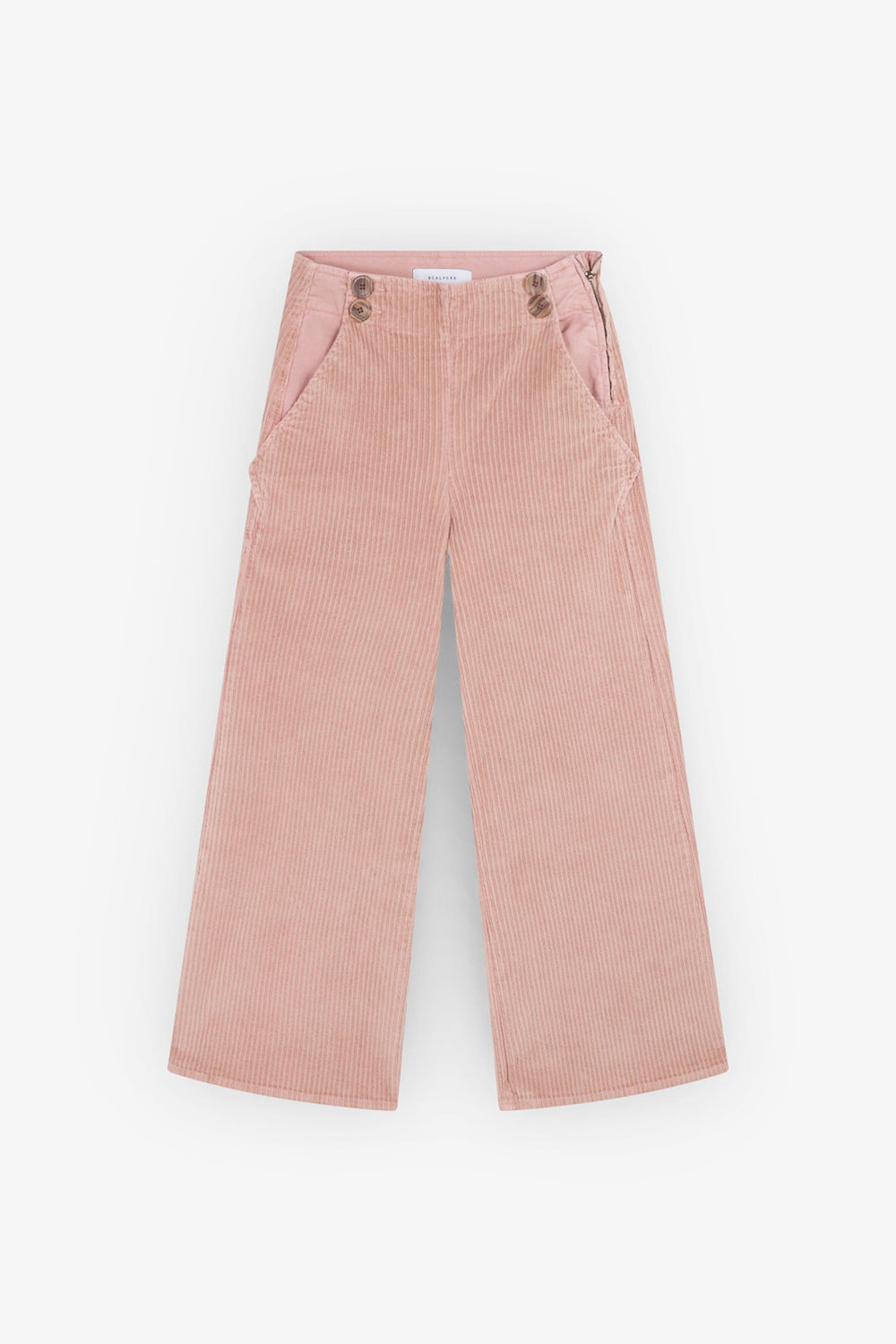 Pantalón de pana confeccionados en algodón ligeramente elástico. Corte culotte, cierre con botones laterales y bolsillos laterales.