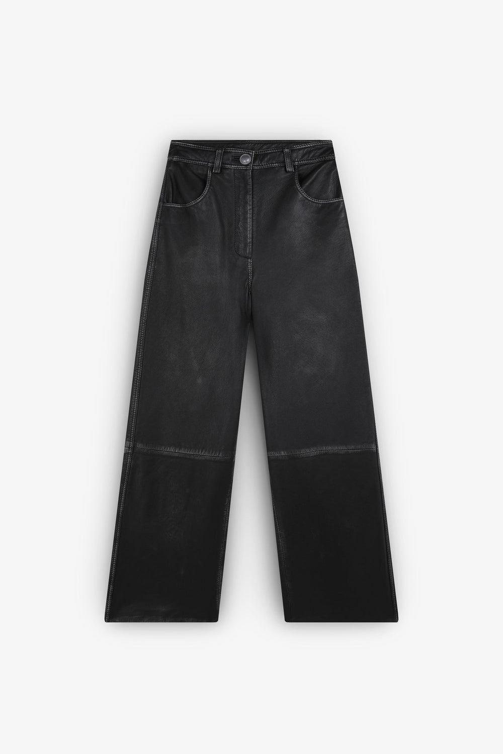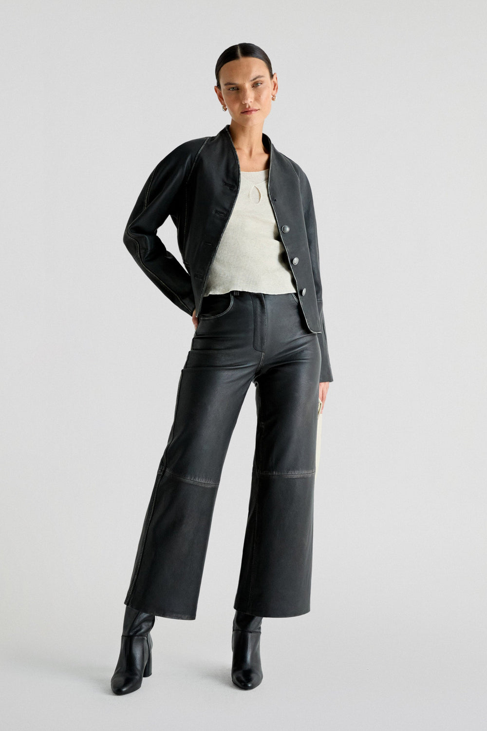 Pantalón confeccionado en 100% piel. Slim fit de corte culotte, cierre con cremallera y botón y bolsillos. Trabillas en cintura y detalles de corte en pernera.