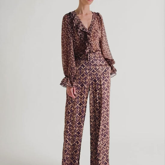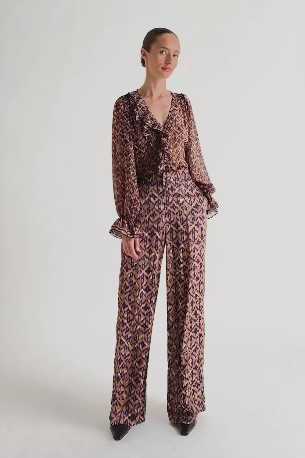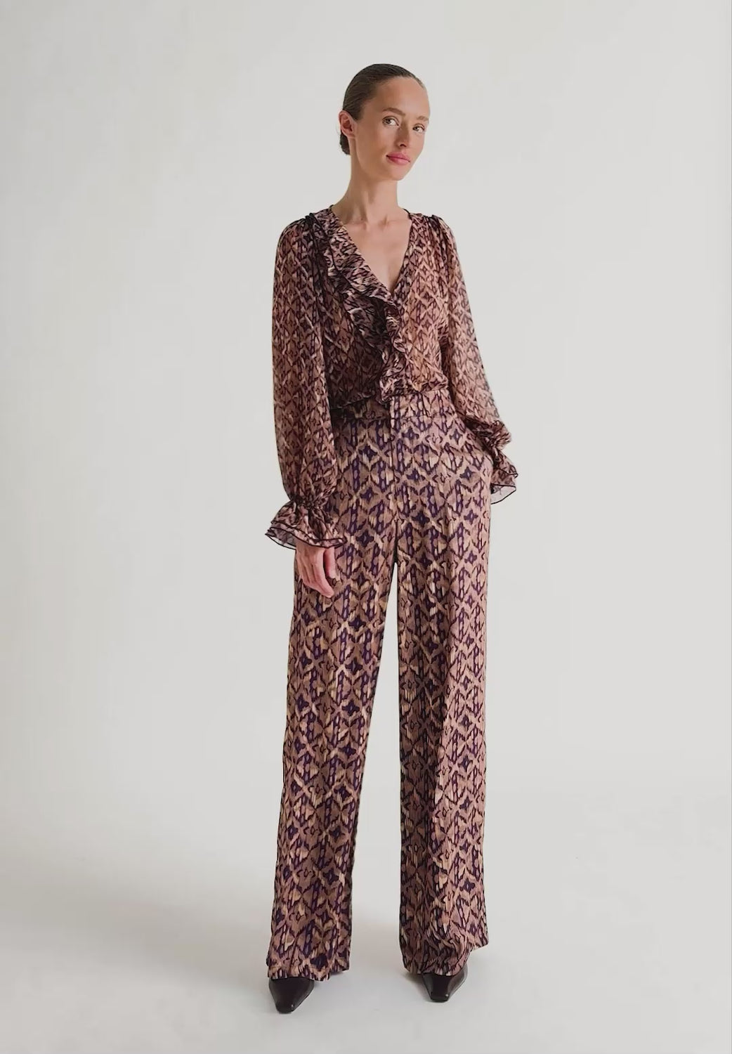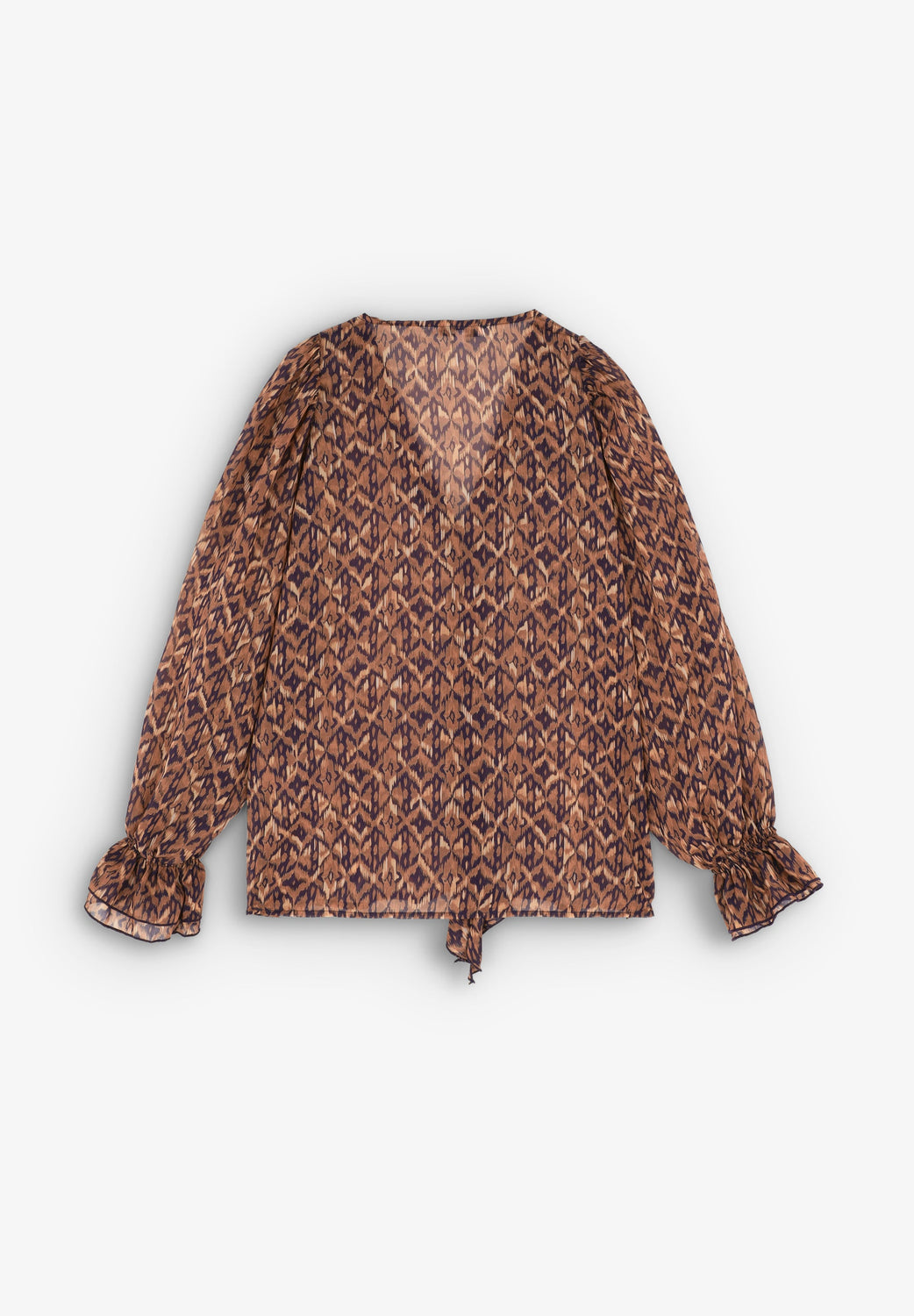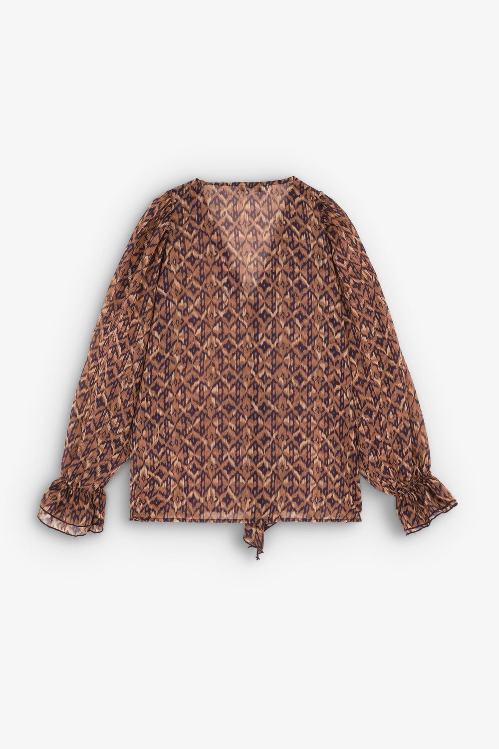 Blusa étnica confeccionada en tejido fluido. Regular fit, escote de pico con detalle de volante y manga larga acabada en elástico.
