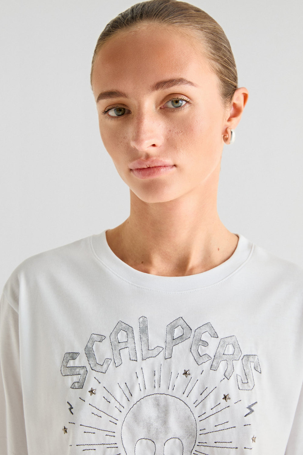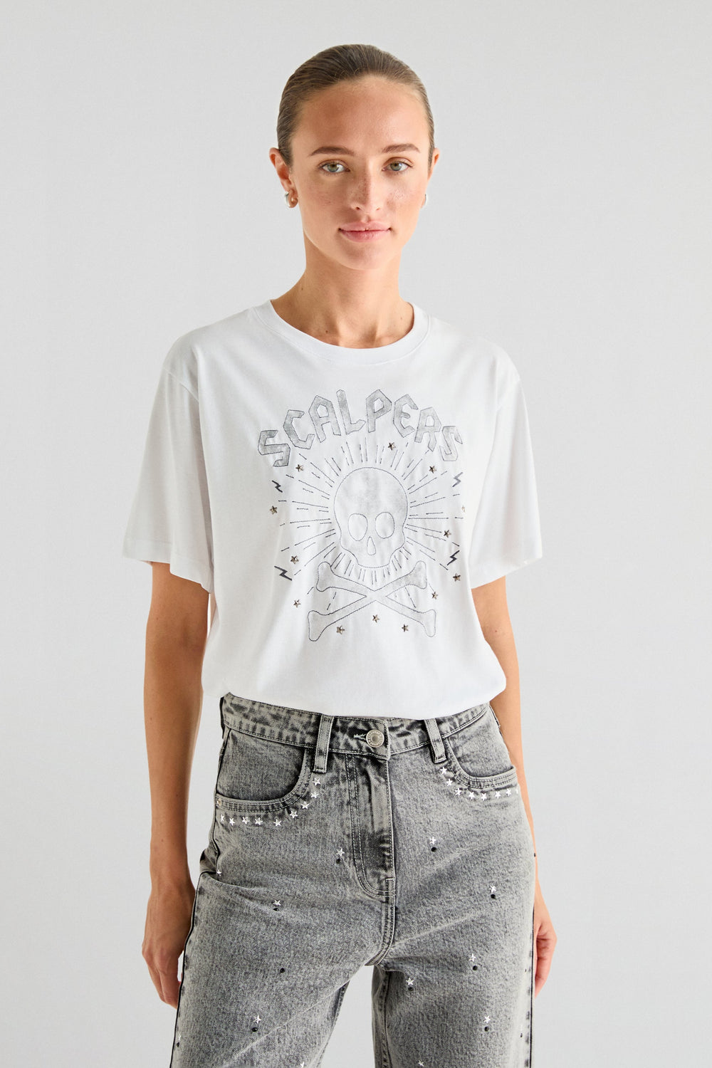 Camiseta confeccionada en 100% algodón. Regular fit, cuello redondo y manga corta. Detalle de print frontal con tachuelas de estrellas.