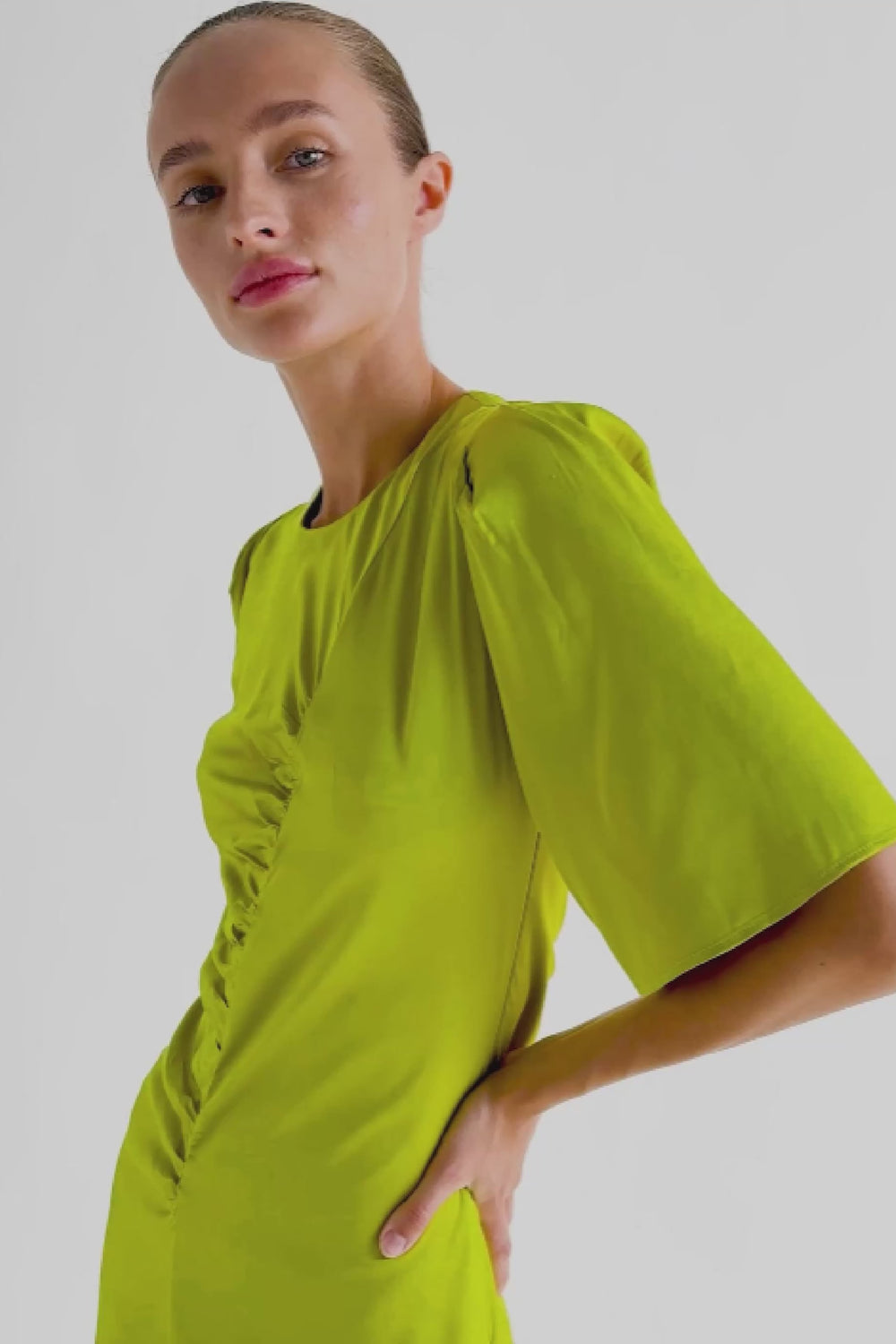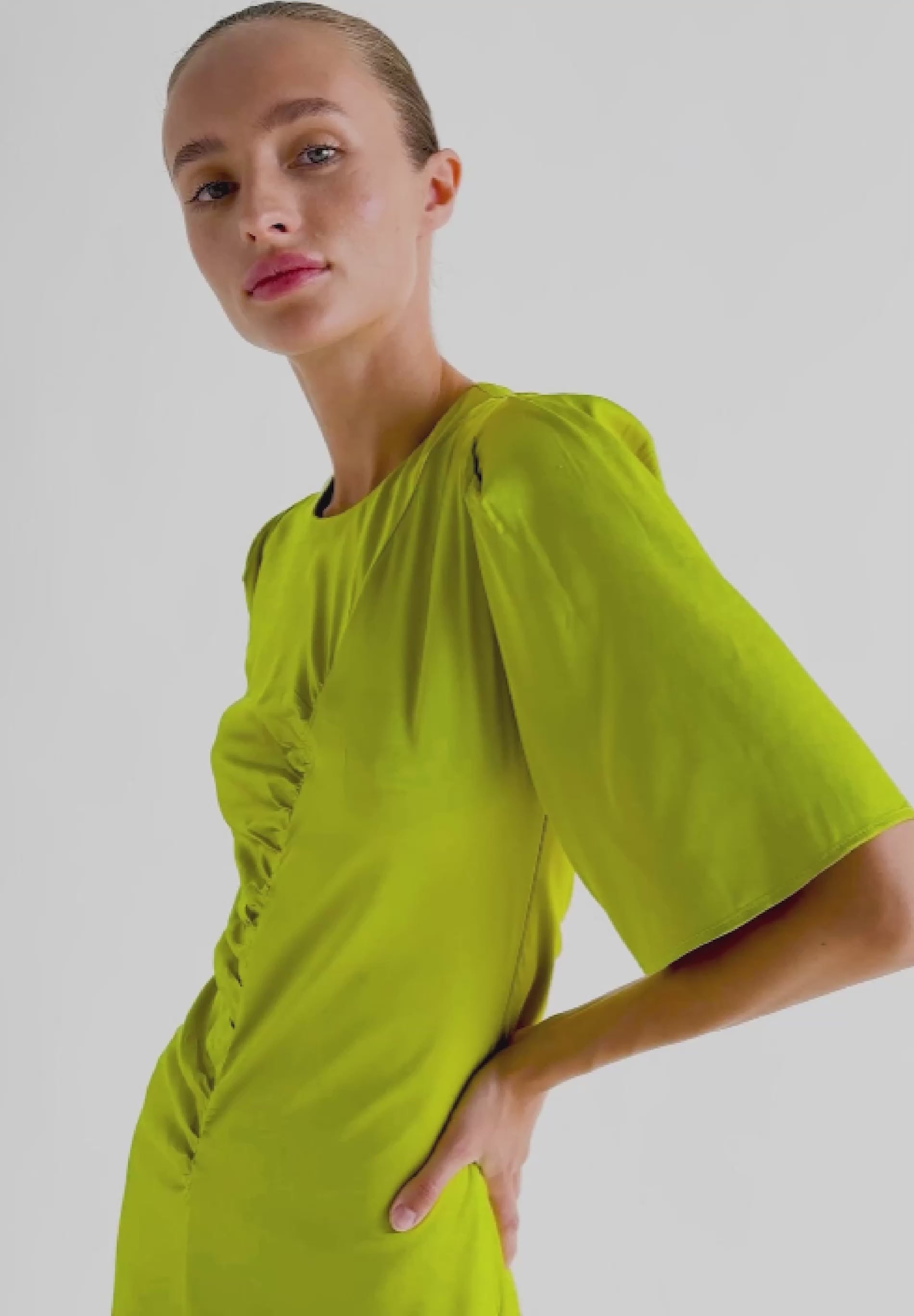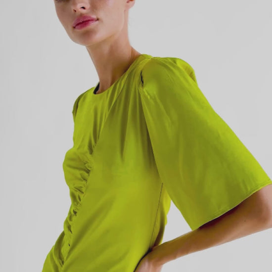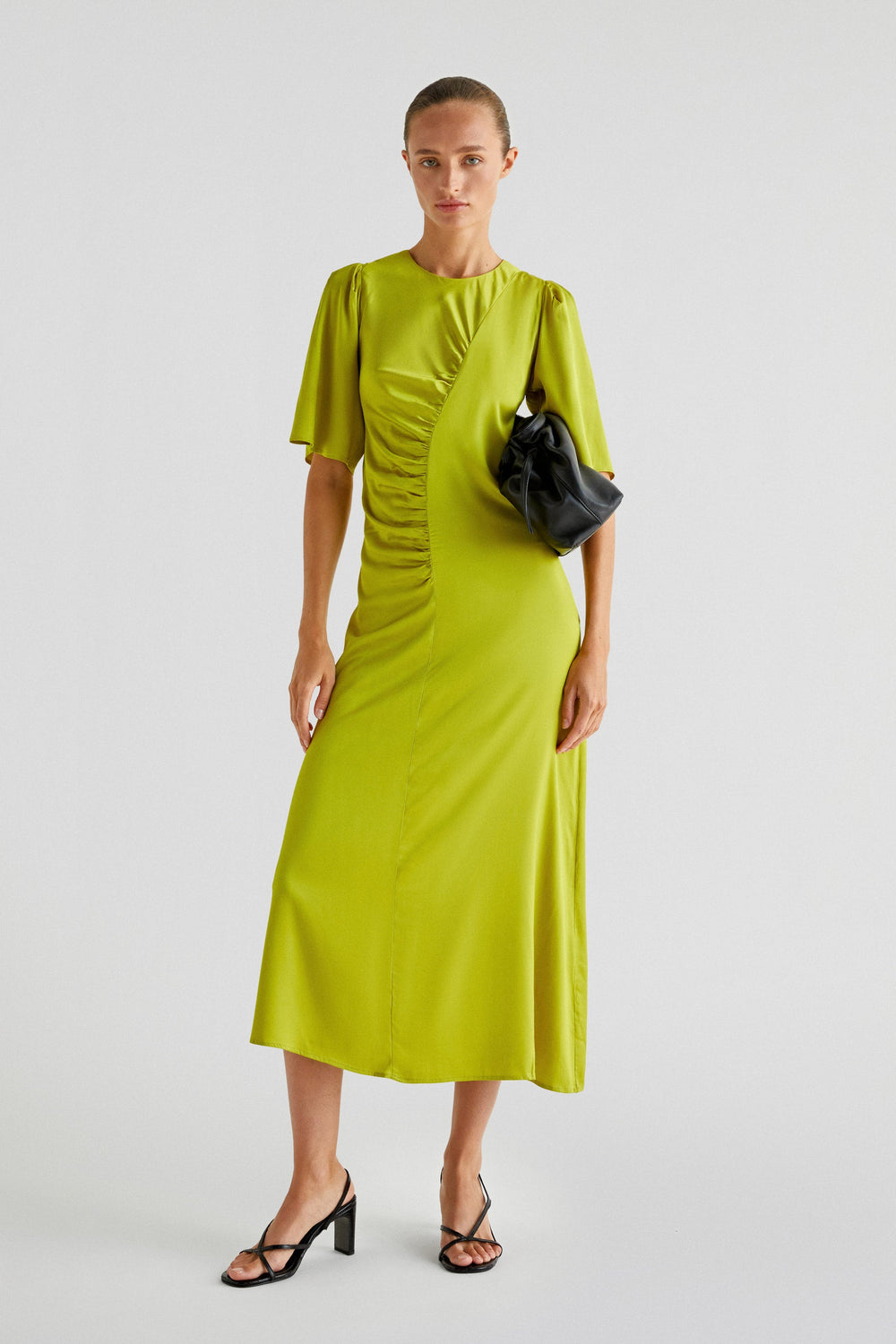 Vestido midi con corte central y drapeado. Manga corta y botones con ojales traseros.
