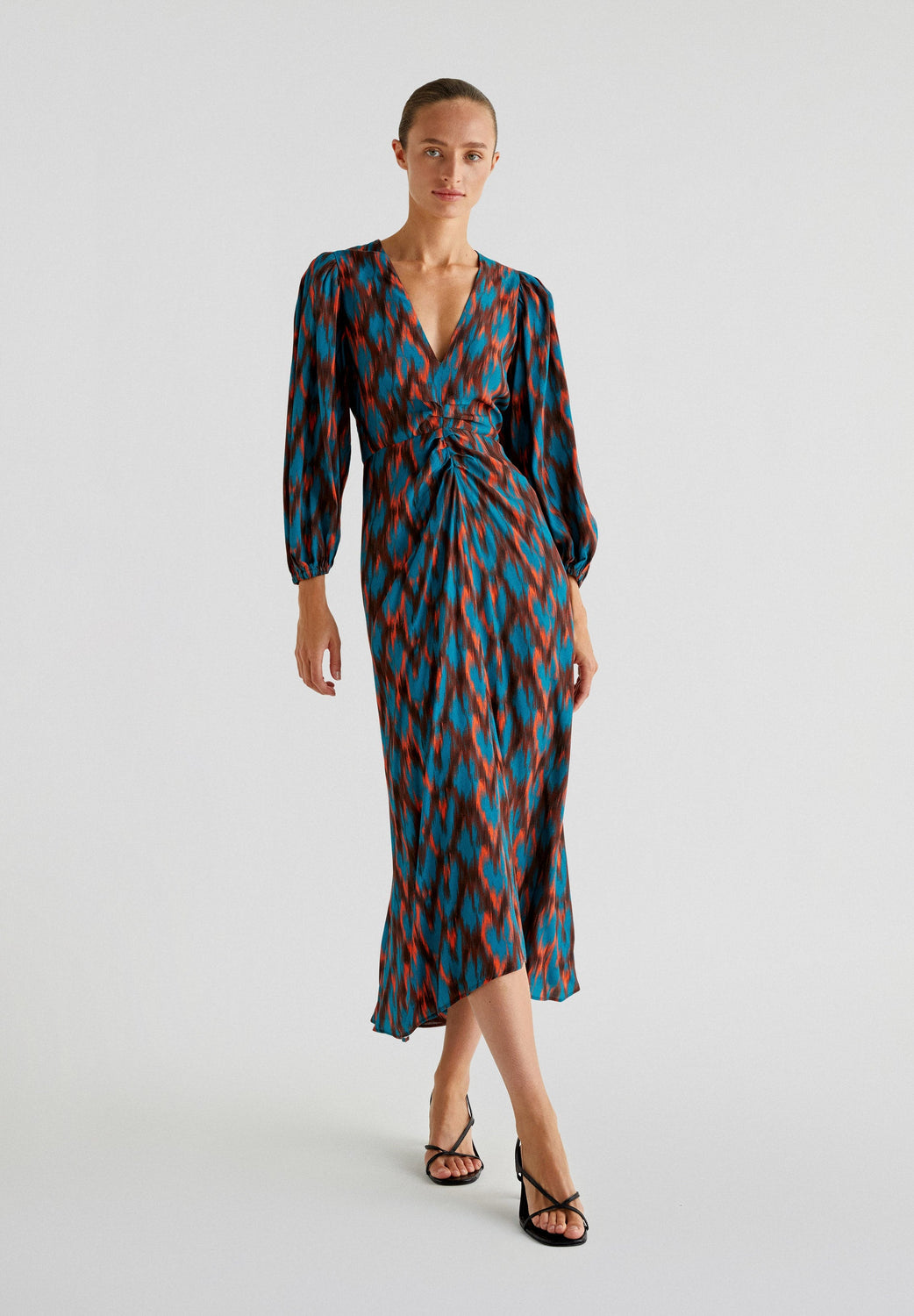 Vestido midi dreapeado con print confeccionado en tejido fluido. Regular fit, escote de pico y cierre con cremallera. Manga larga.