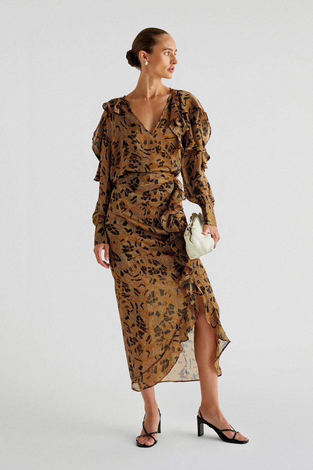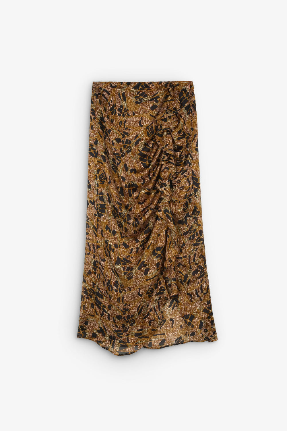 Falda con print drapeada confeccionada en tejido fluido. Cierre con cremallera y bajo con abertura.