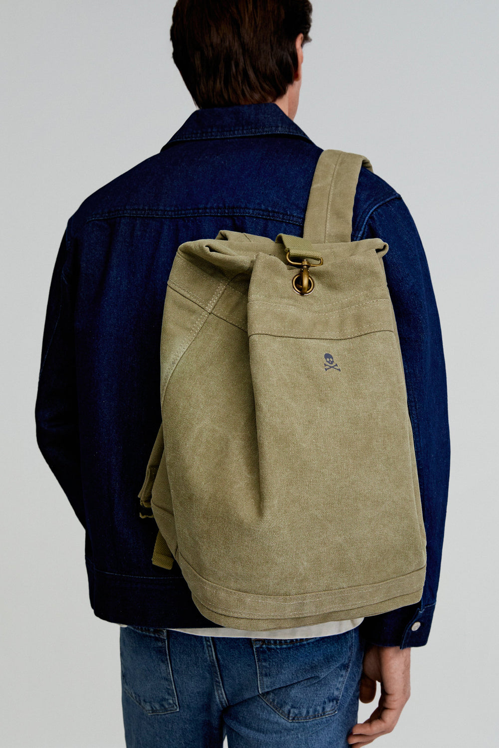 Mochila tipo saco confeccionada en 100% algodón. Cierre con gancho en la parte superior, asas traseras ajustables. Bolsillo interior con snap y detalle de calavera.