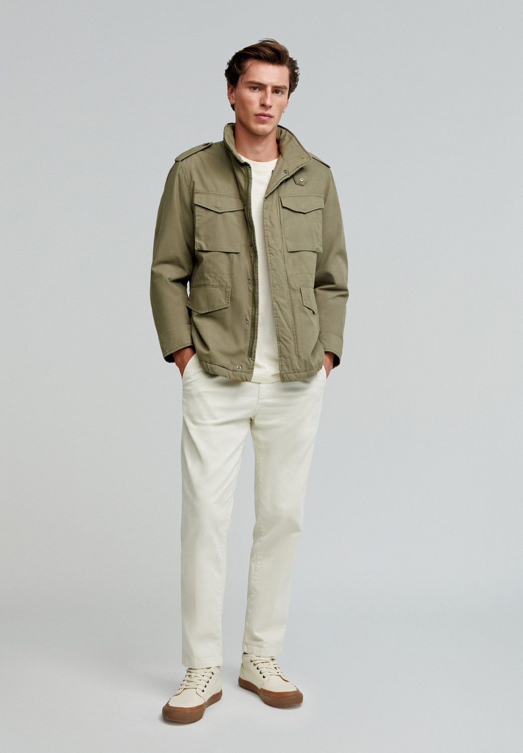 Pantalón confeccionado en algodón ligeramente elástico. Relaxed fit, cierre con cinturilla prolongada con botón y cremallera. Bolsillos laterales y traseros y trabillas en cintura.