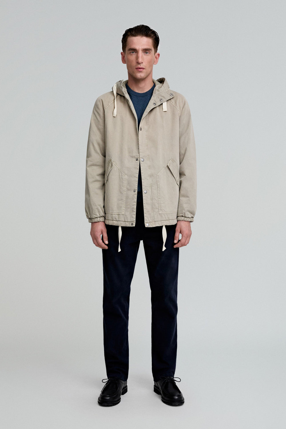 Chaqueta ligeramente acolchada confeccionada en 100% algodón BCI. Regular fit, cuello con capucha ajustable con cordones y cierre con snaps. Manga larga terminada en elástico y bolsillos con tapeta. Bolsillo interior con cremallera.