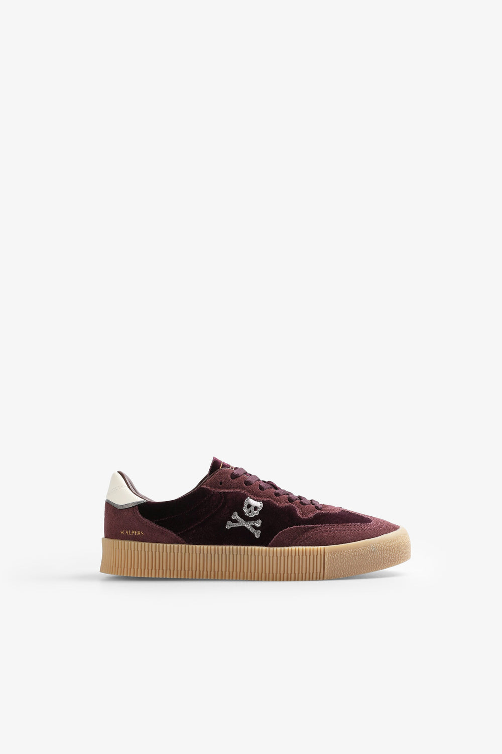 Sneakers confeccionadas en piel terminadas en terciopelo y serraje. Cierre con cordones a tono, suela de goma y calavera metalizada y logo.