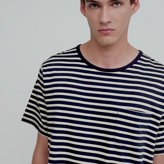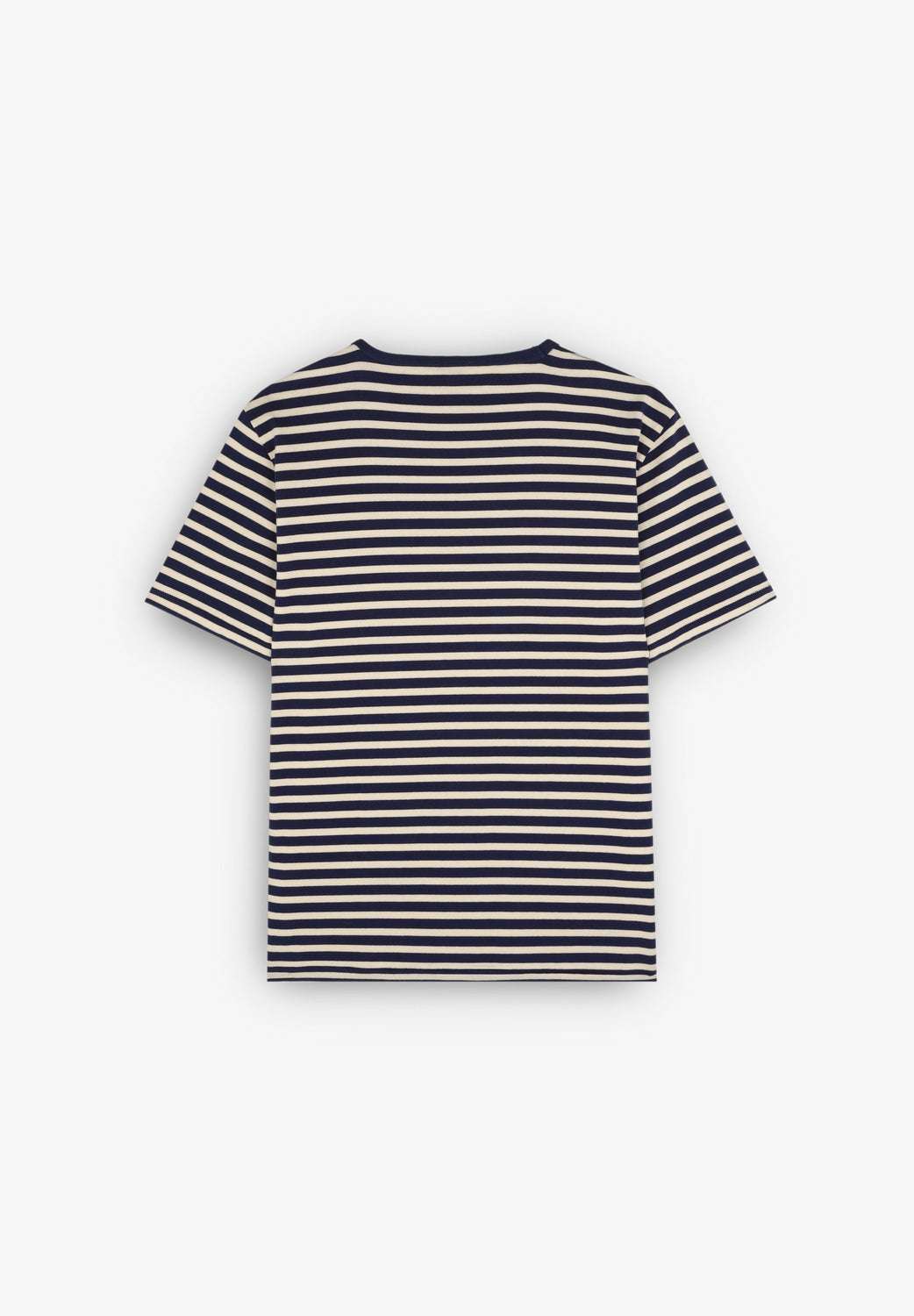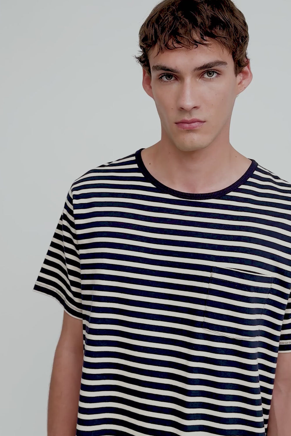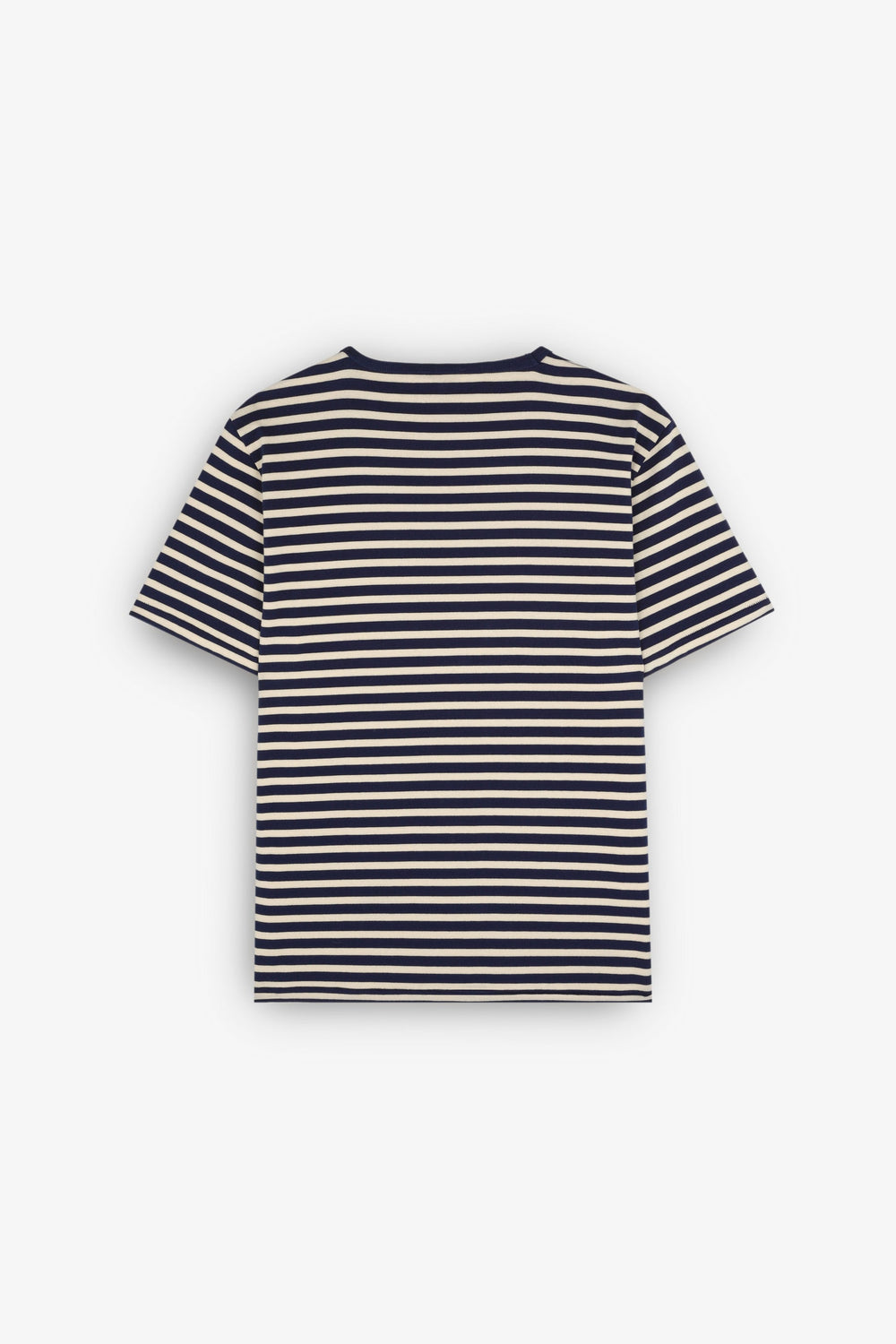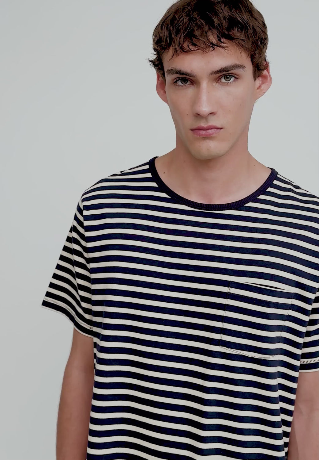 Camiseta premium de rayas confeccionada en 100% algodón BCI. Relaxed fit, cuello redondo y manga corta. Bolsillo en pecho.