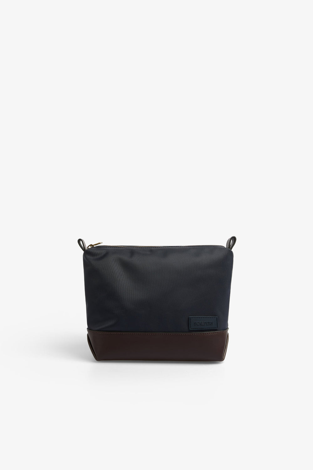 Neceser confeccionado en tejido técnico. Cierre con cremallera y detalles en piel. Bolsillo interior con cremallera.