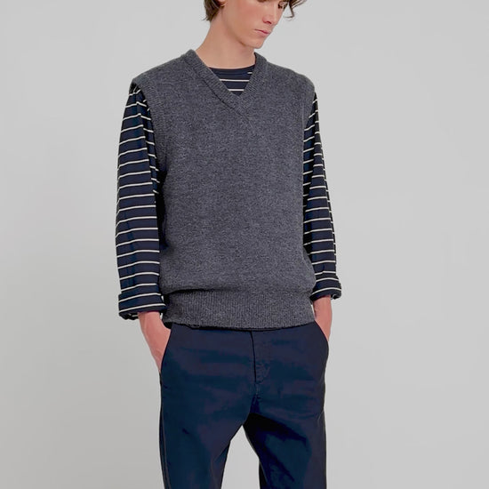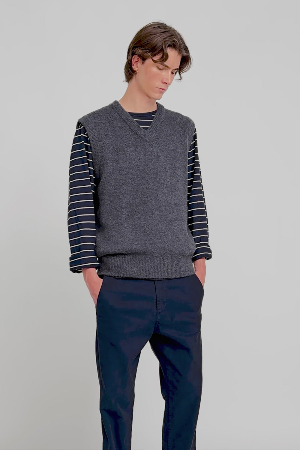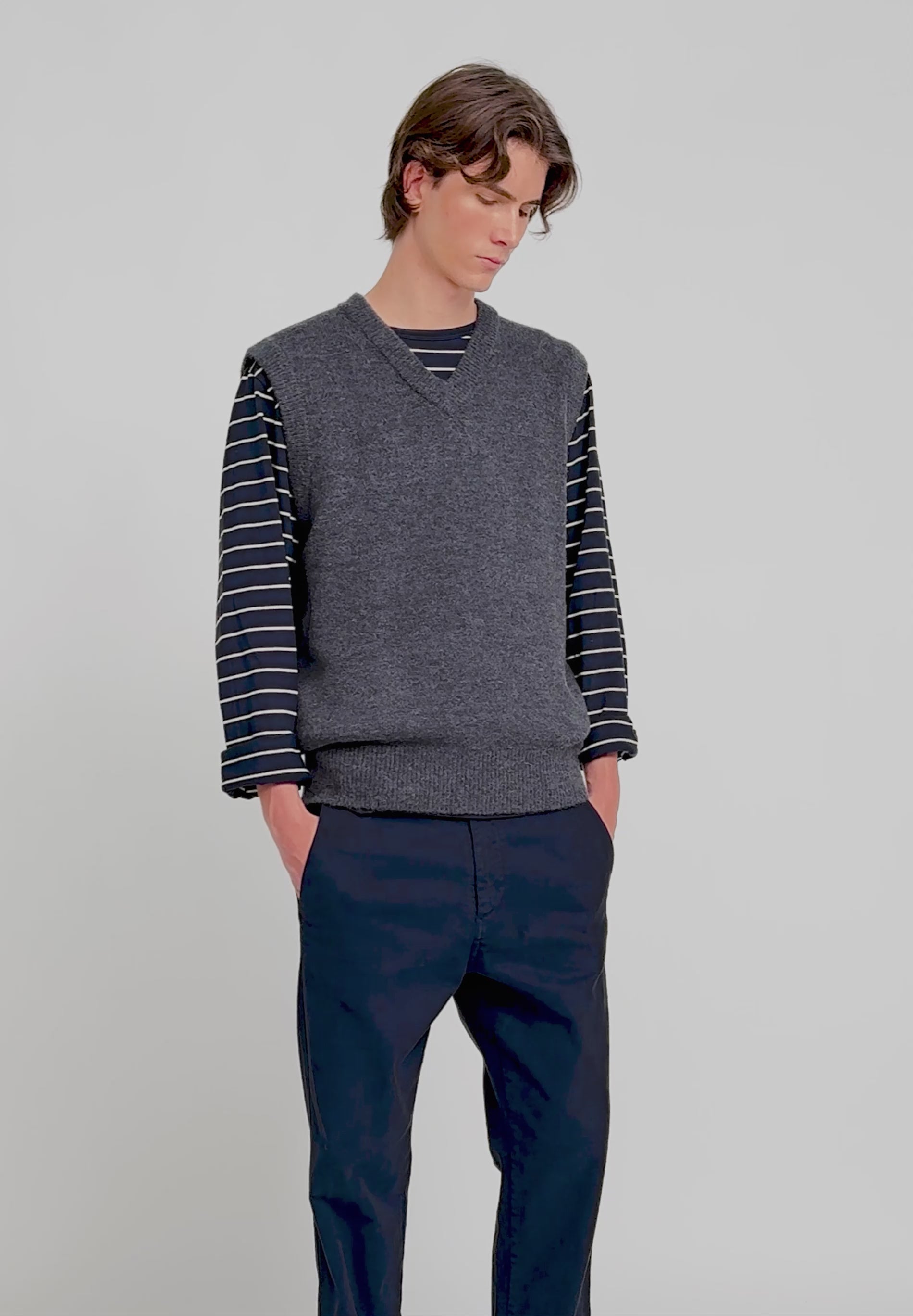 Chaleco premium confeccionado en mezcla de lana y alpaca. Regular fit, cuello de pico y manga en sisa.
