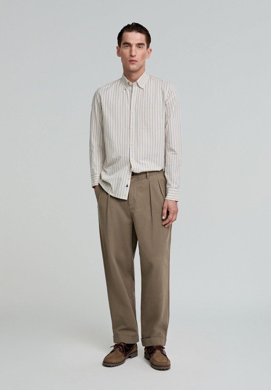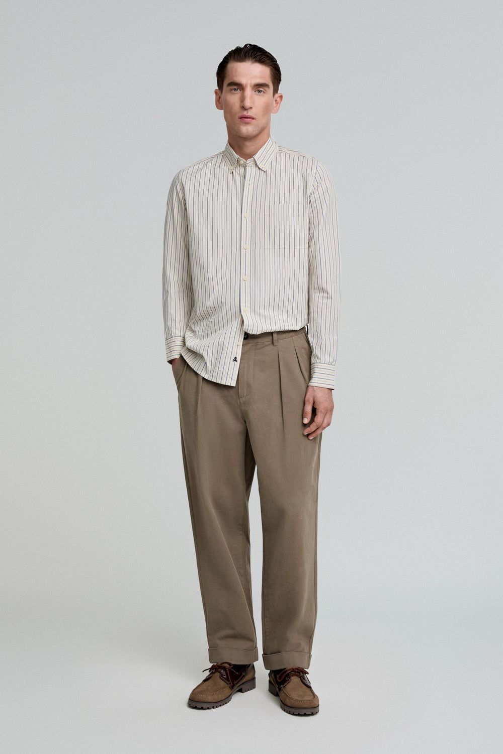 Camisa premium de rayas confeccionada en 100% algodón BCI. Regular fit, cuello clásico y cierre con botones. Manga larga terminada en puño con botón y calavera bordada en tapeta.