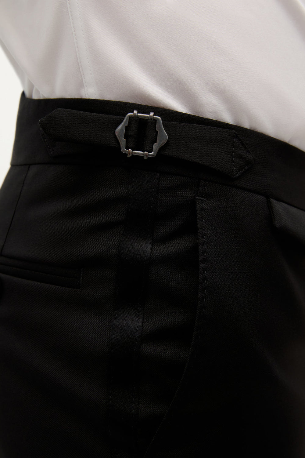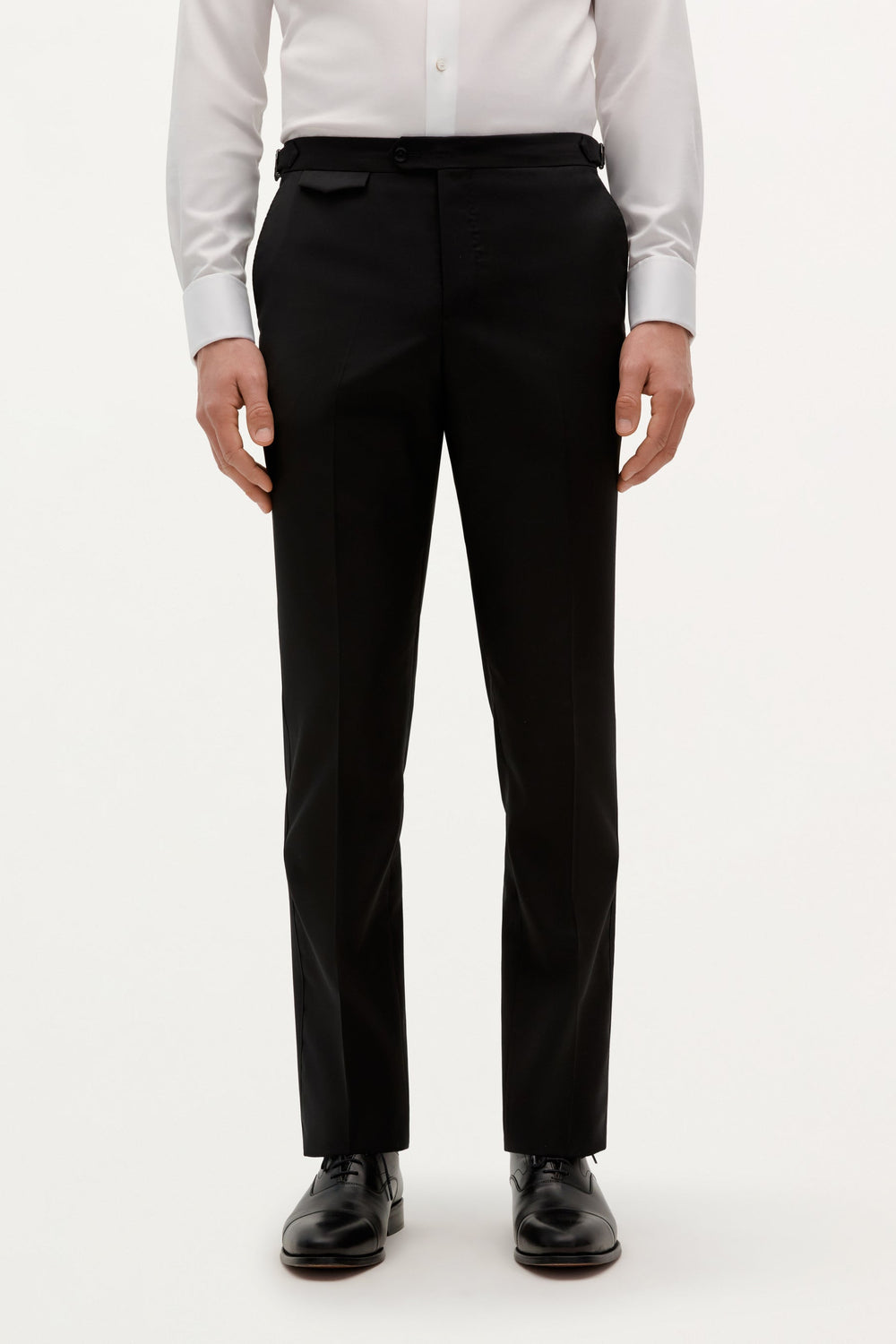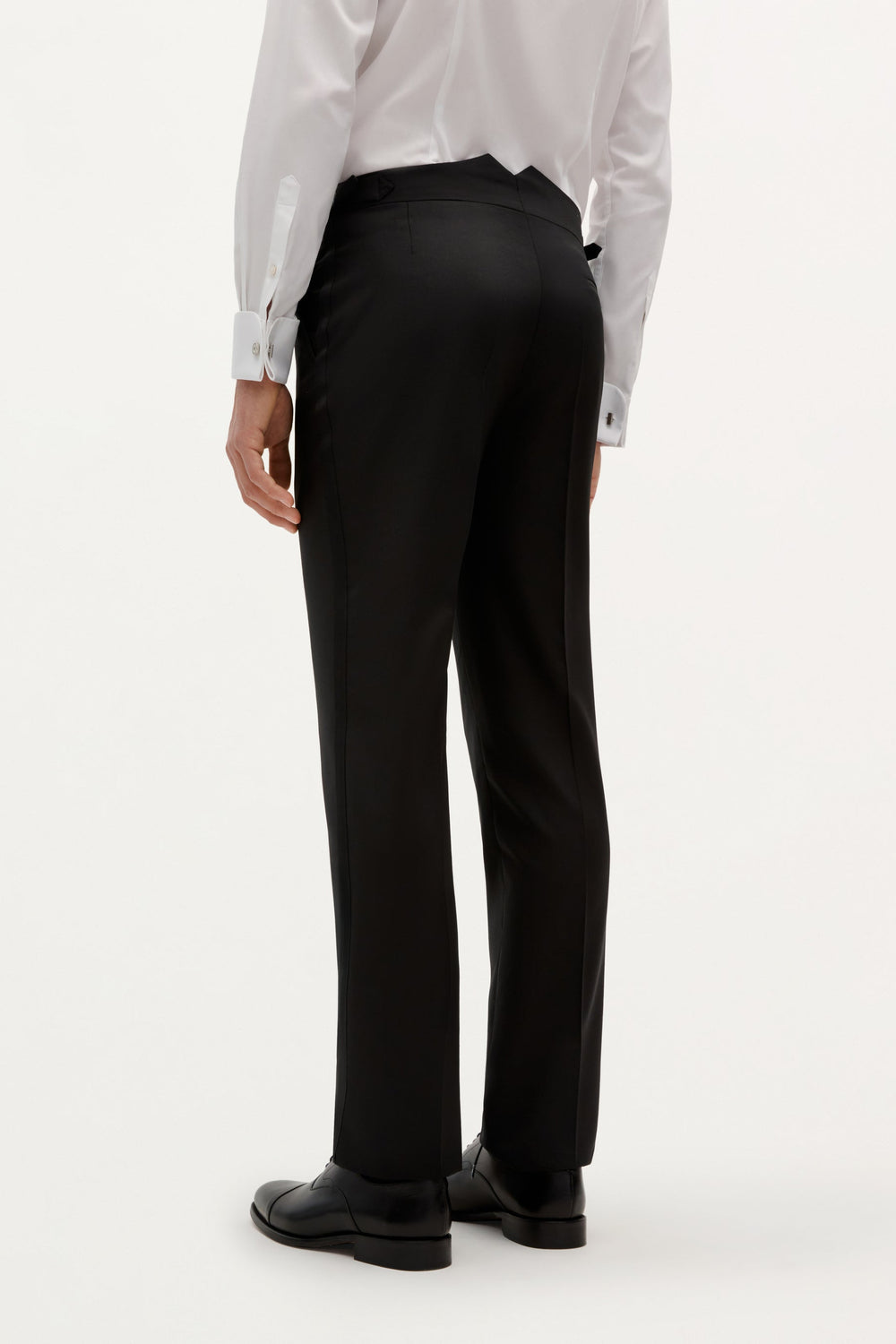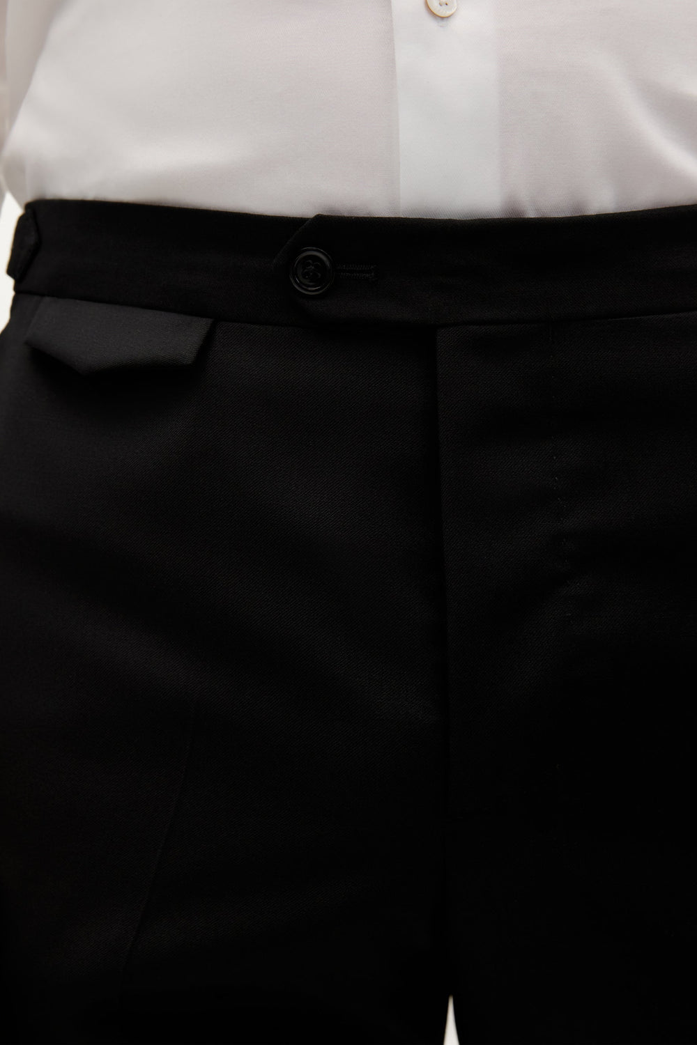 - Pantalón recto y fajín. Cierre prolongado con botón y cremallera. Botón para tirantes. Ceñidores laterales. Bajo sencillo sin vuelta. Bolsillos laterales y bolsillo trasero de doble vivo y botón.