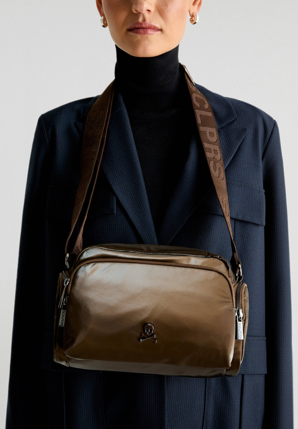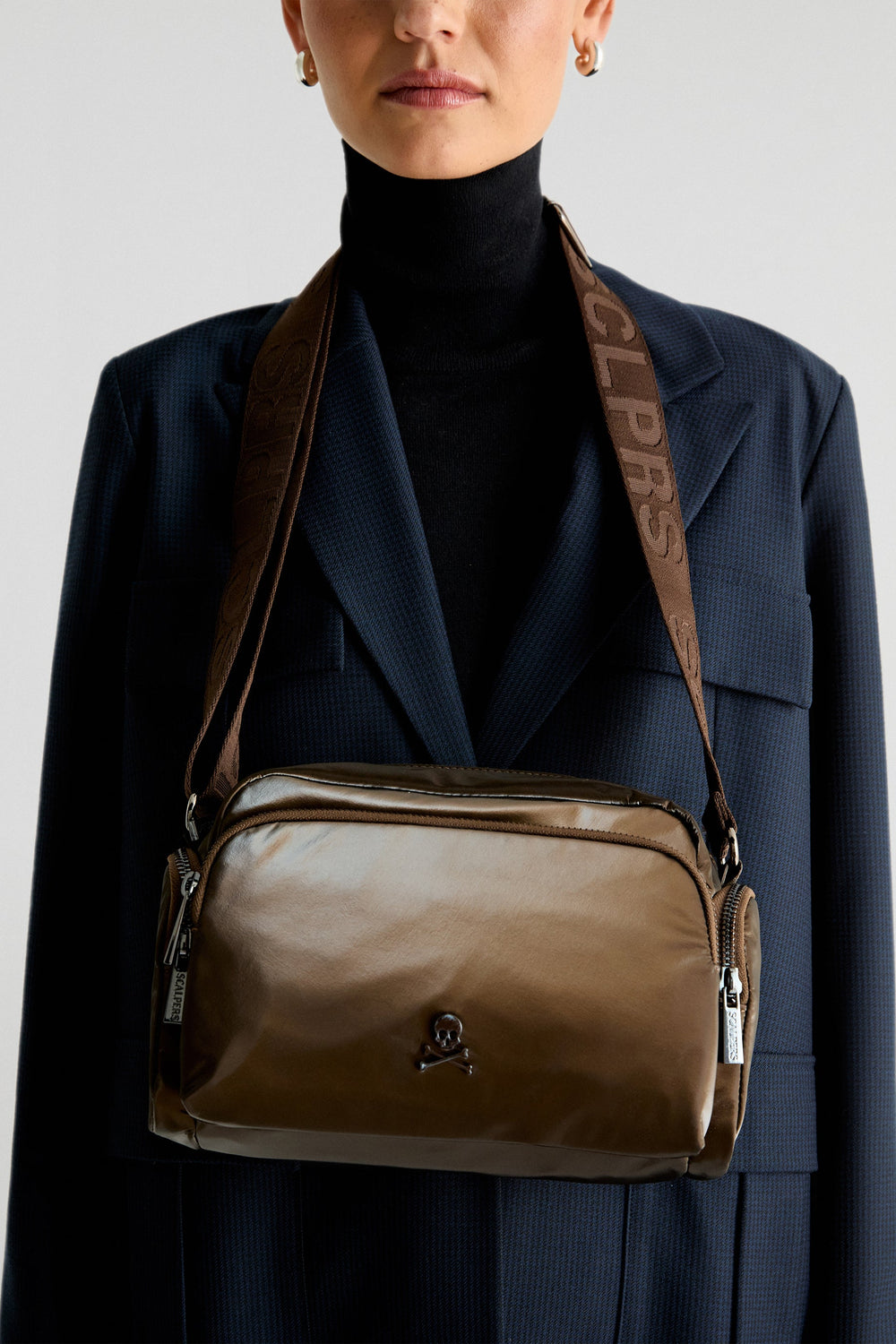 Bolso bandolera metalizado confeccionado en nylon. Asa larga ajustable y cierre con cremallera. Bolsillos delanteros y laterales con cremallera y calavera metálica.