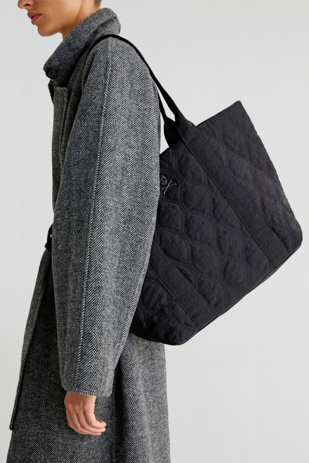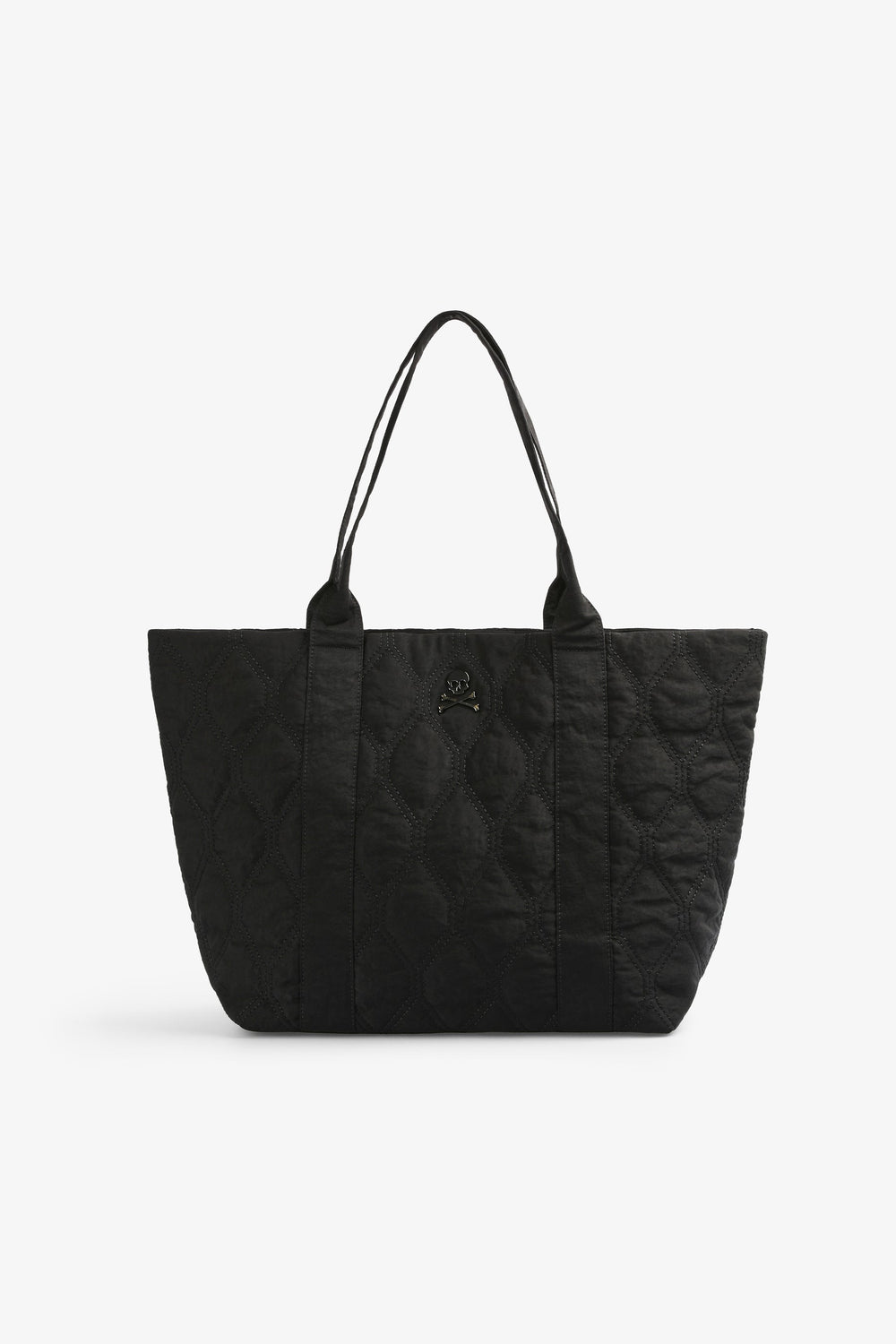 Bolso shopper acolchado confeccionado en nylon. Doble asa y cierre con snap. Bolsillo interior y calavera metálica.