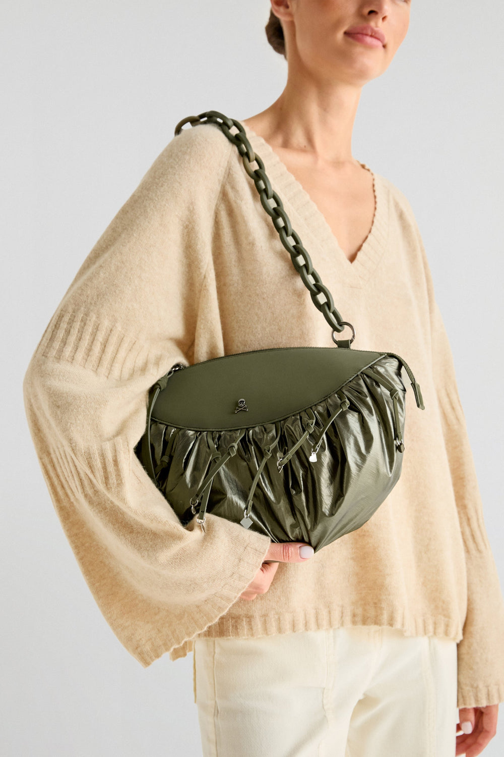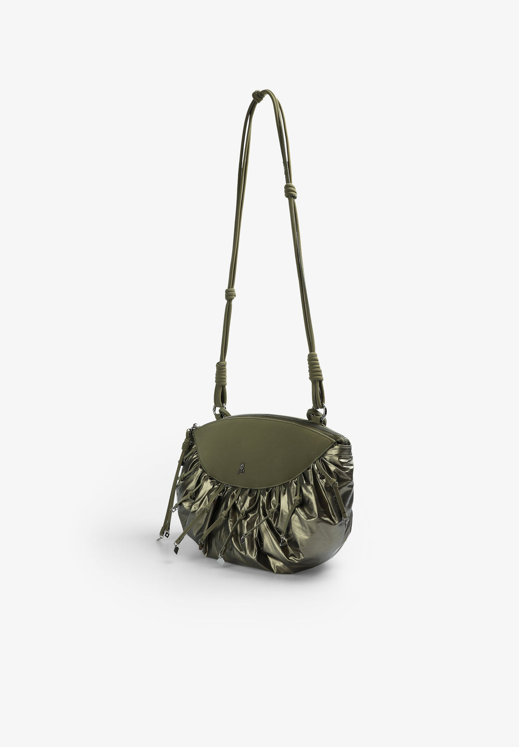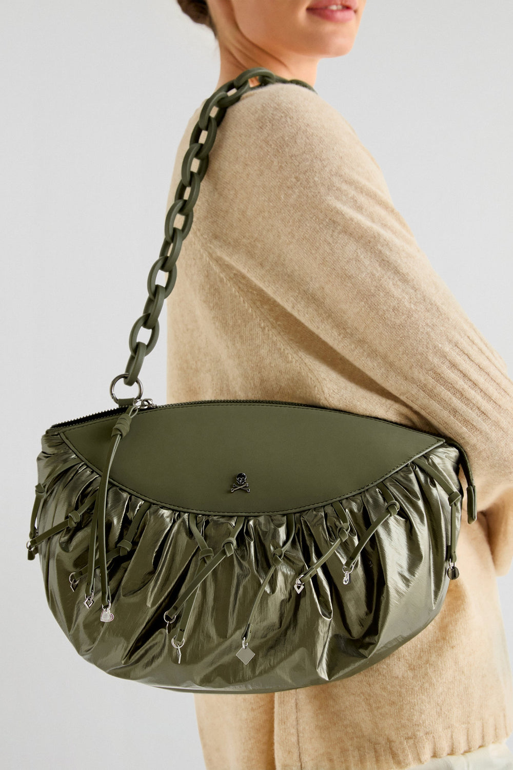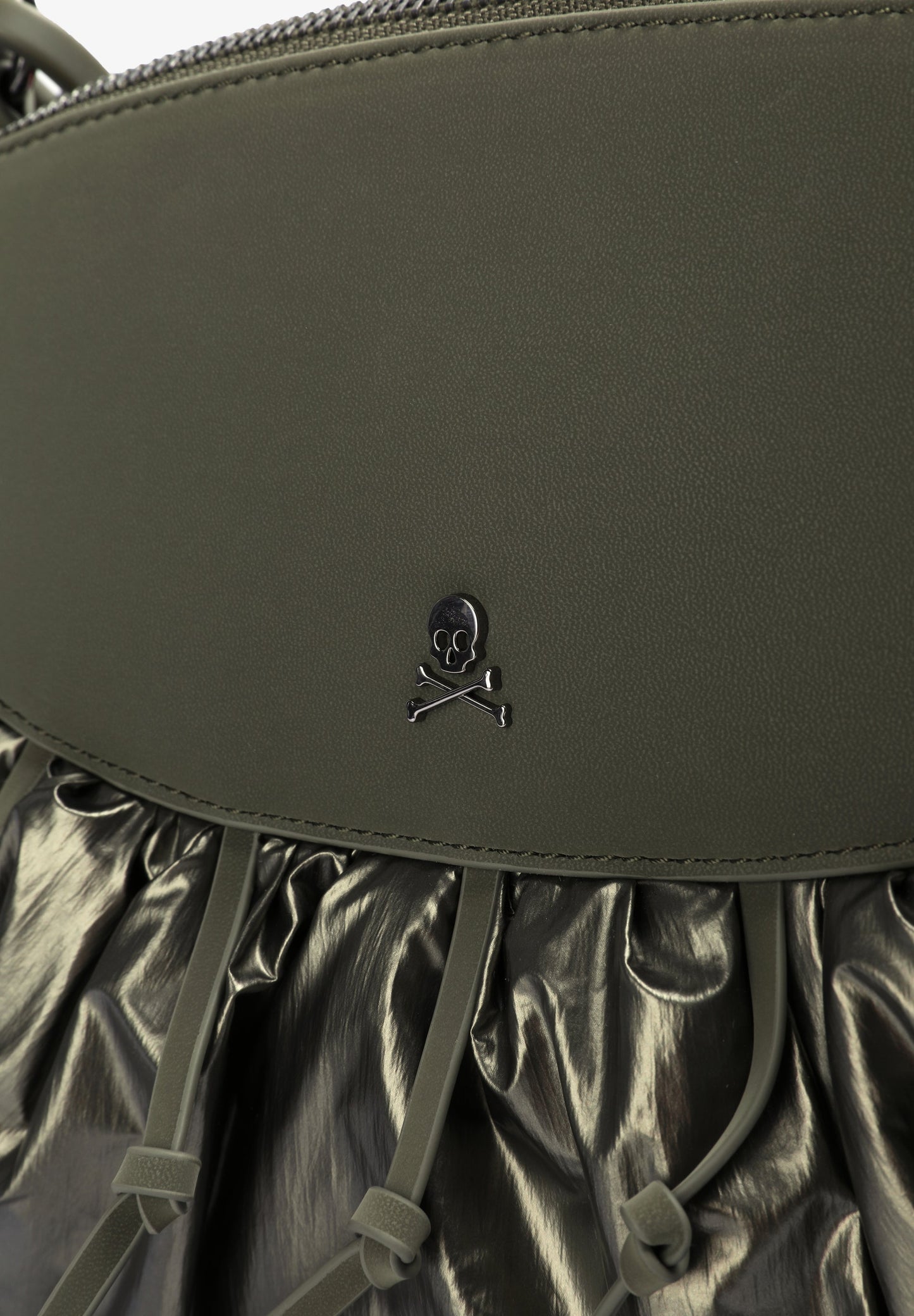 Bolso tipo clutch metalizado confeccionado en tejido de nylon. Cierre con cremallera, asa desmontable y calavera metálica.