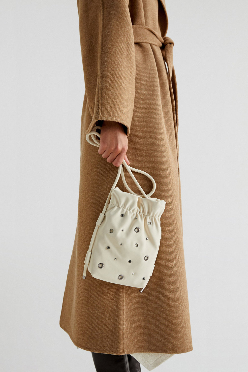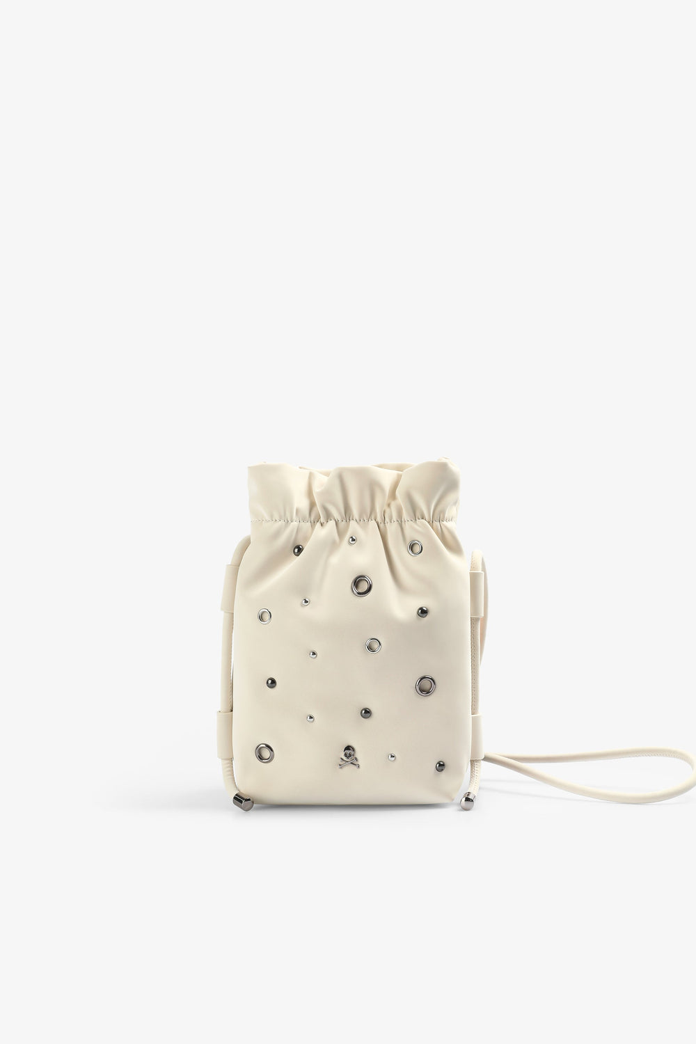 Bolso tipo saco mini confeccionado en nylon. Asas largas ajustables y cierre con imán. Detalle de tachuelas.