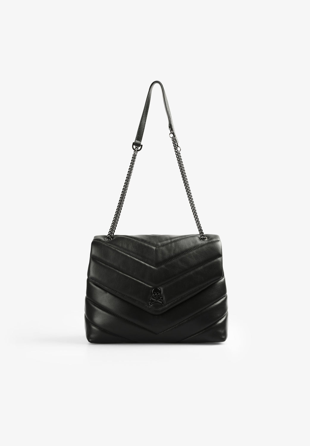 Bolso confeccionado en piel acolchado. Cierre con tapeta e imán y doble asa de cadena. Compartimentos interiores y calavera metálica.