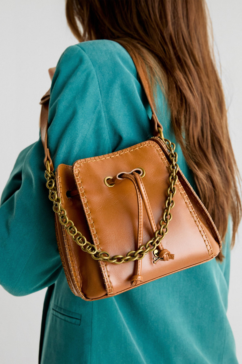 Bolso confeccionado en 100% piel. Cierre con tiras, asa larga ajustable desmontable y asa corta de cadena. Calavera metálica.