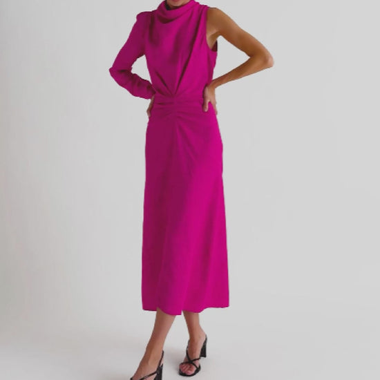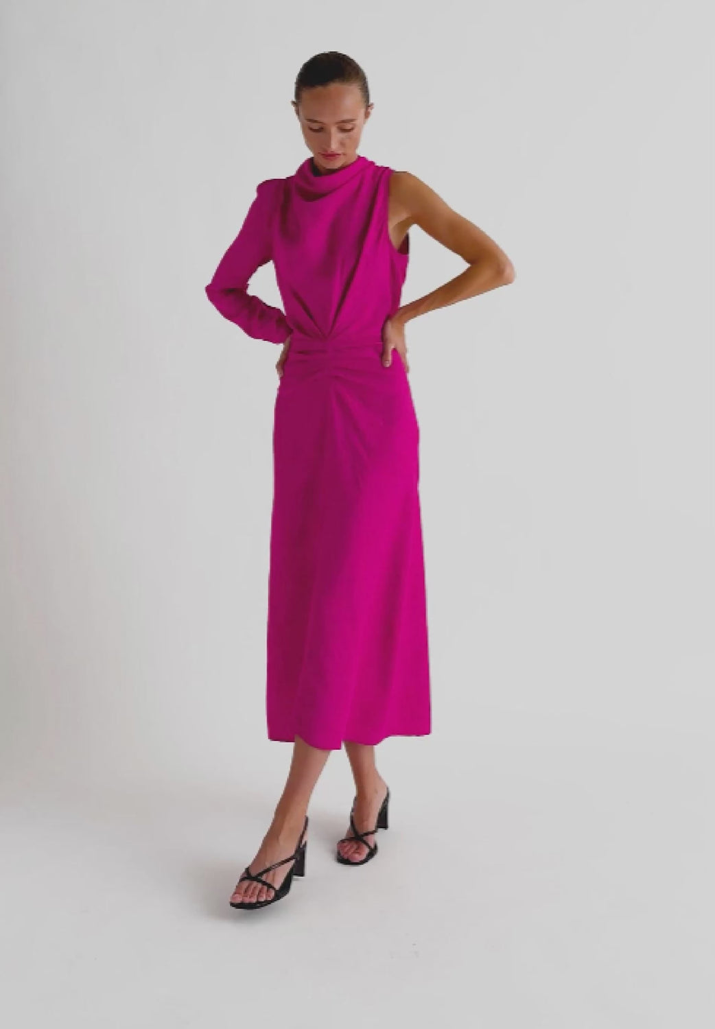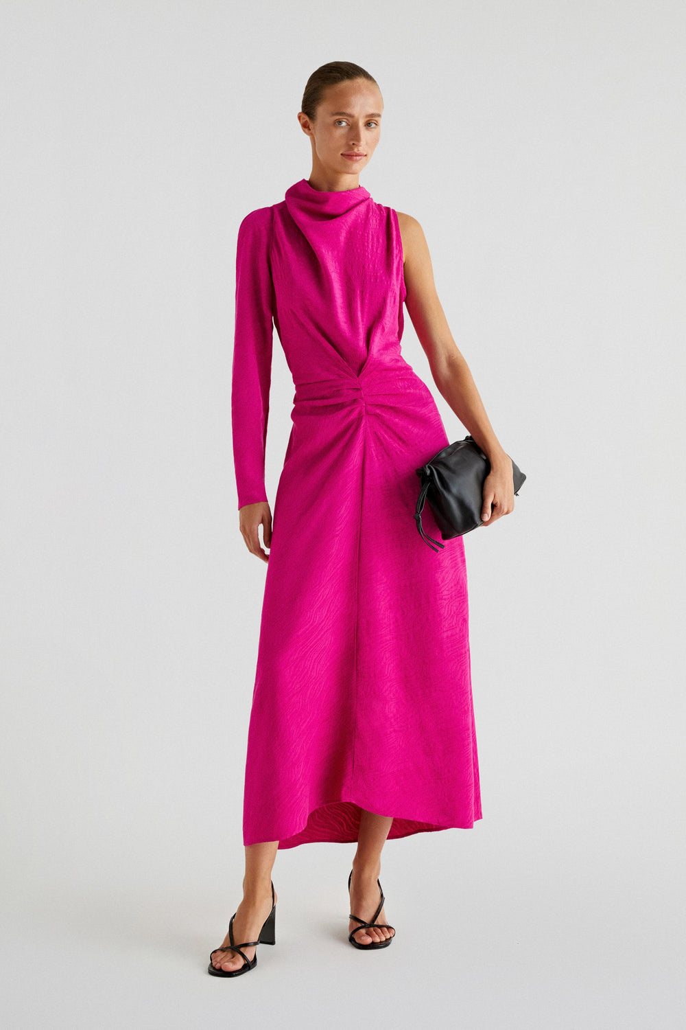 Vestido midi confeccionado en tejido de jacquard. Regular fit, cuello ligeramente subido y cierre con botones traseros. Manga asimétrica y drapeado delantero.
