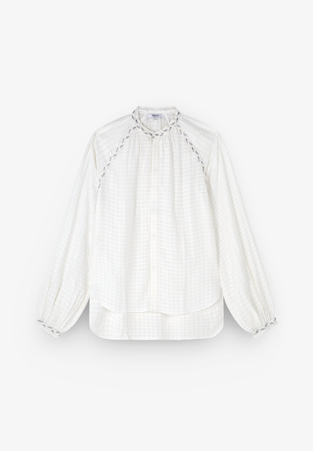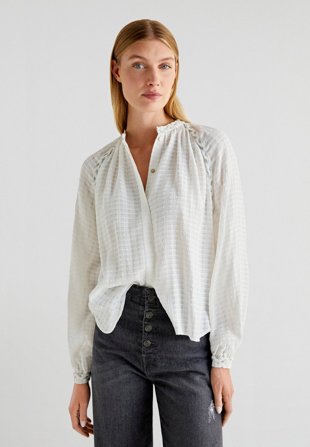Blusa confeccionada en tejido ligero. Regular fit, cuello redondo con botones y manga larga ranglan terminada en puño con botón. Detalles trenzados en hombro.