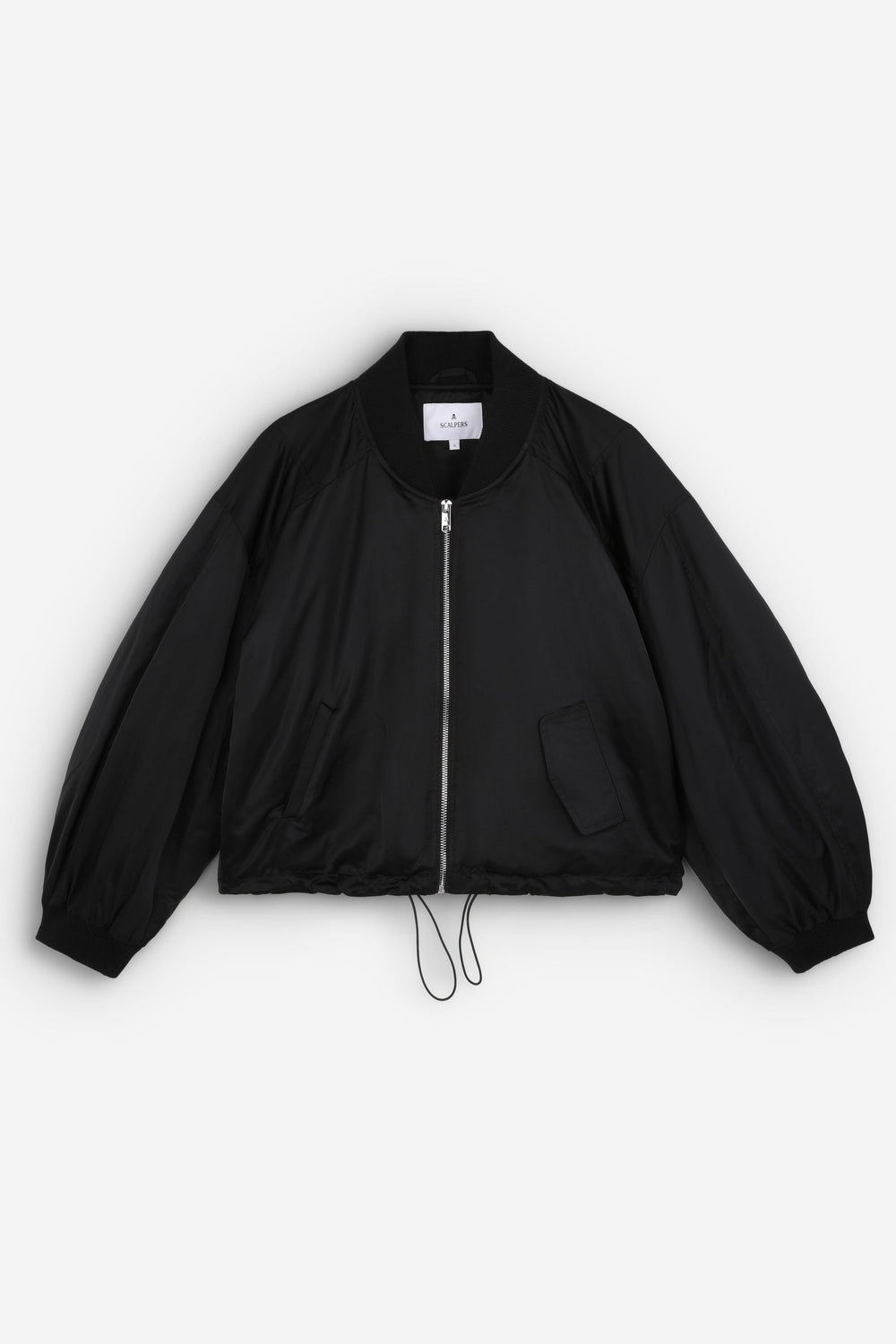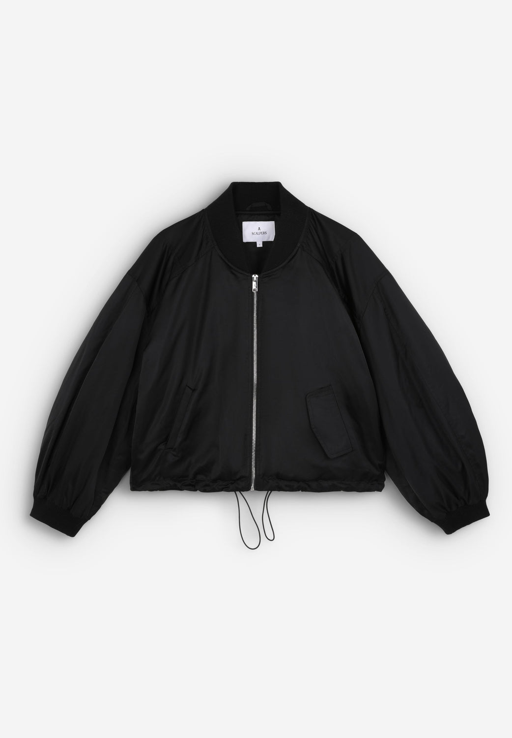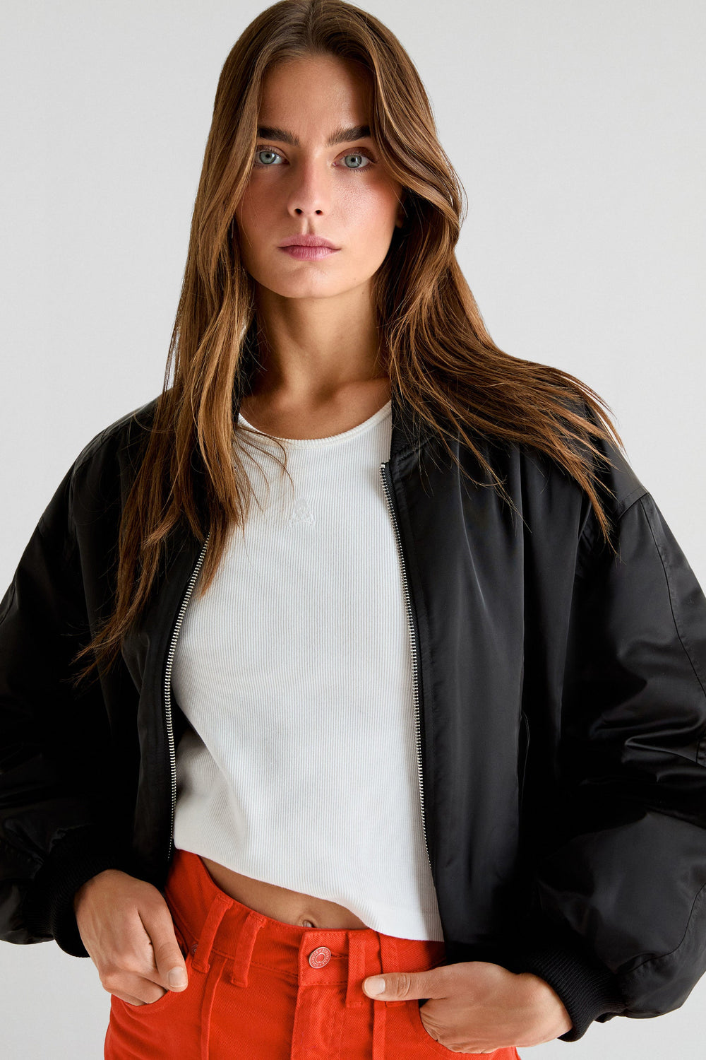 Chaqueta tipo bomber confeccionada en tejido técnico. Regular fit, cuello subido y cierre con cremallera. Manga larga terminada en puño y bolsillos laterales. Ajustador en el bajo.