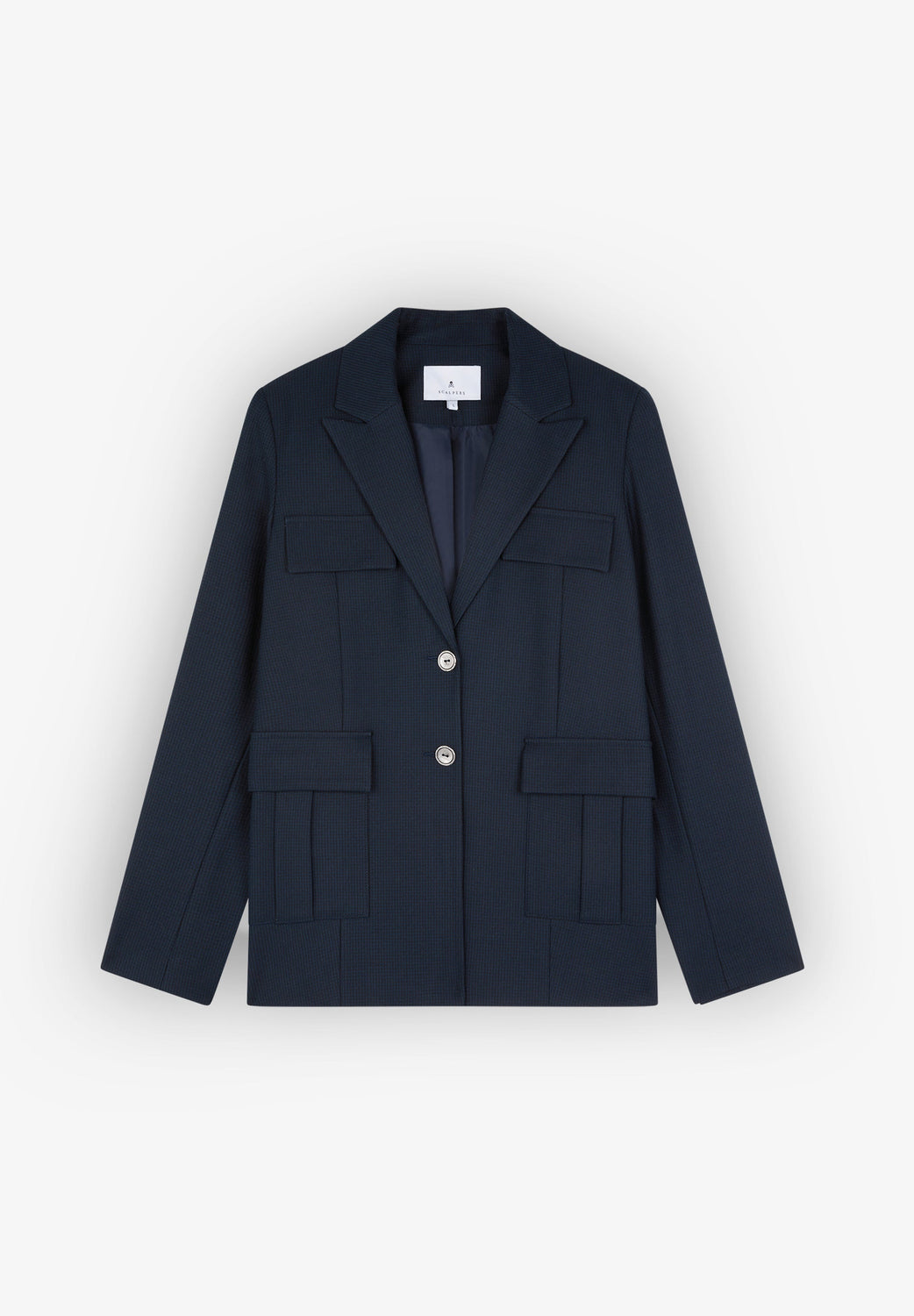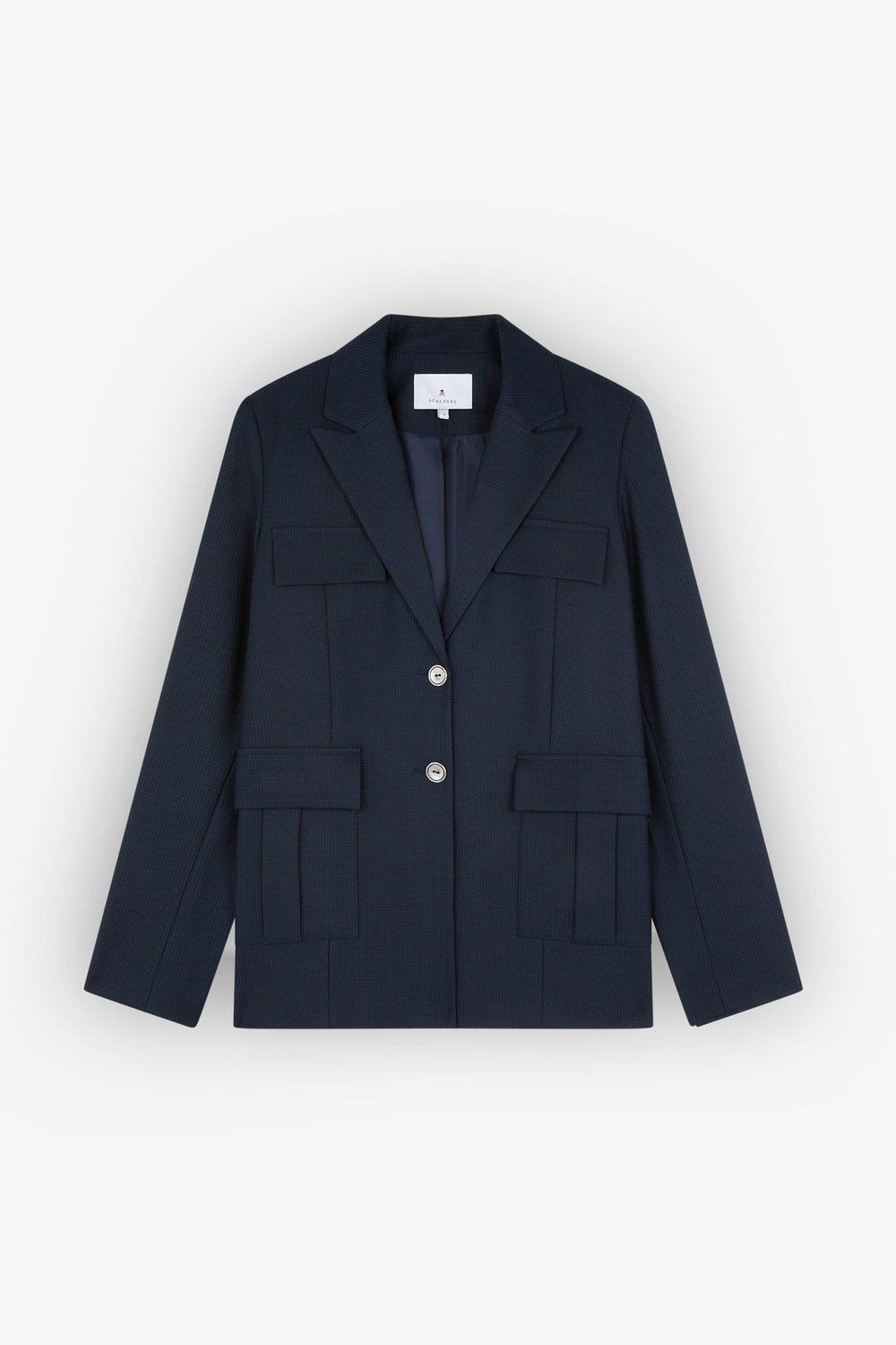 Blazer confeccionada en tejido fluido. Regular fit, cierre con botones y cuello con solapas. Manga larga terminada en botones y bolsillos de parche. Abertura trasera.