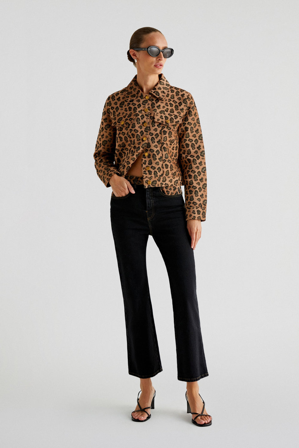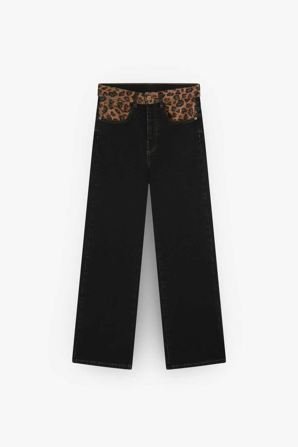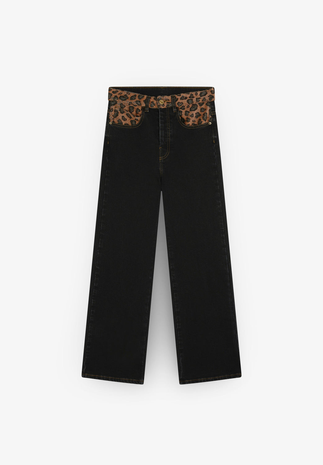Jeans confeccionados en tejido ligeramente elástico. Corte recto relaxed con tiro alto y cierre con botón y cremallera. Bolsillos y trabillas en cintura. Detalle de animal print.