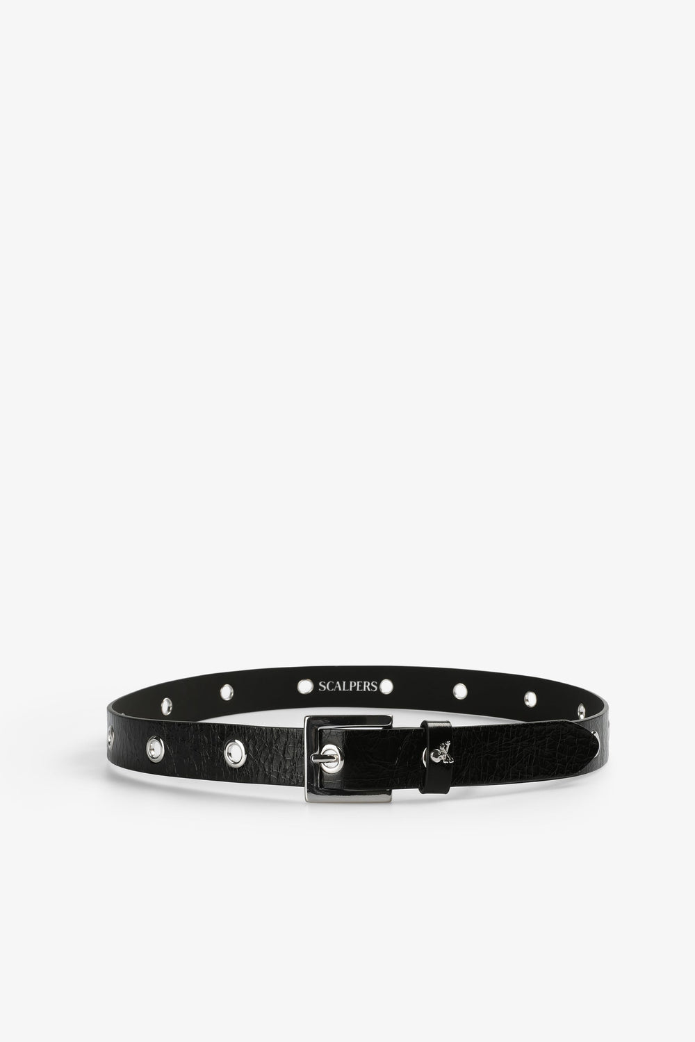 Cinturón con ojales confeccionado en 100% piel. Hebilla metálica.