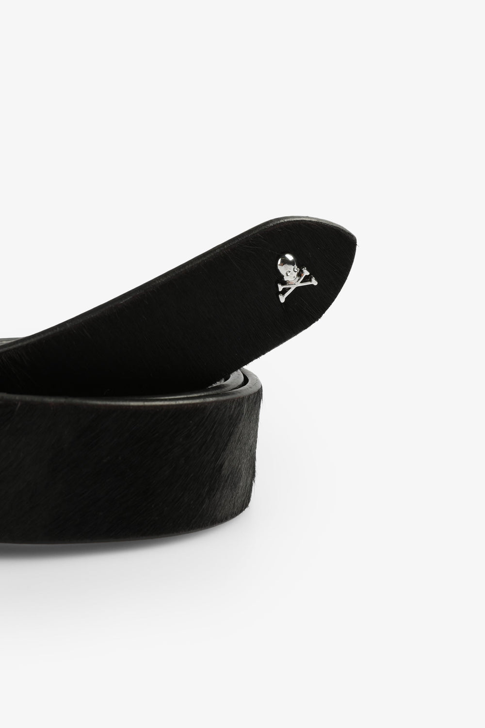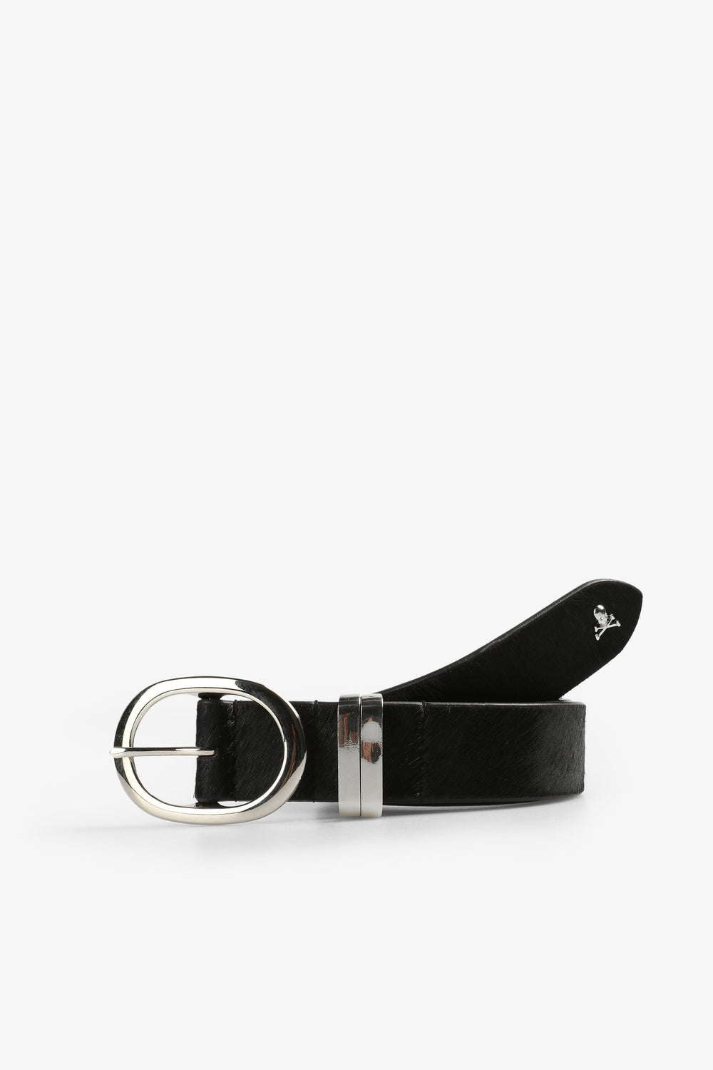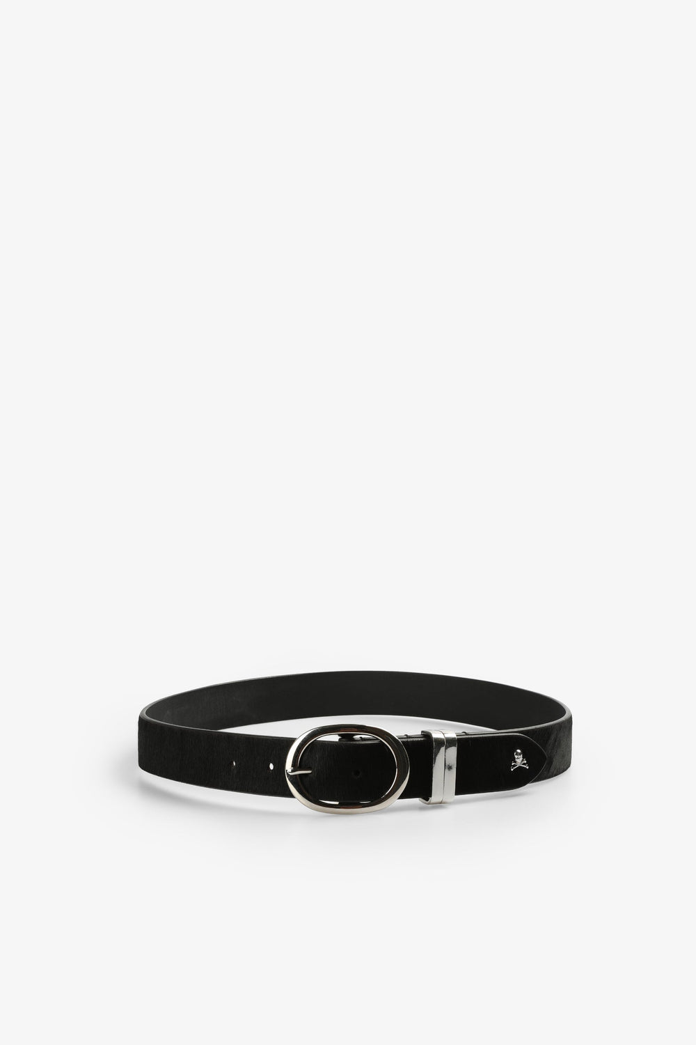 Cinturón confeccionado en 100% piel con acabado de pelo. Hebilla metálica y terminación en calavera metálica.