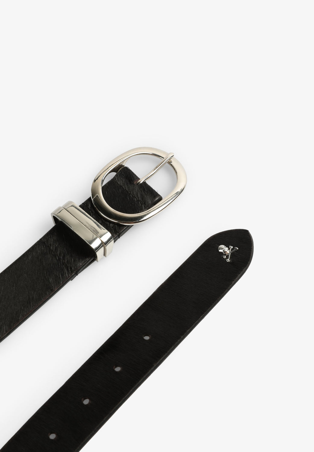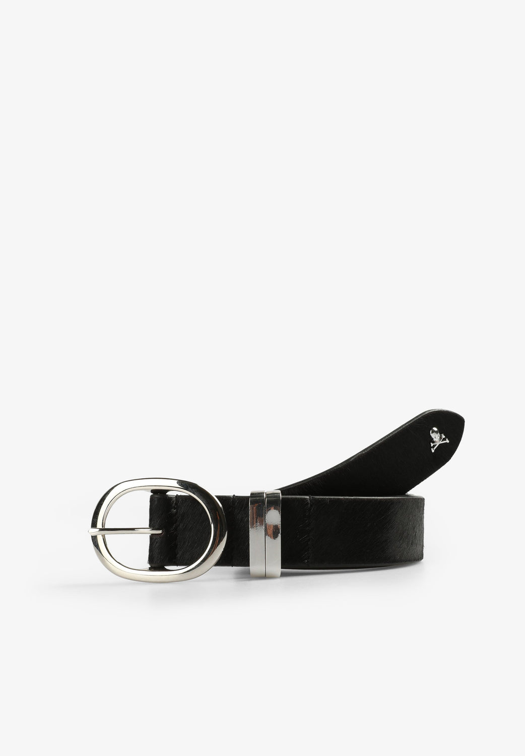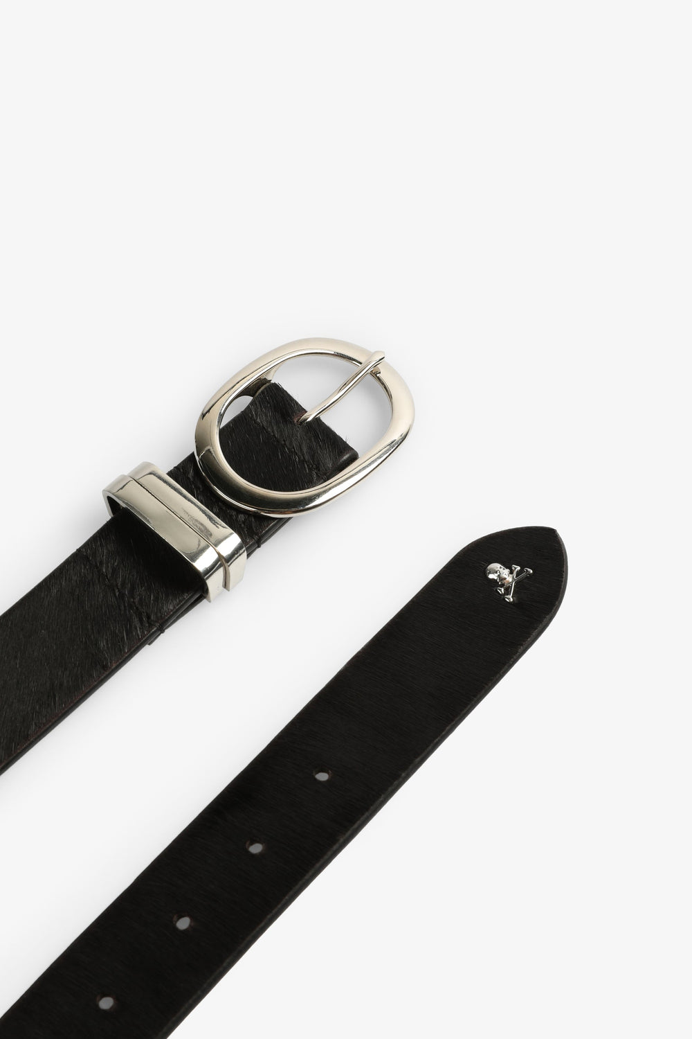 Cinturón confeccionado en 100% piel con acabado de pelo. Hebilla metálica y terminación en calavera metálica.