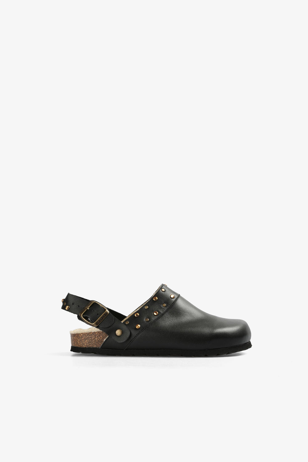 Zueco confeccionado en 100% piel. Cierre con tira trasera ajustable, suela de goma y corcho y tachuelas.