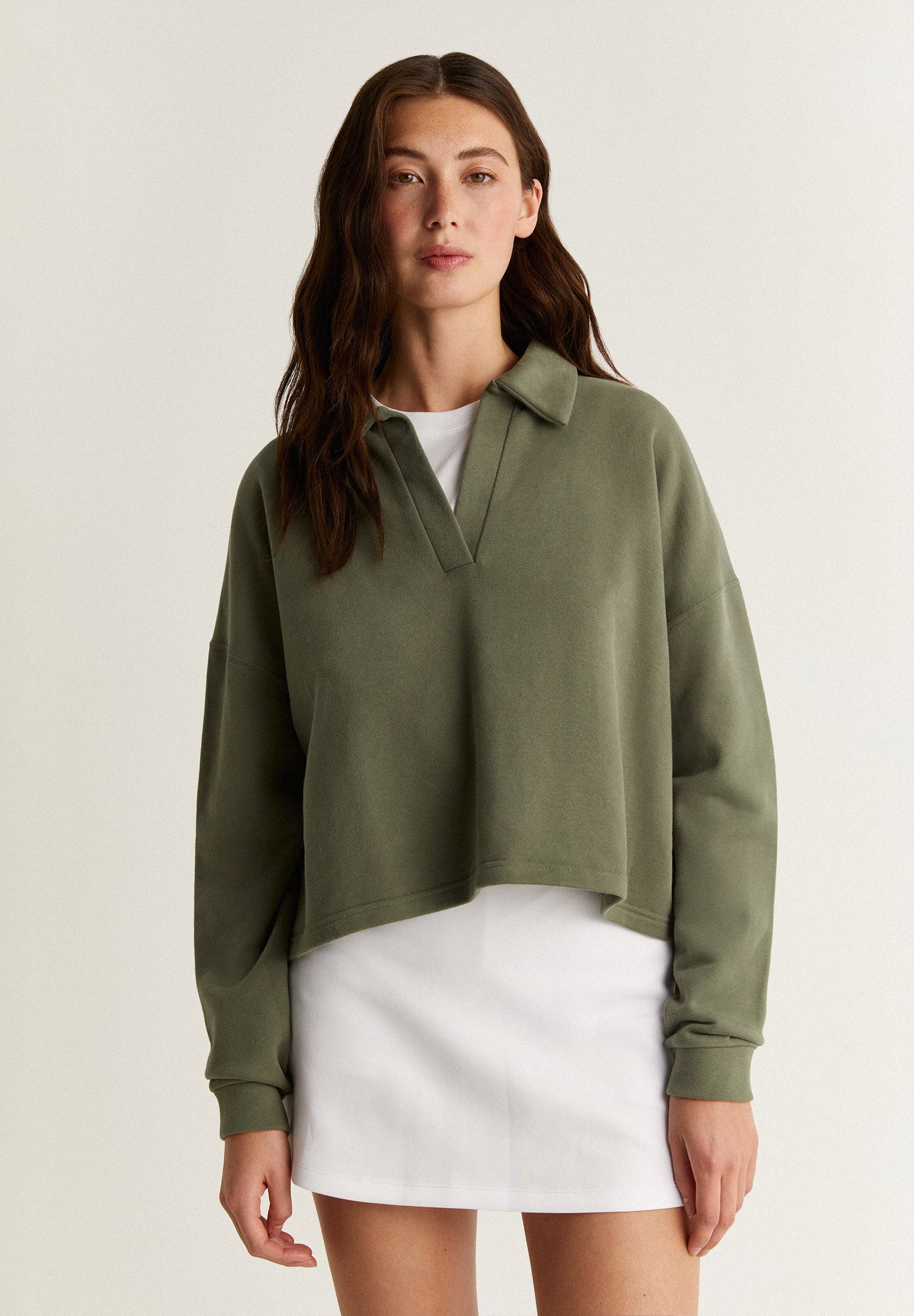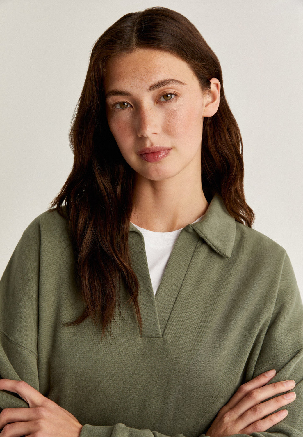 Sudadera deportiva confeccionada en 100% algodón BCI. Ligeramente cropped, cuello tipo polo y manga larga. Logo bordado trasero.