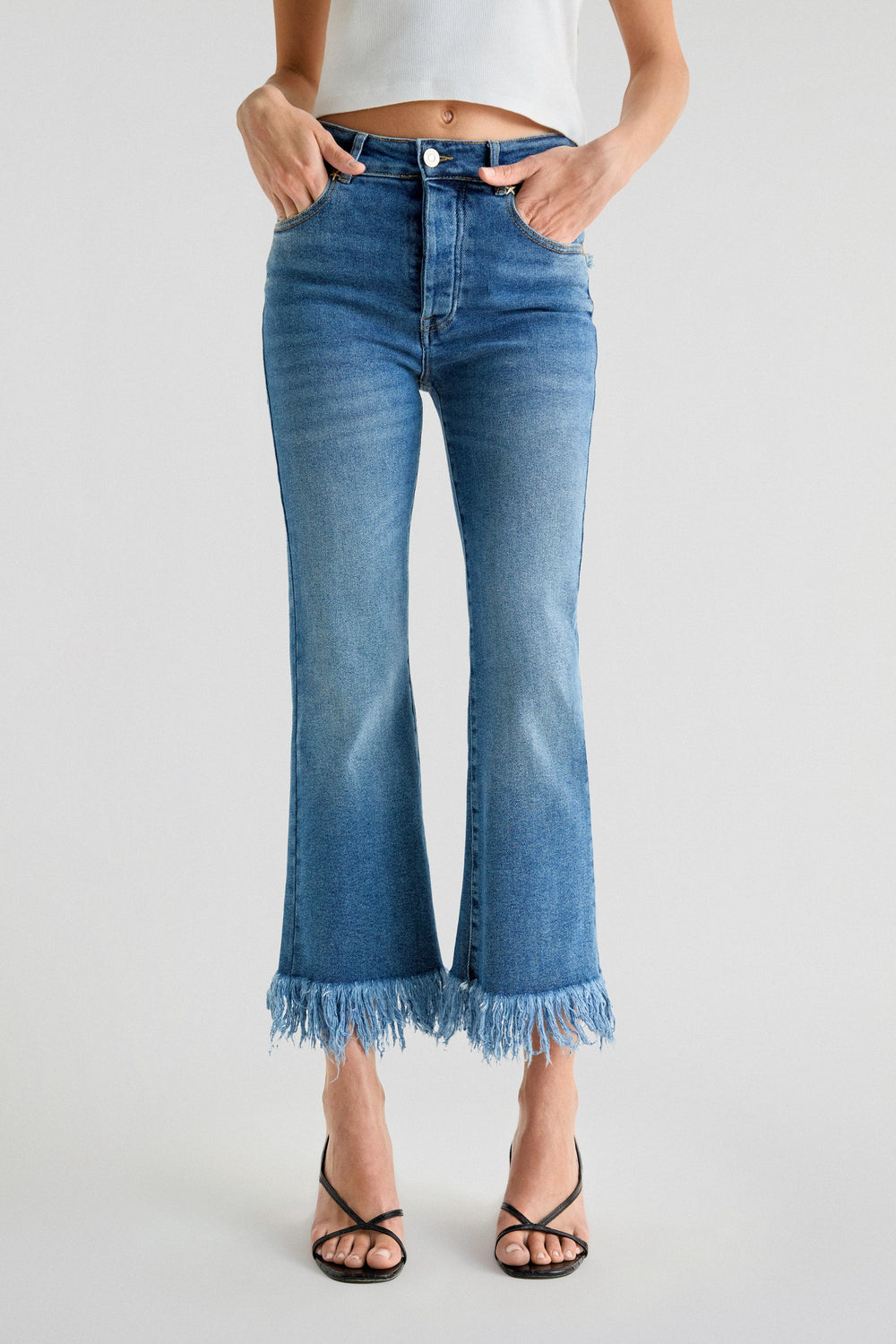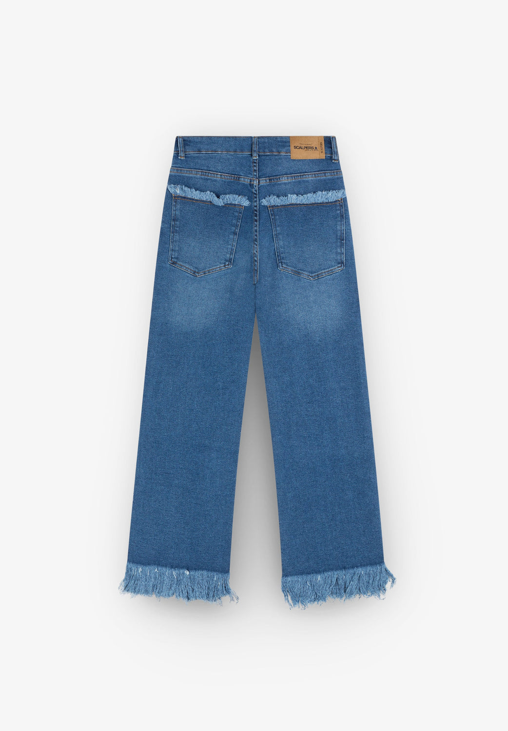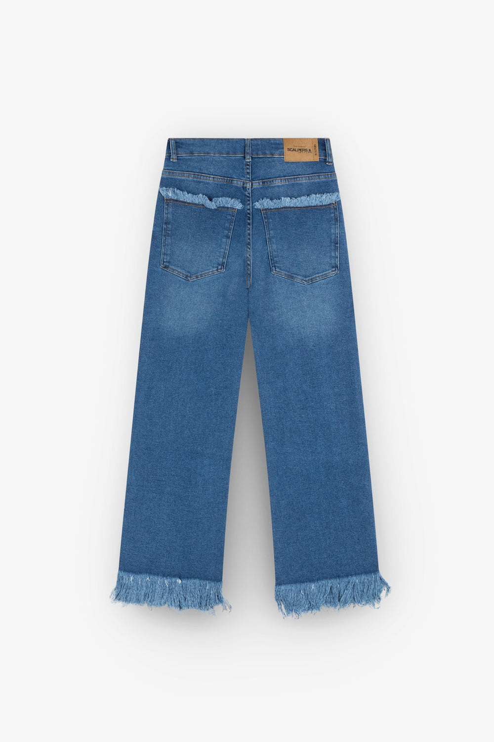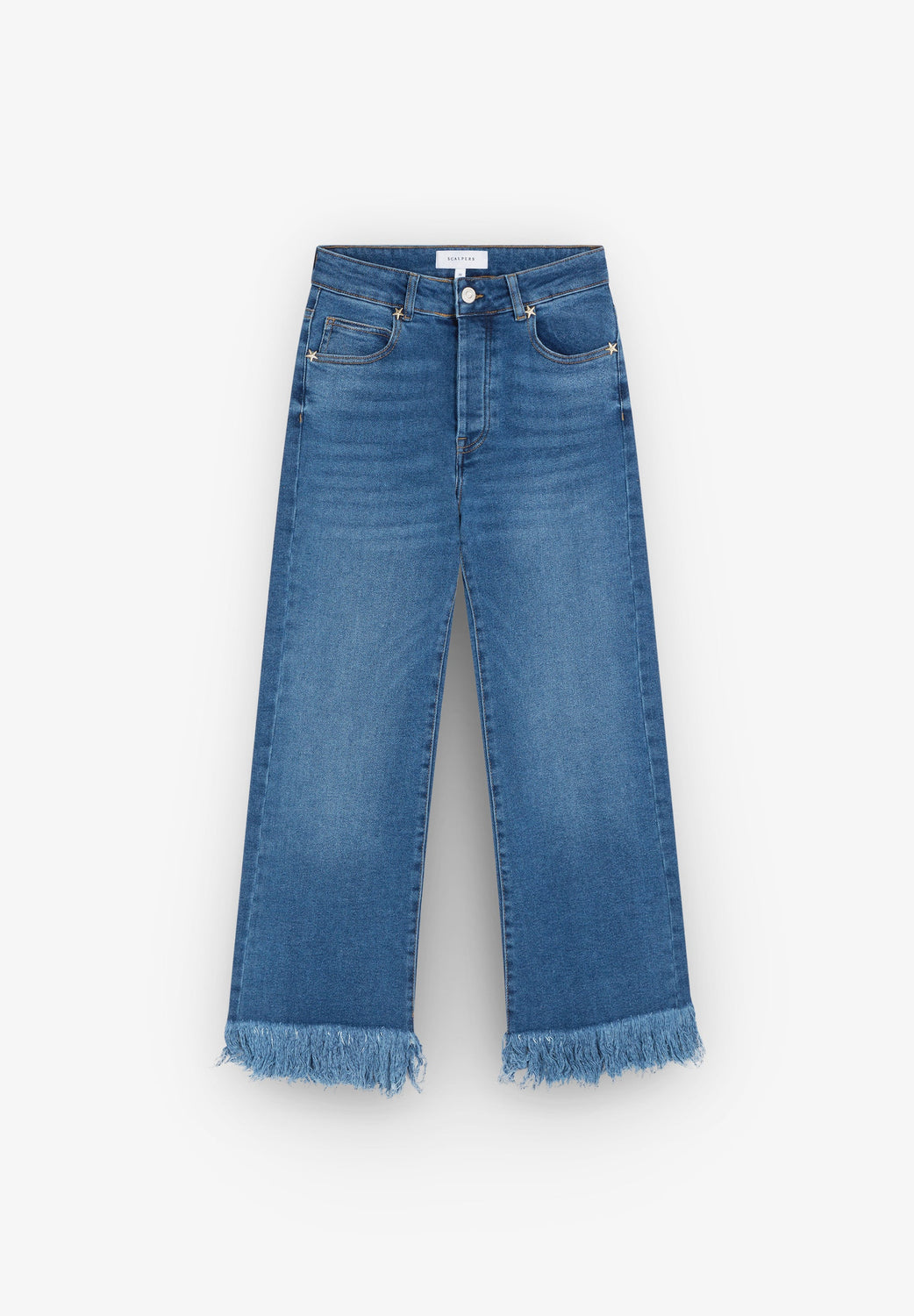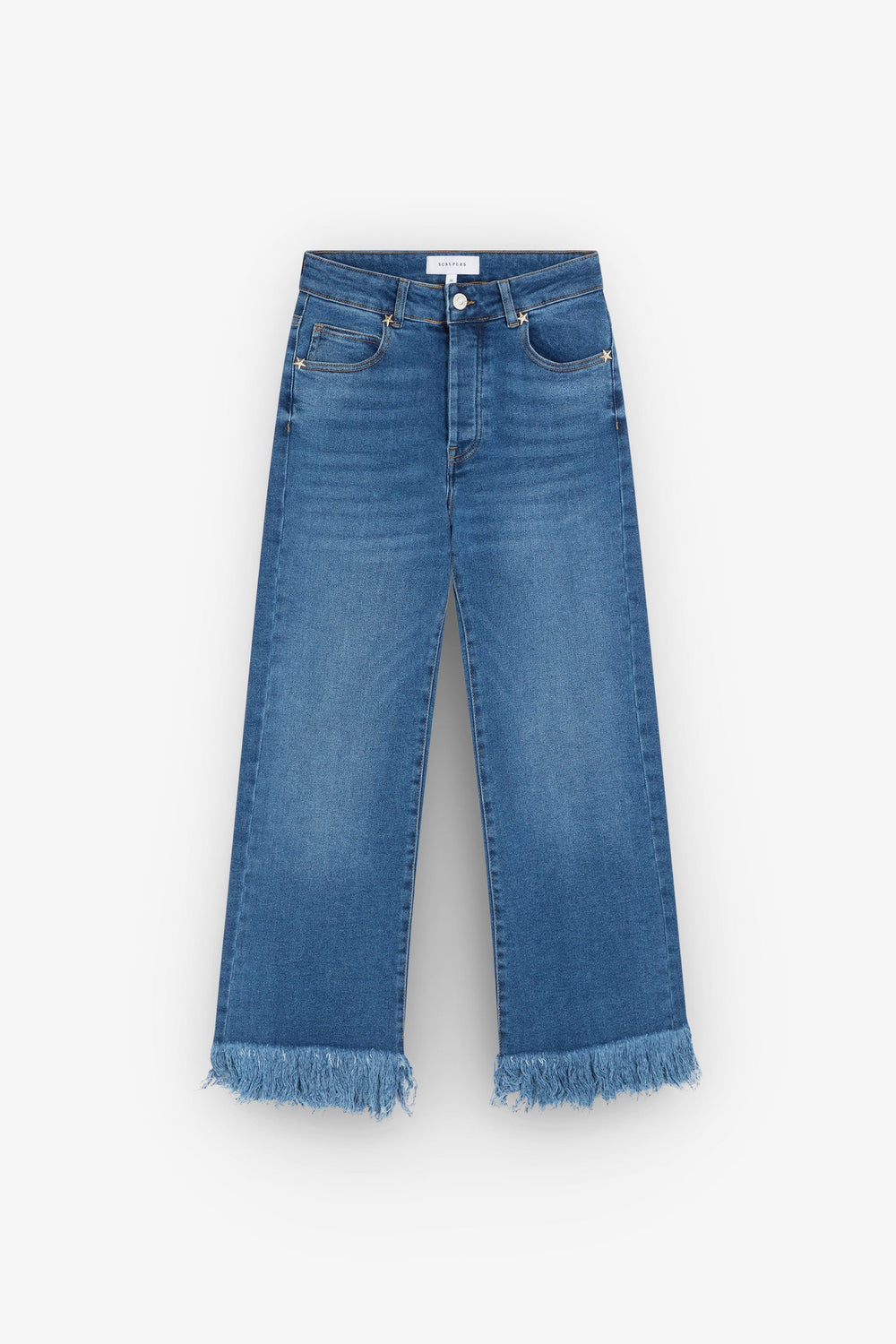 Jeans culotte. Cierre con botón y cremallera, bolsillos y bajo desflecado. Tiene trabillas.