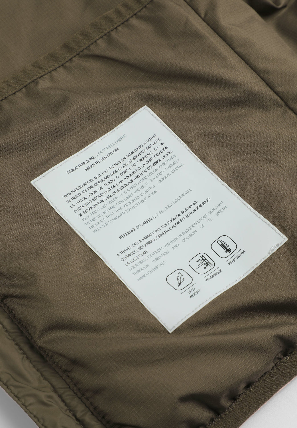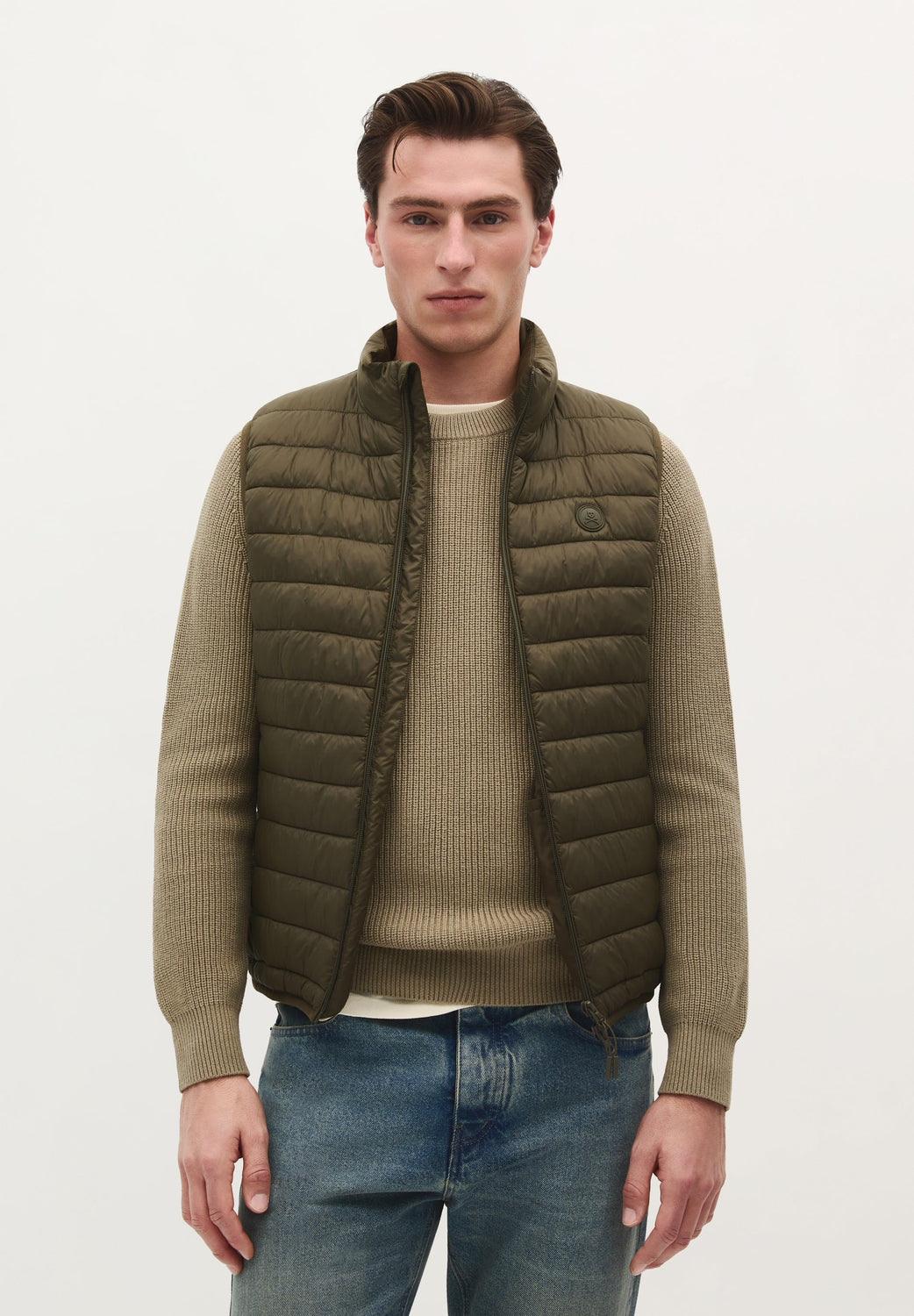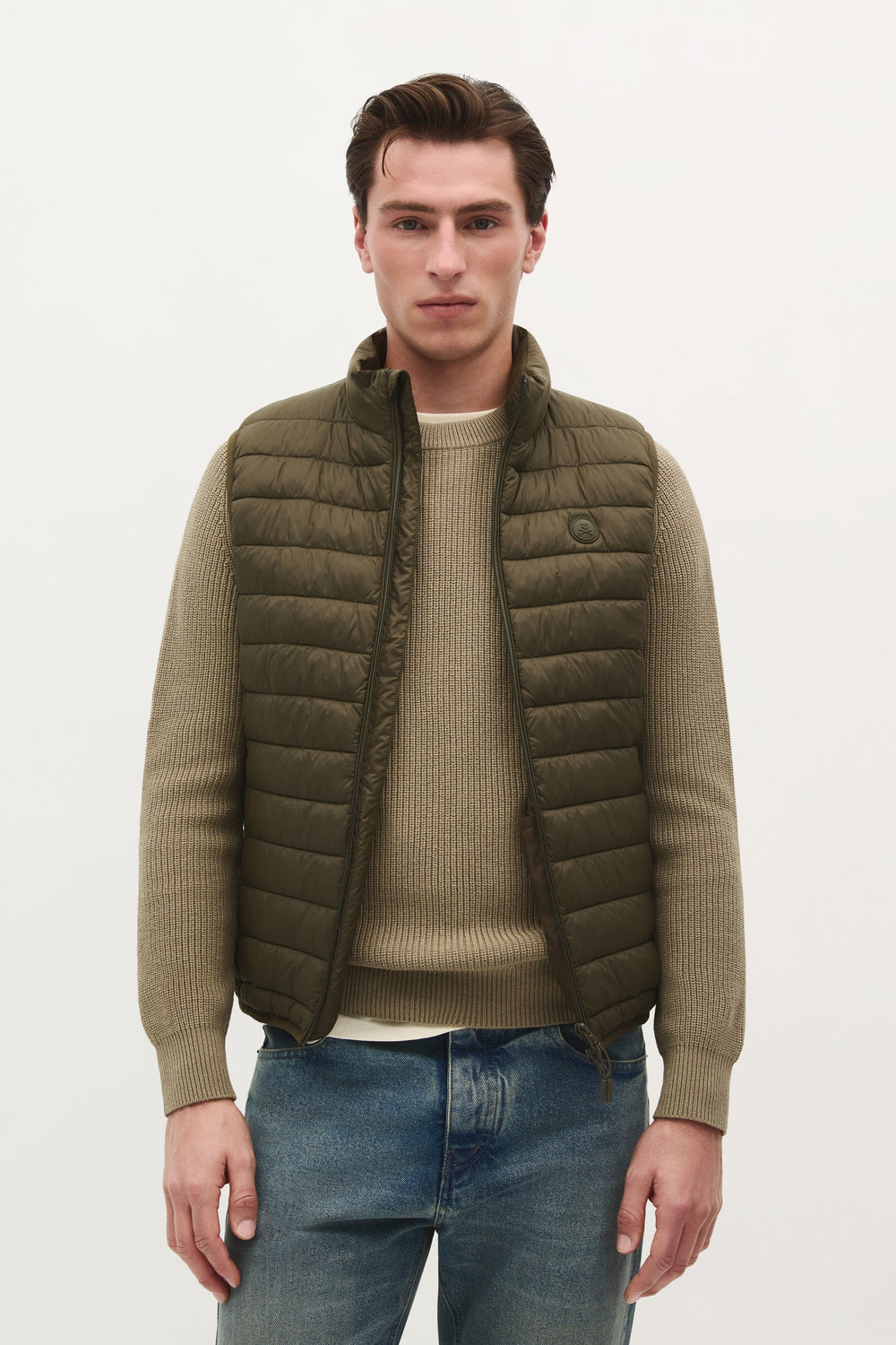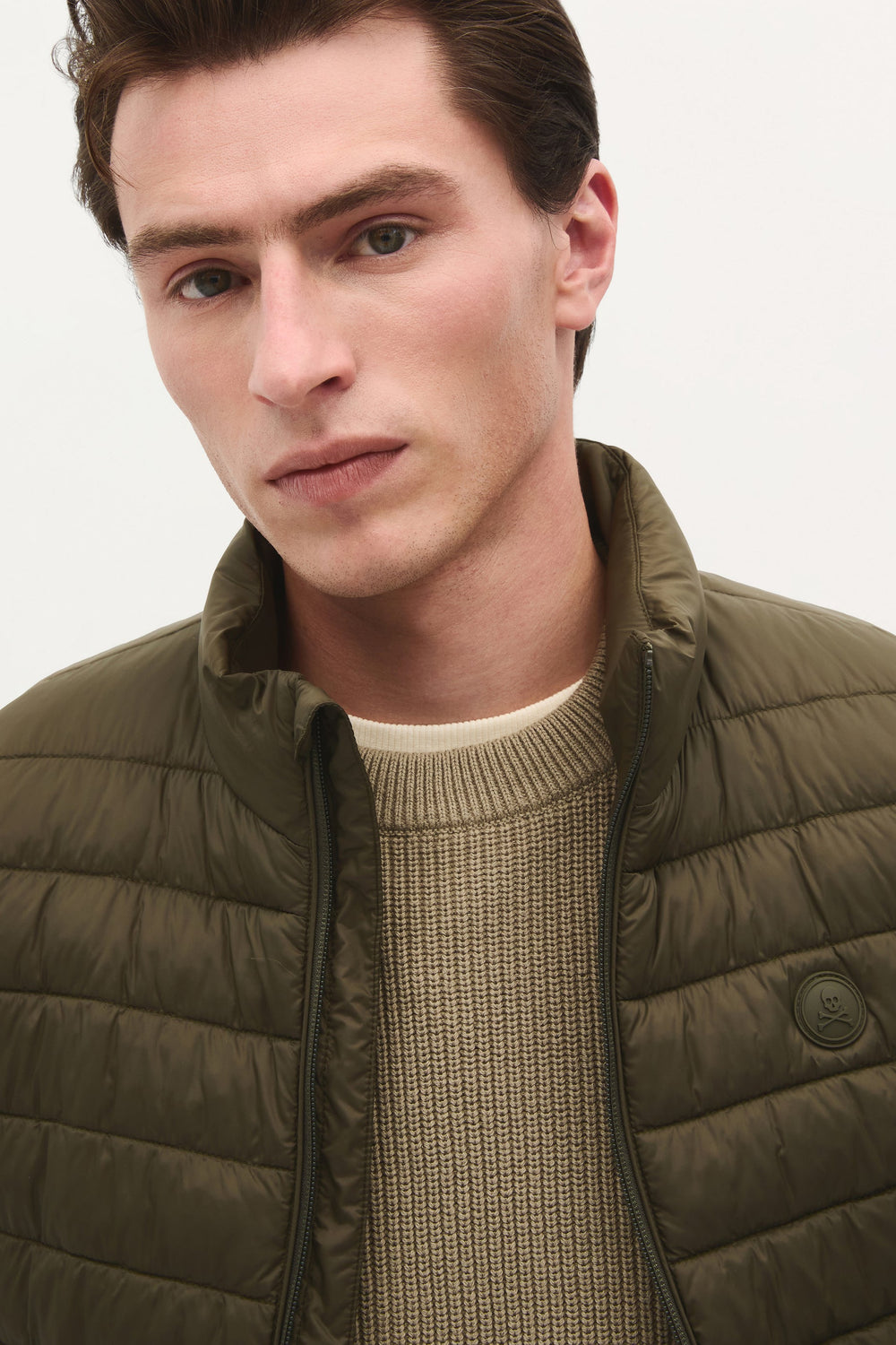 Chaleco acolchado confeccionado en tejido reciclado. Regular fit, cuello subido y cierre con cremallera de doble carro. Manga en sisa y bolsillos laterales con cremallera. Parche de calavera en pecho.