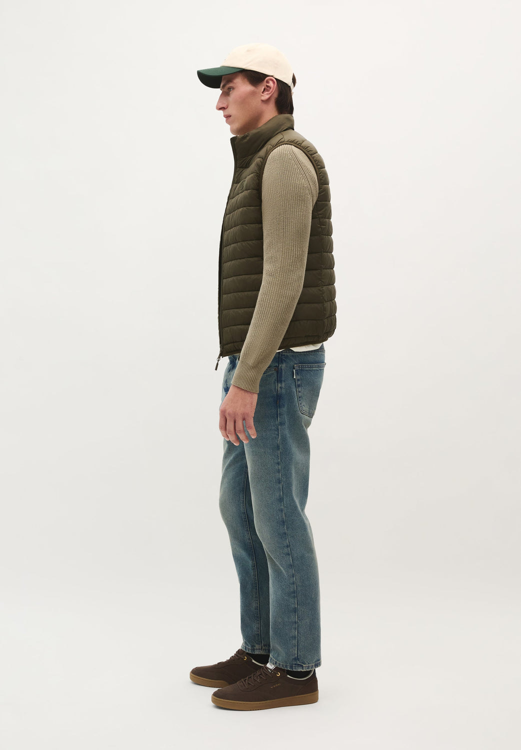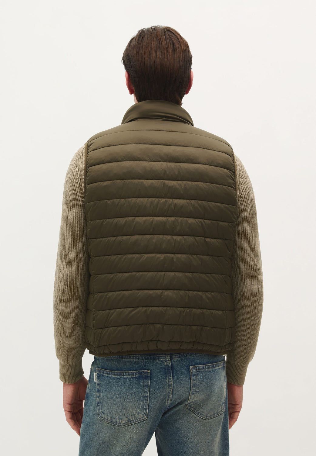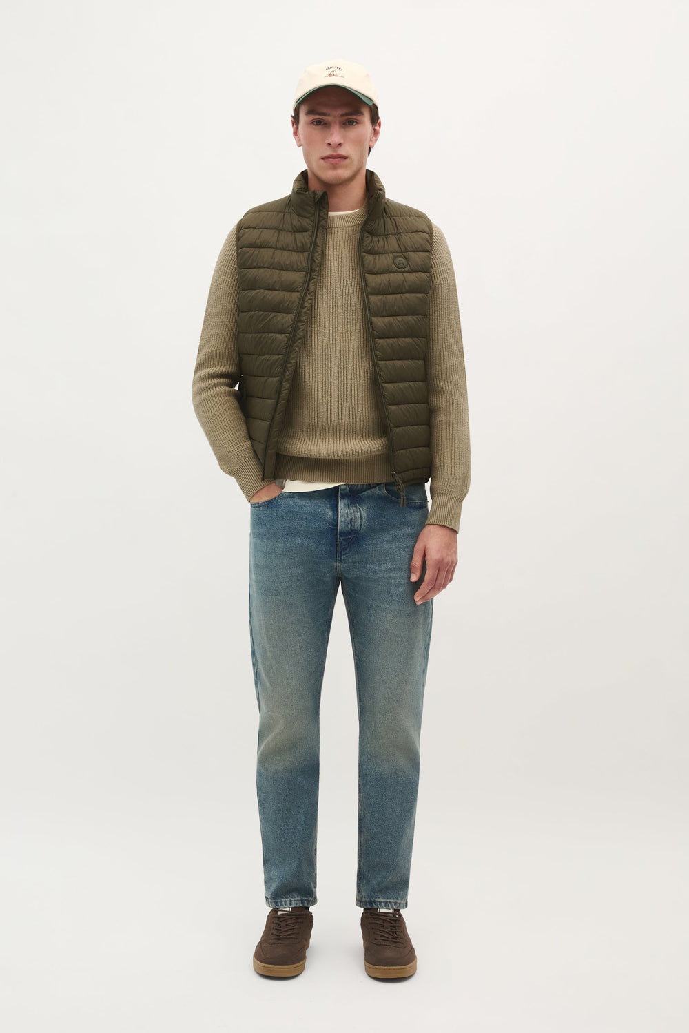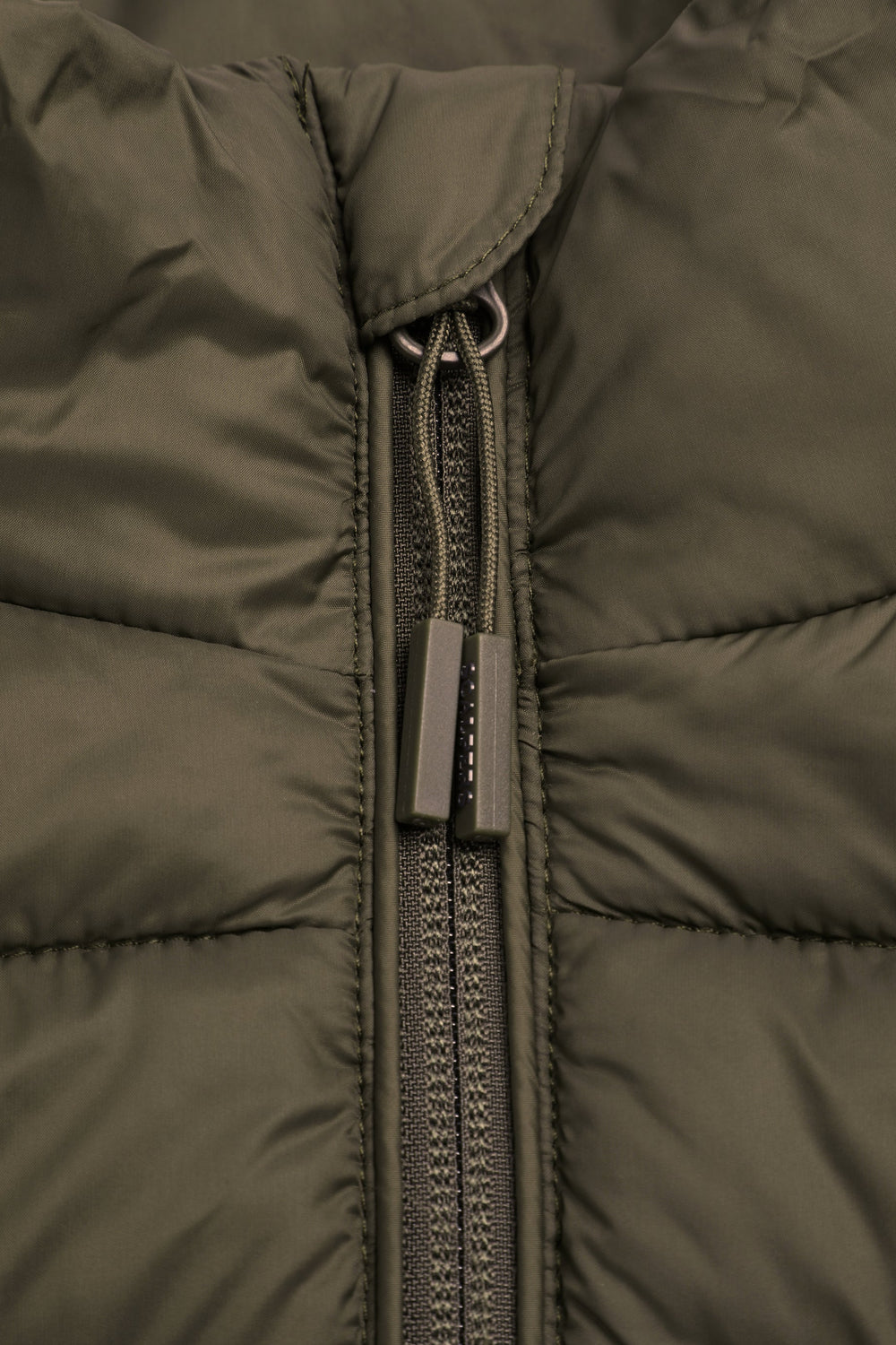Chaleco acolchado confeccionado en tejido reciclado. Regular fit, cuello subido y cierre con cremallera de doble carro. Manga en sisa y bolsillos laterales con cremallera. Parche de calavera en pecho.