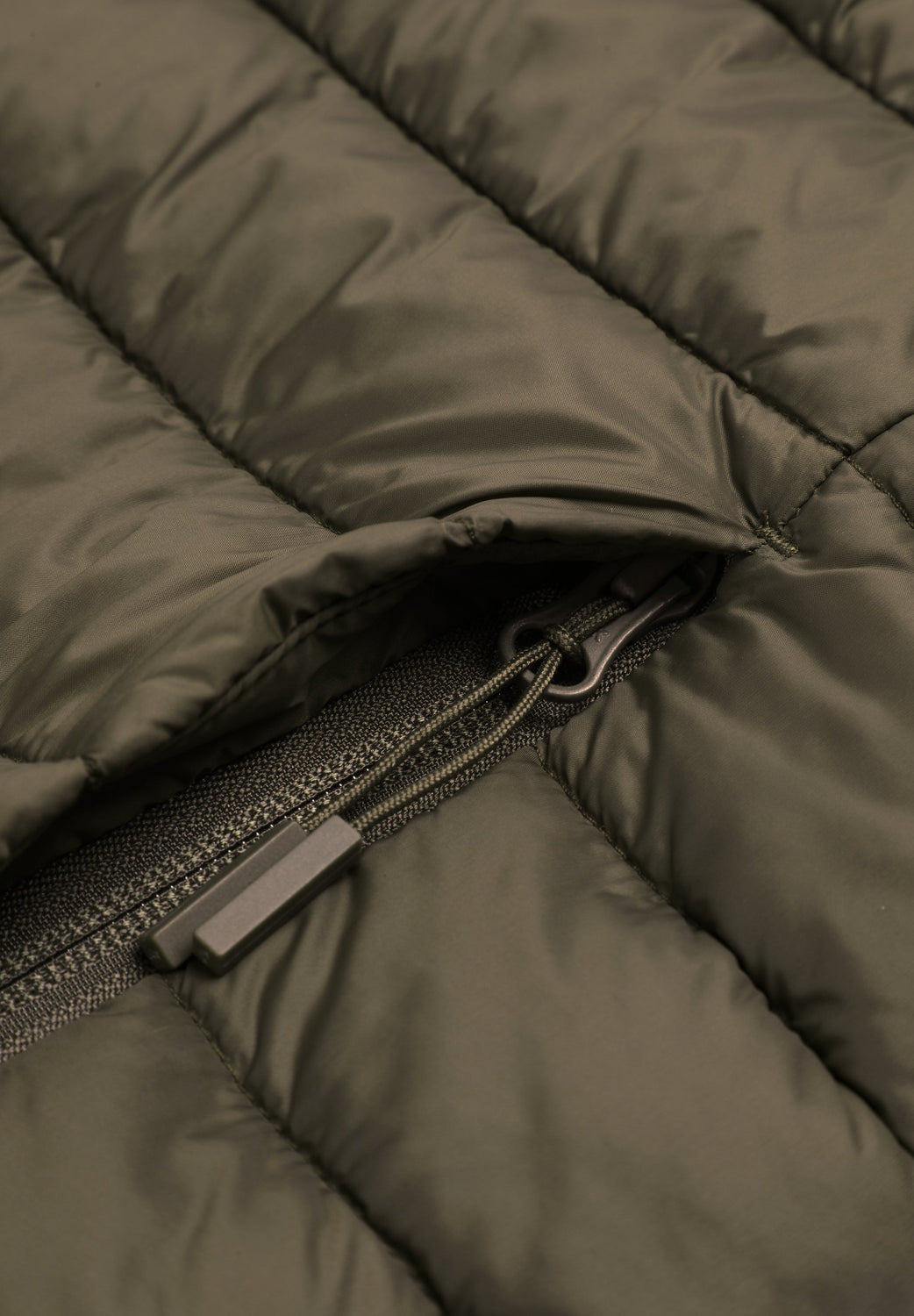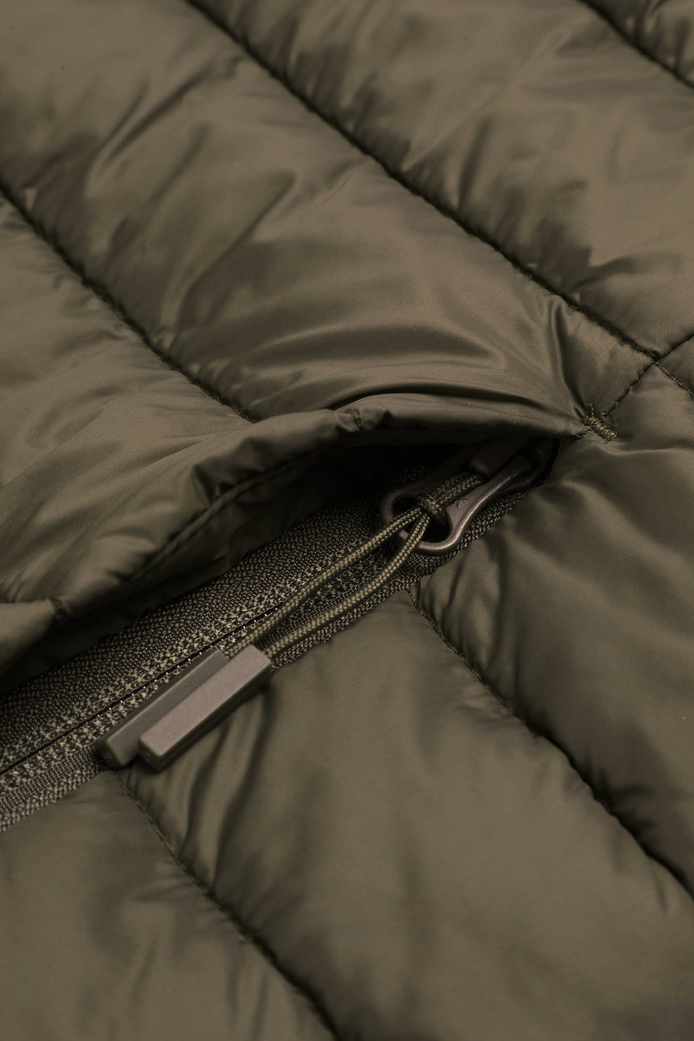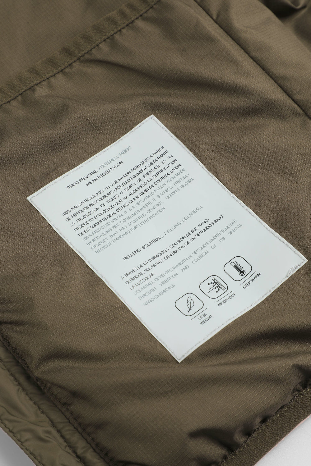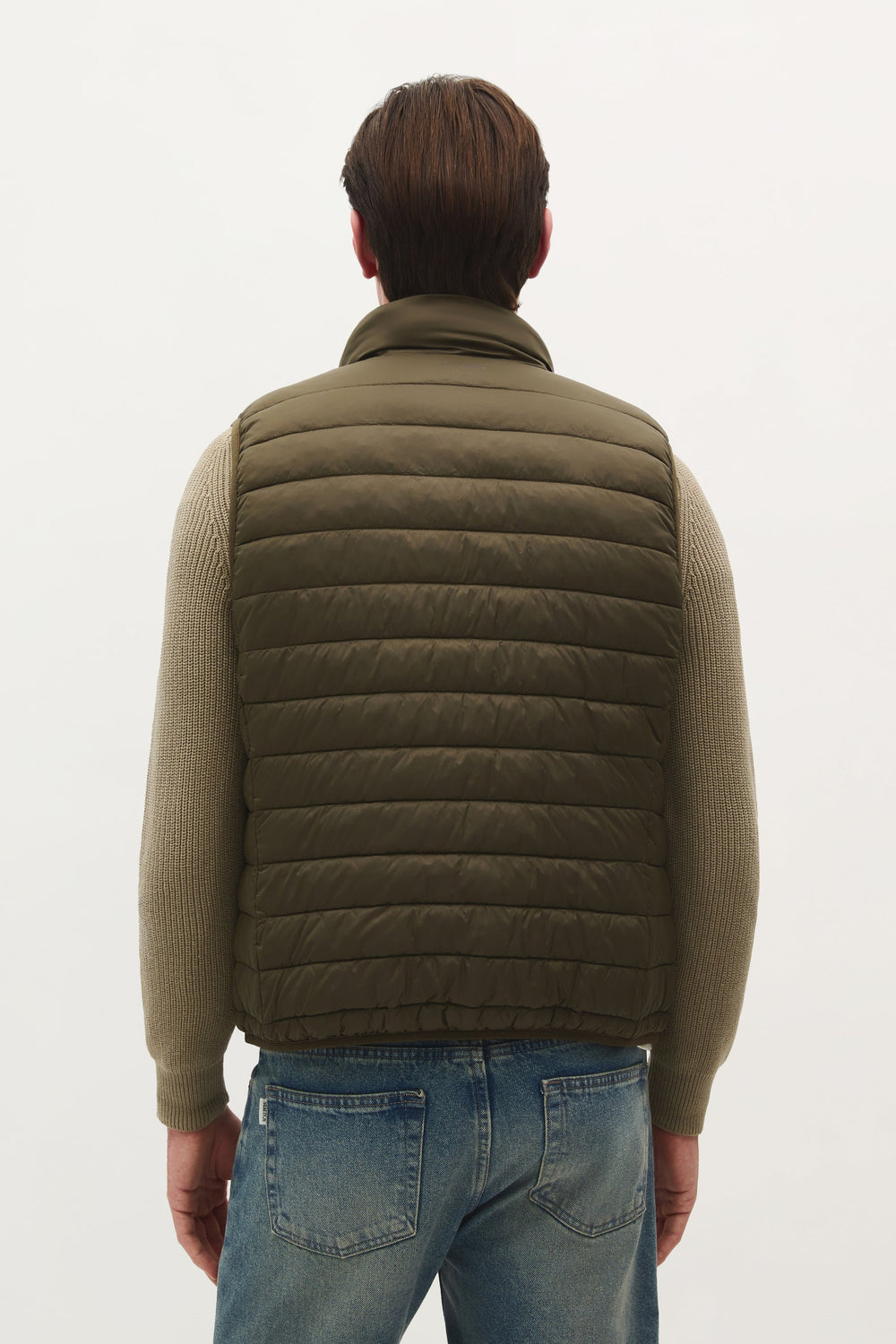 Chaleco acolchado confeccionado en tejido reciclado. Regular fit, cuello subido y cierre con cremallera de doble carro. Manga en sisa y bolsillos laterales con cremallera. Parche de calavera en pecho.